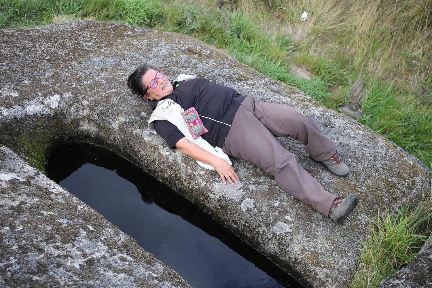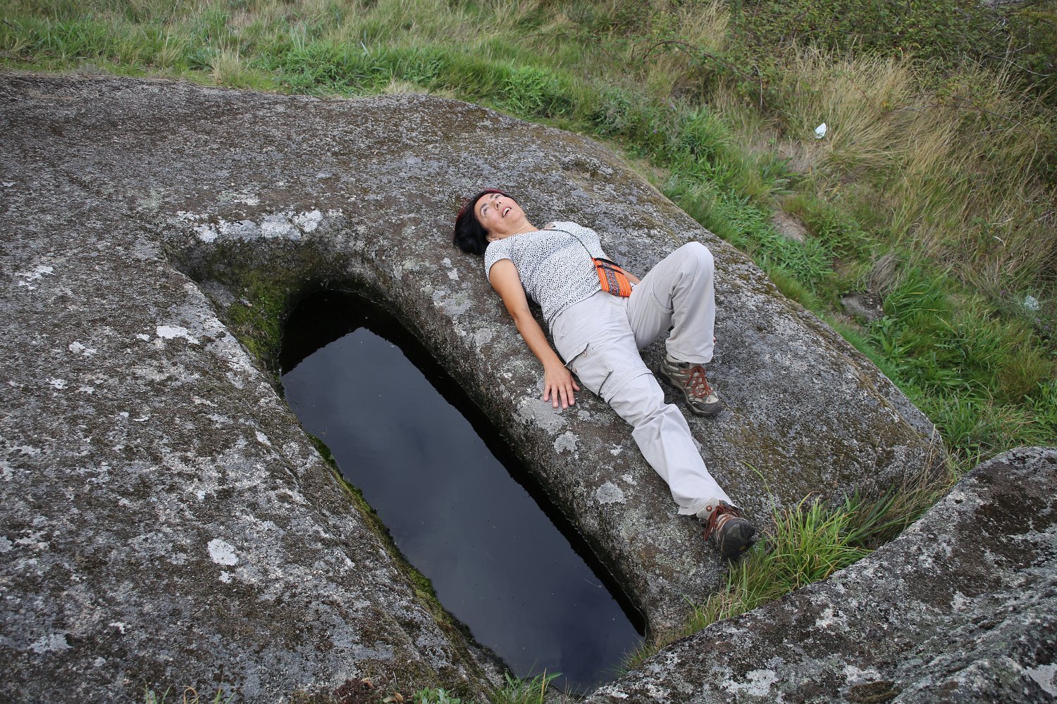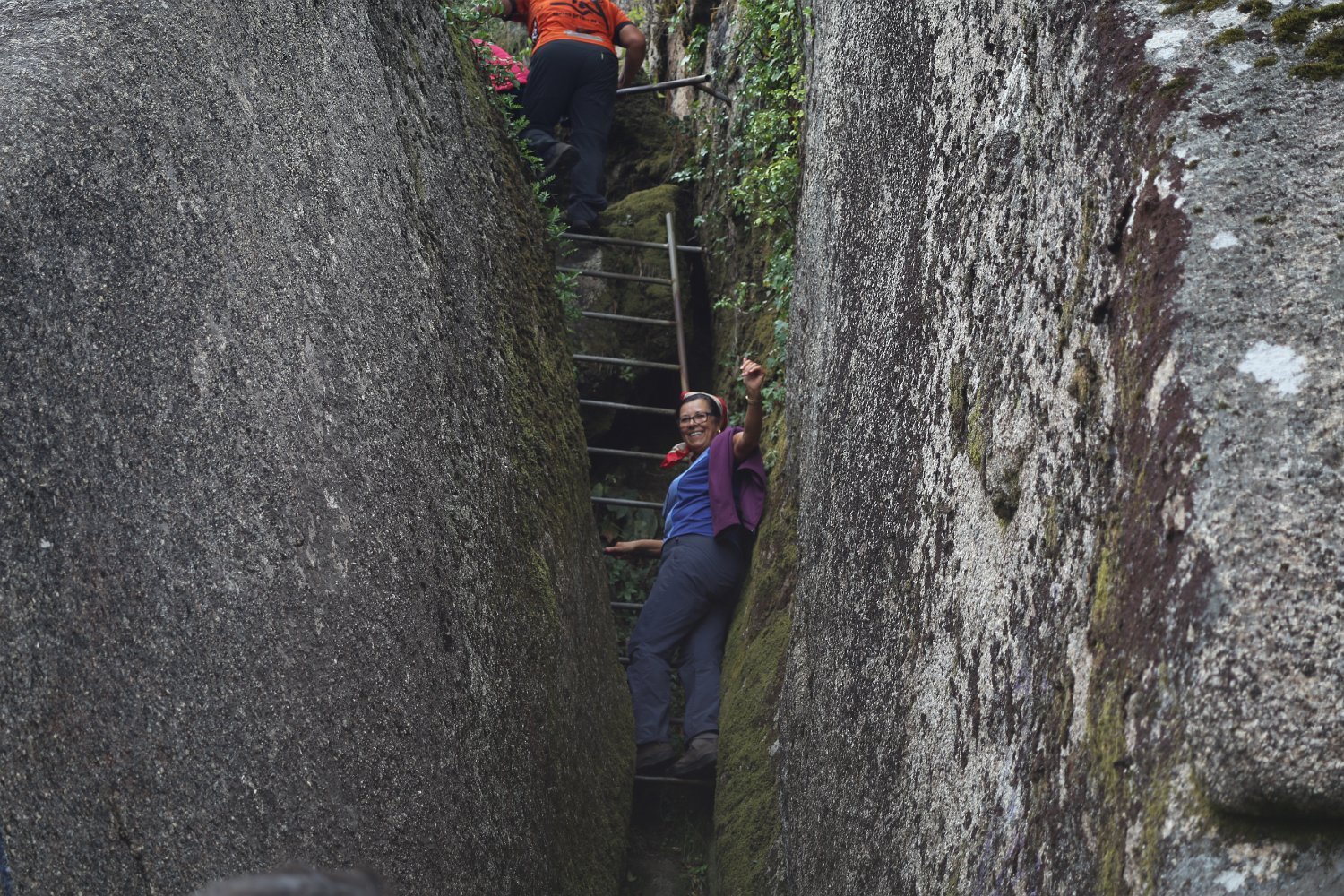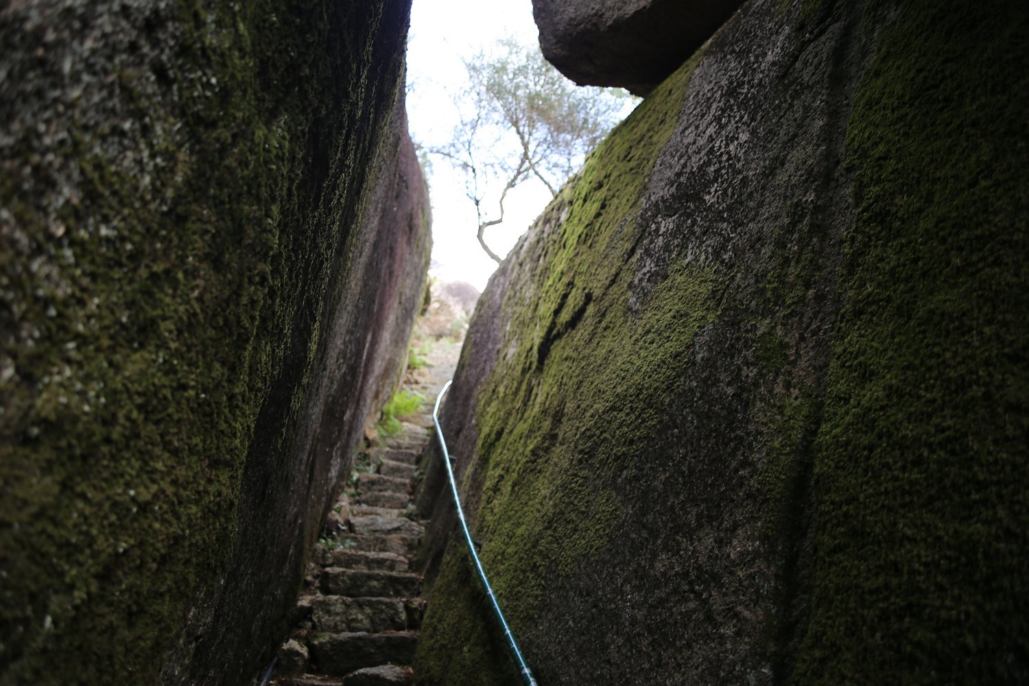 Mais um esforço para trepar as escadas cravadas na rocha e subimos até ao topo do afloramento rochoso para observar toda a paisagem circundante e também as “pias”, formações esculpidas no topo dos penedos, que teriam tido serventia na recolha da água das chuvas. O vento soprava forte e após curta observação e mais umas fotos regressamos à capela, onde nos esperavam os que se baldaram à derradeira subida.