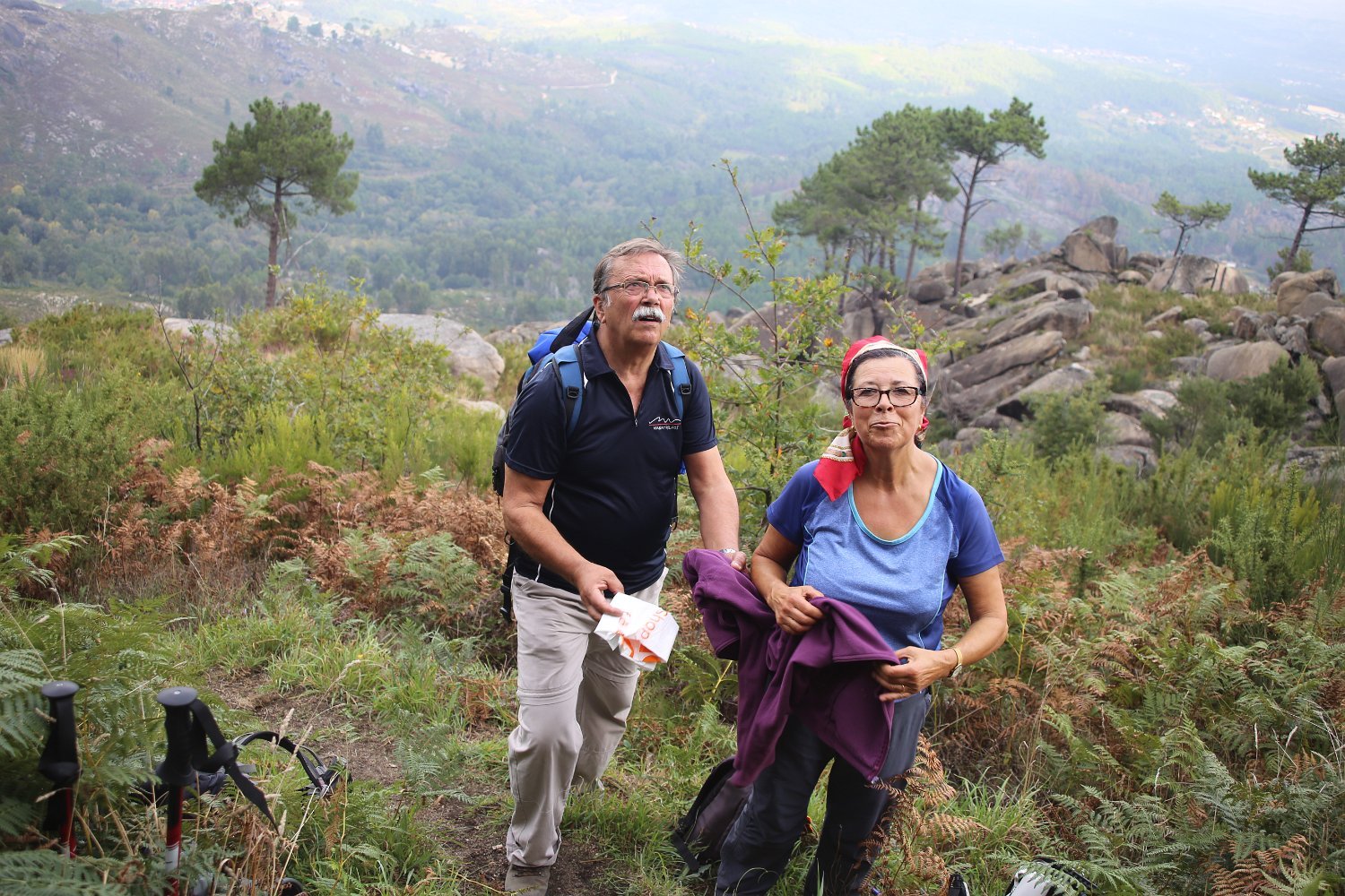 O arenito grosseiro do estreito carreiro esbroava com facilidade debaixo das nossas solas, impedindo uma progressão segura, o que complicava ainda mais a forte e prolongada subida até ao primeiro planalto, onde fizemos uma pausa para retemperar as energias perdidas e meter qualquer coisa à boca. Surgiram muitas vozes críticas sobre a anunciada classificação de moderada… que era afinal muito difícil… que assim não vinham mais… que mais valia ter ido por outro caminho! Mas, depois de descansar um pouco e apreciar a paisagem circundante com o alto de São Martinho ou Penha da Rainha a dominar a paisagem, lá se convenceram que afinal não tinha sido nada de mais, pelo que era tempo de continuar serra acima.