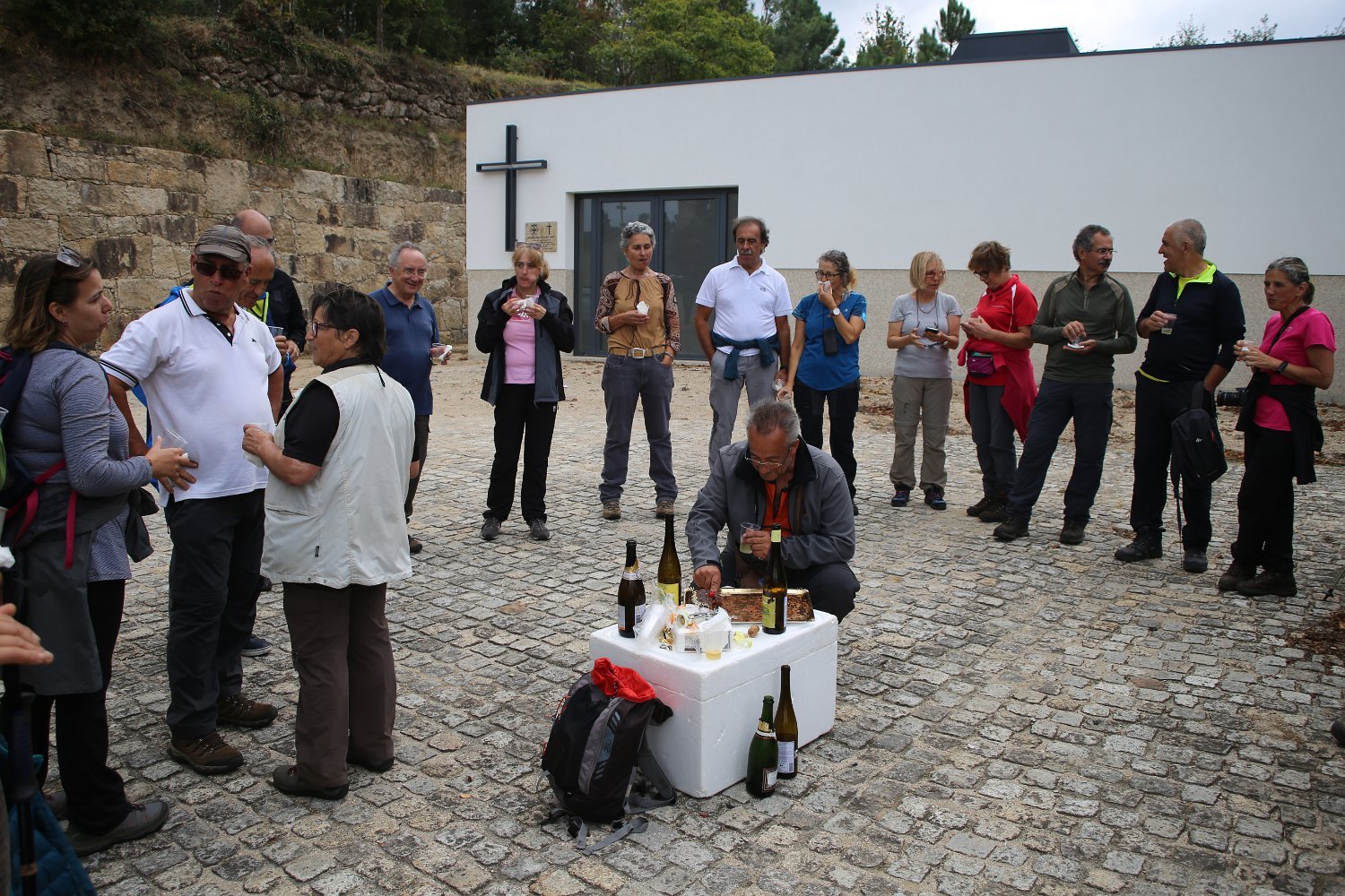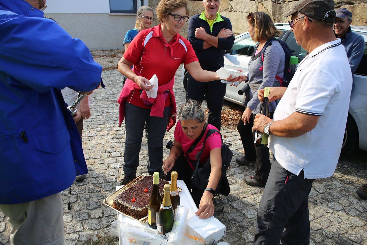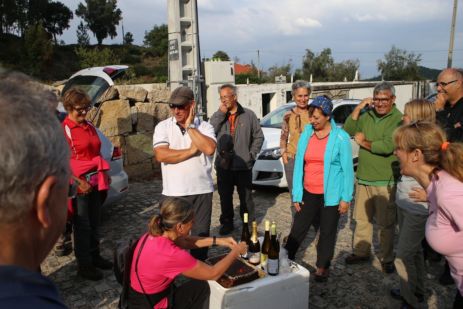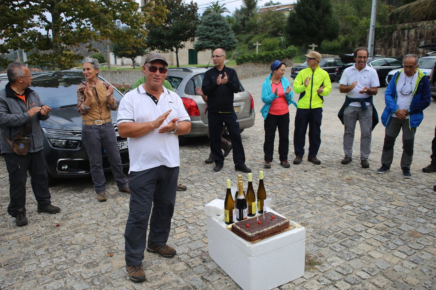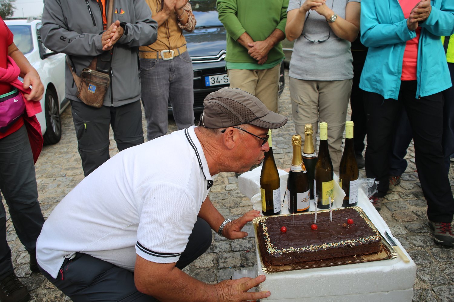 Cá fora esperava-nos uma surpresa, pois o aniversariante Joaquim Abreu montou uma banca defronte do cemitério, com bolo de aniversário, vinho e espumante para mais uma celebração entre todos. Mais cantoria para o “apaga as velas” com belos momentos de camaradagem que continuaram depois em Dém no Café Capela, em que o “Cocas” não quis ficar atrás e também nos brindou com outro bolo de aniversário, regado com espumante.