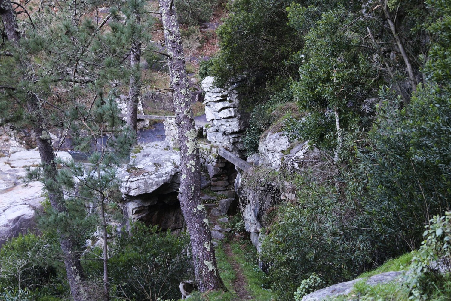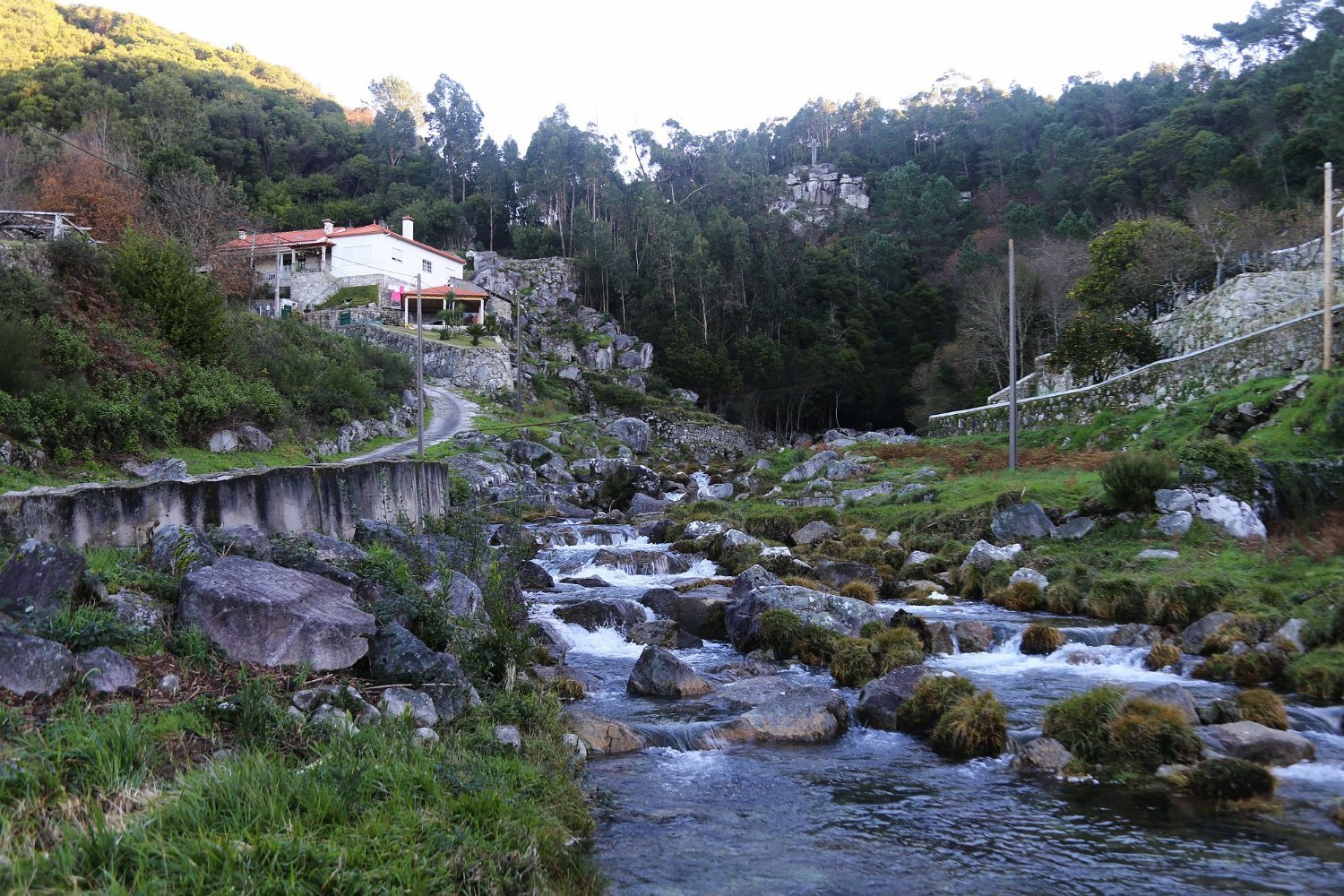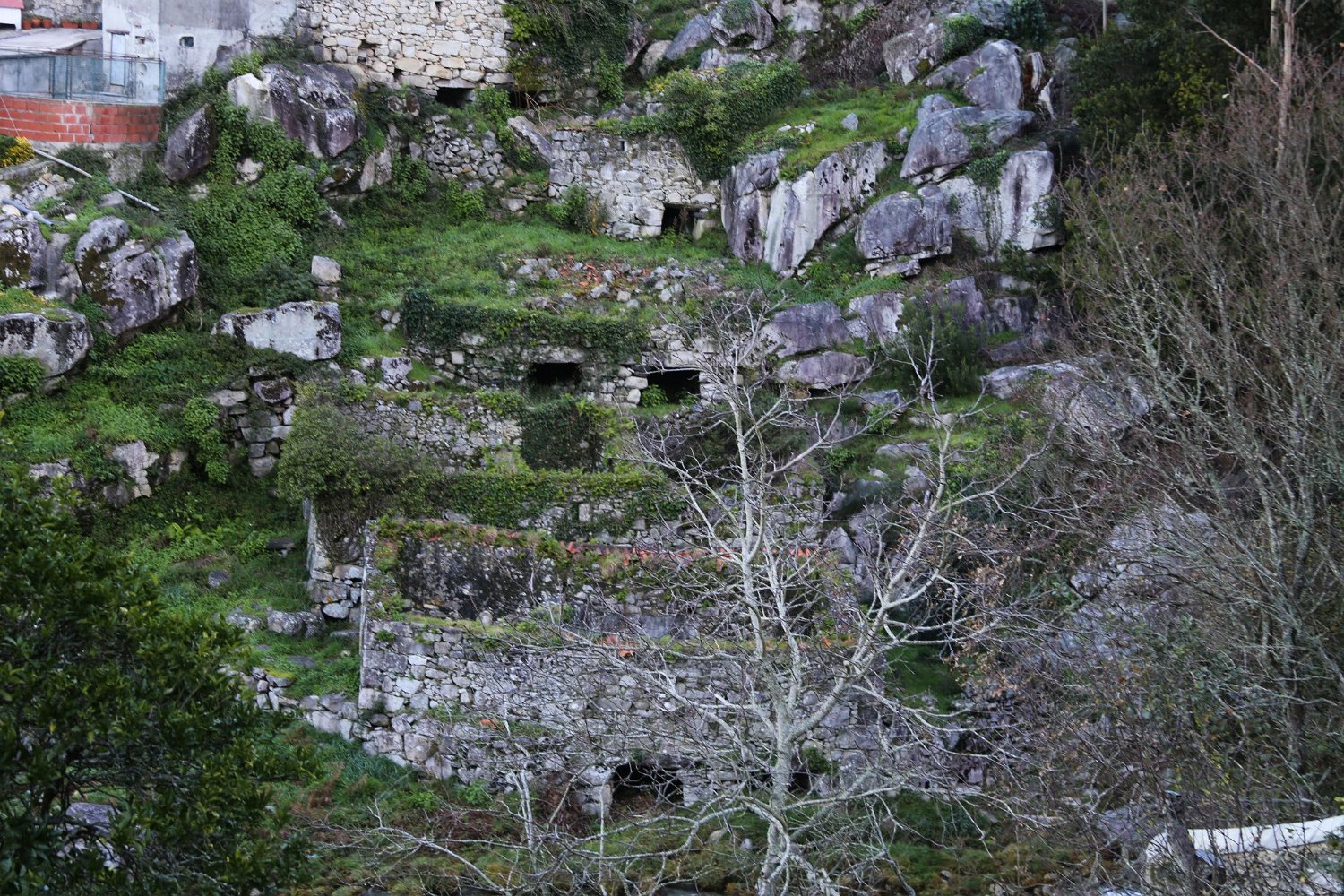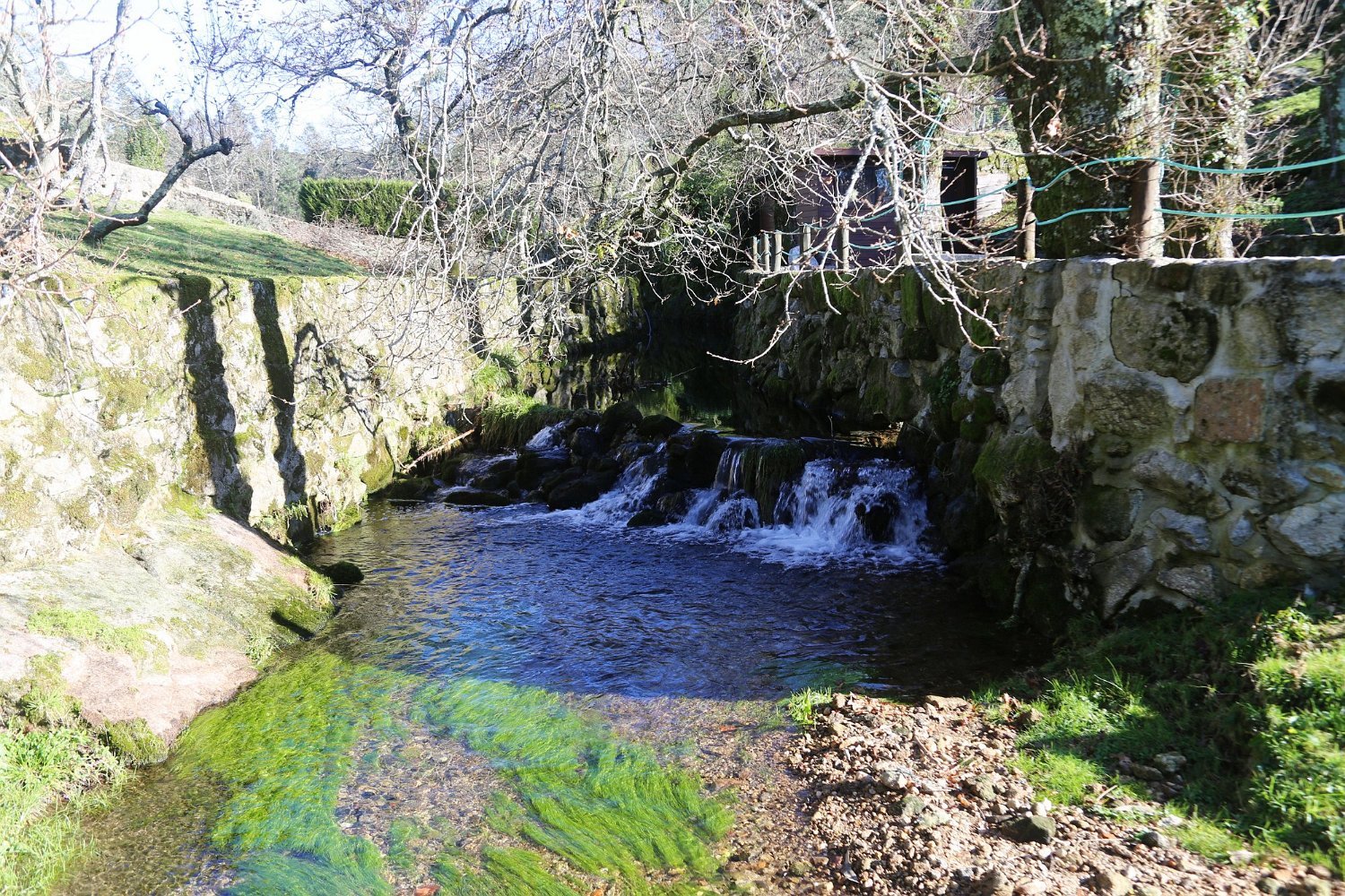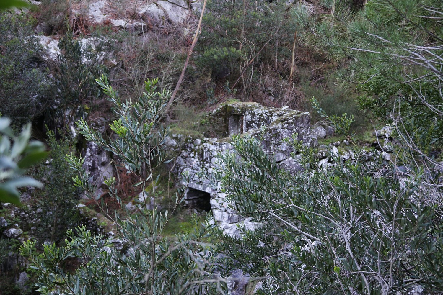Começamos a subida do ribeiro do Pego, que atravessamos junto a importante conjunto de moinhos, uns em completa ruína perdidos no meio da vegetação, outros transformados em habitações, outros mais ou menos conservados.