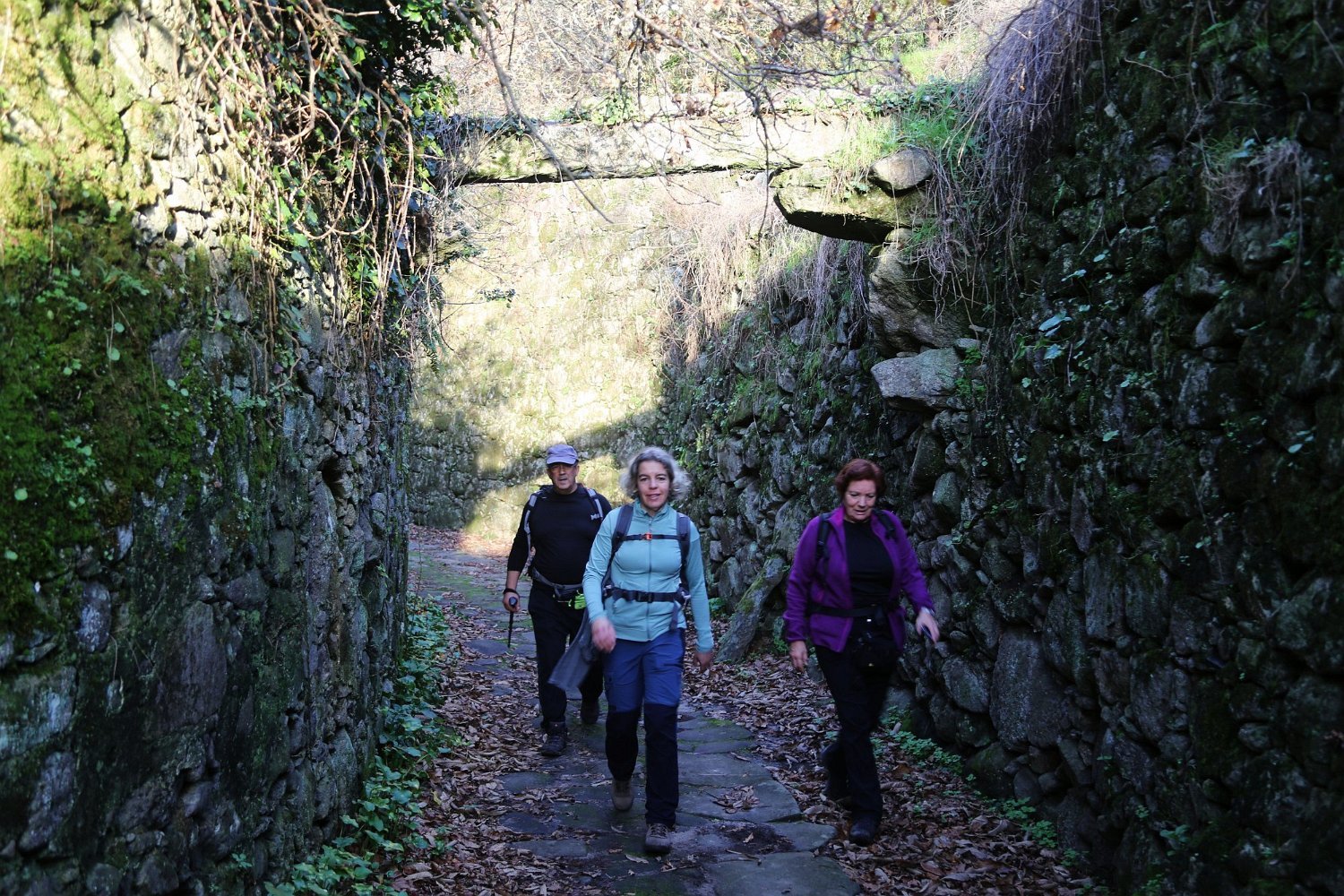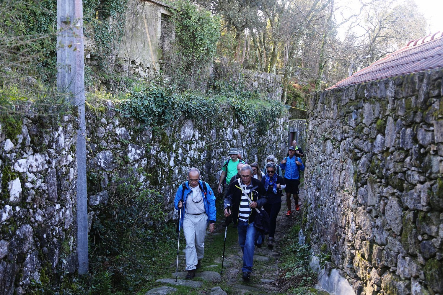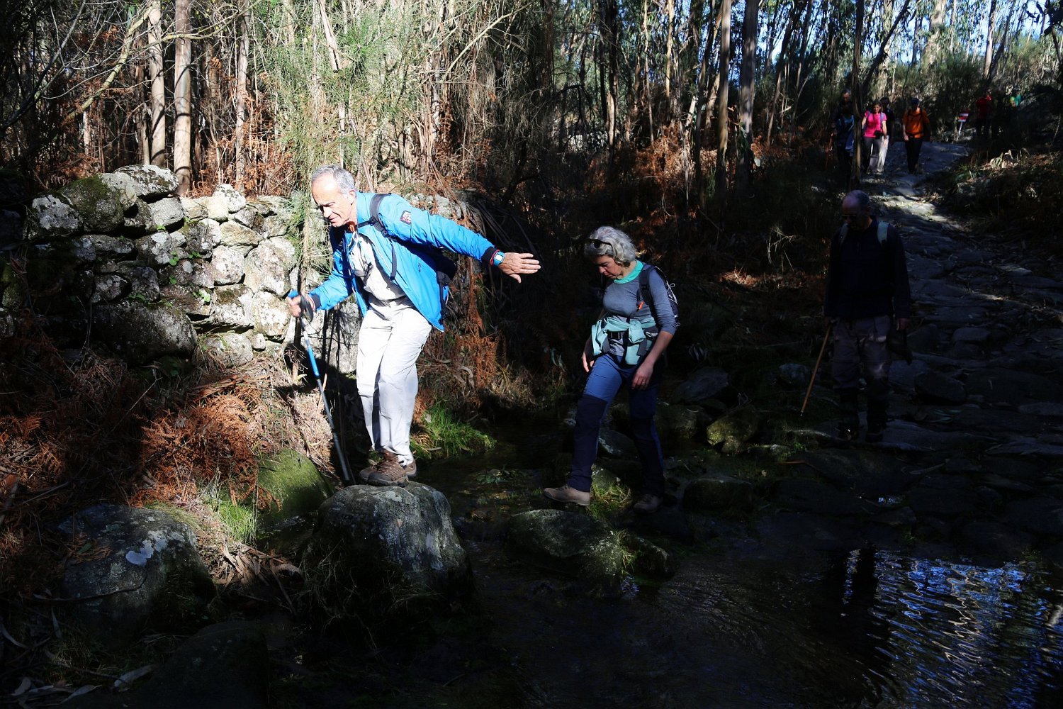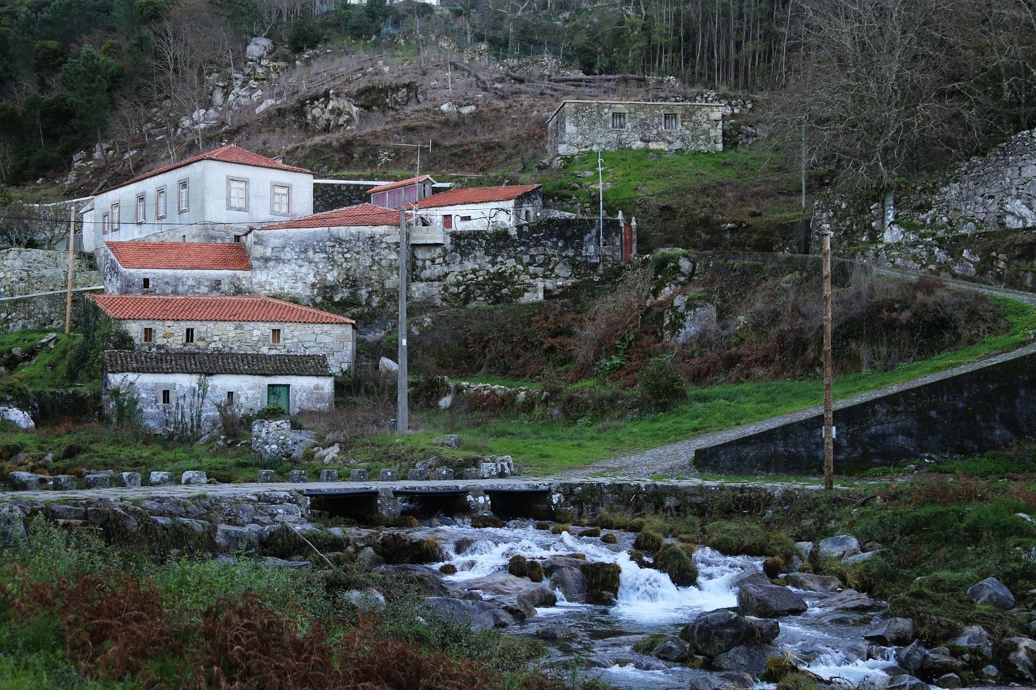 Começamos a subida do ribeiro do Pego, que atravessamos junto a importante conjunto de moinhos, uns em completa ruína perdidos no meio da vegetação, outros transformados em habitações, outros mais ou menos conservados.