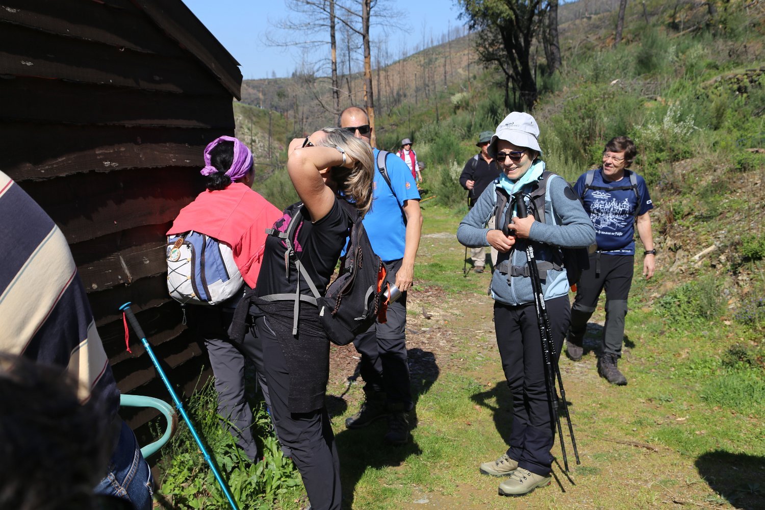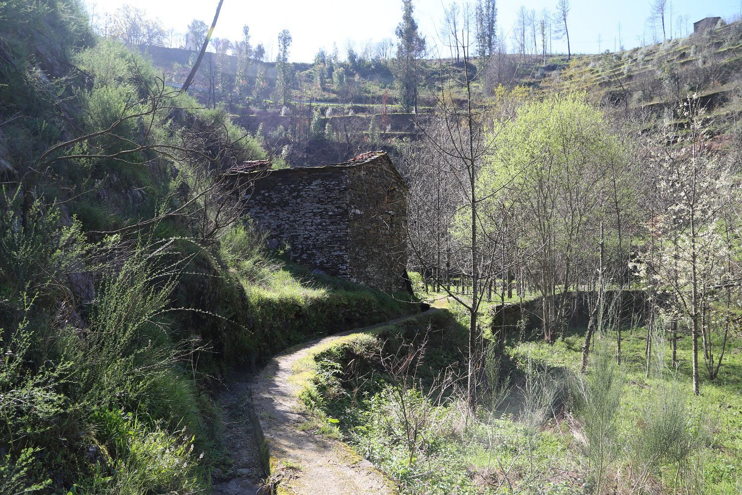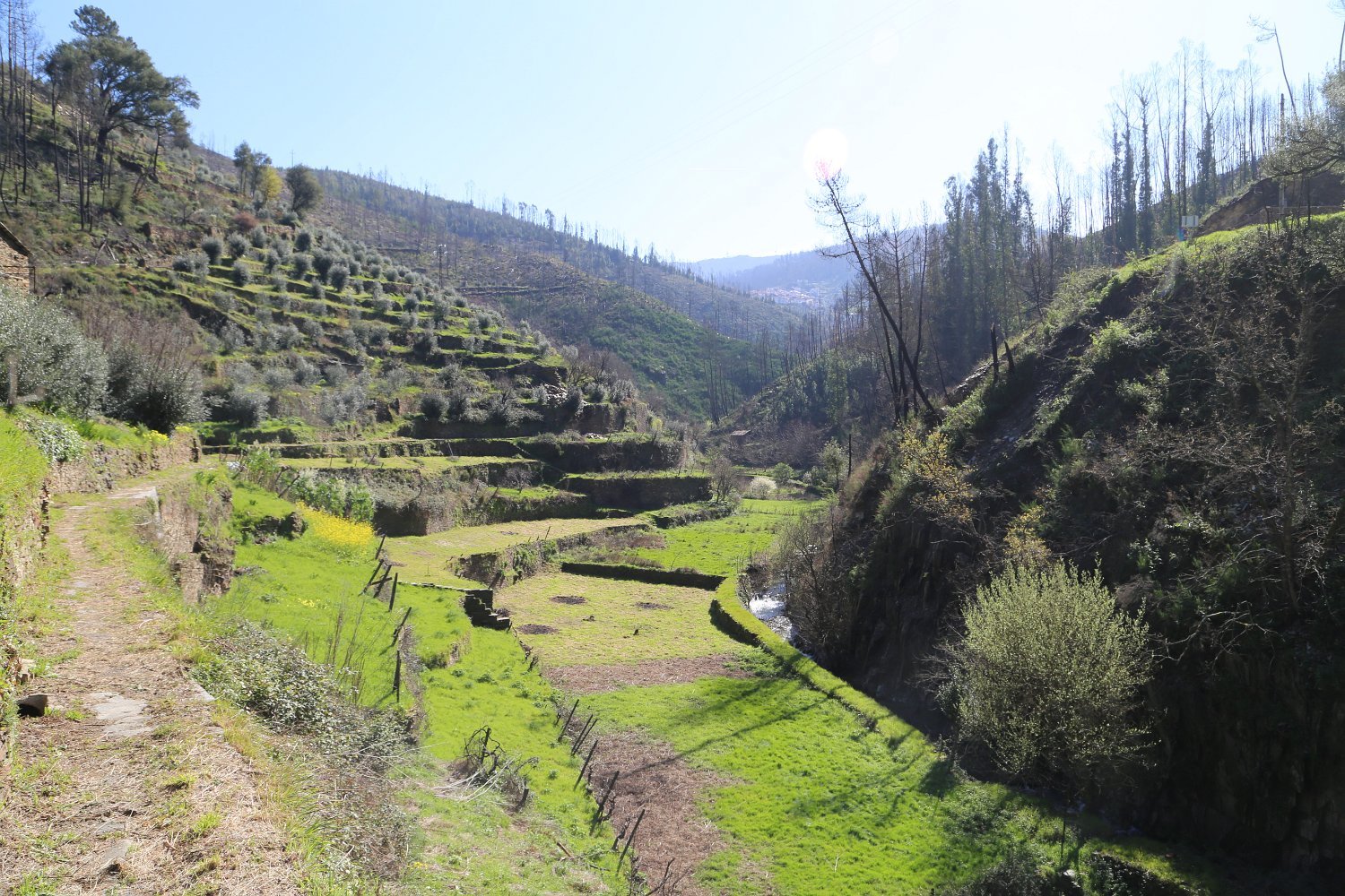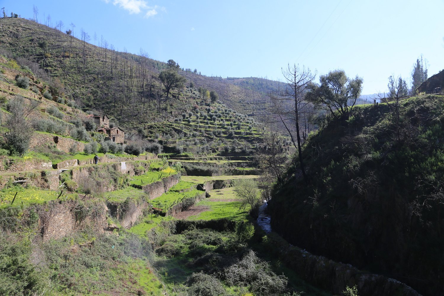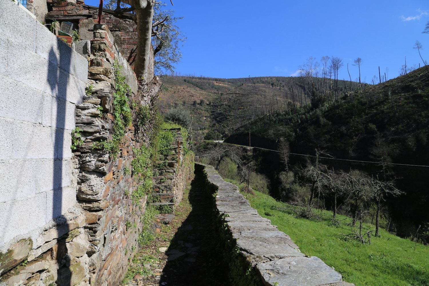 Deixamos para trás a aldeia de Benfeita e começamos a subir a margem direita da ribeira da Mata usando o Caminho de Xisto, estreito trilho que delimita antigos campos agrícolas, seguindo as curvas do rio, que aqui corre agitado apertado nas suas margens.