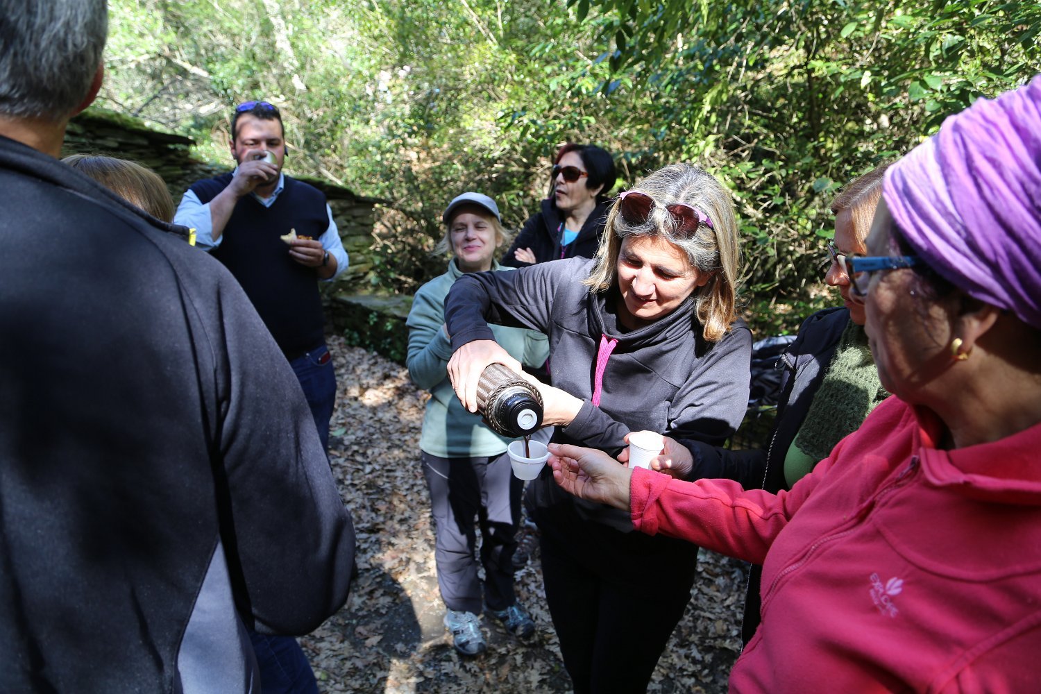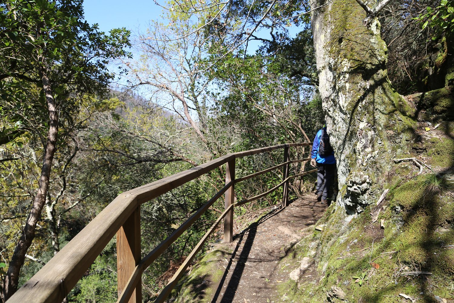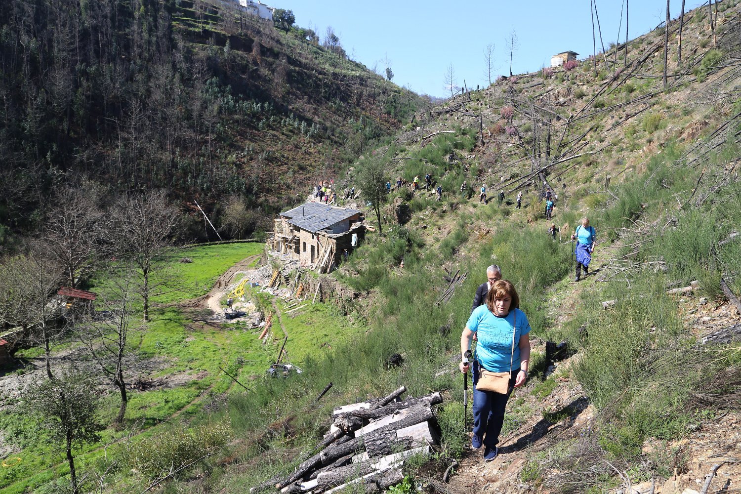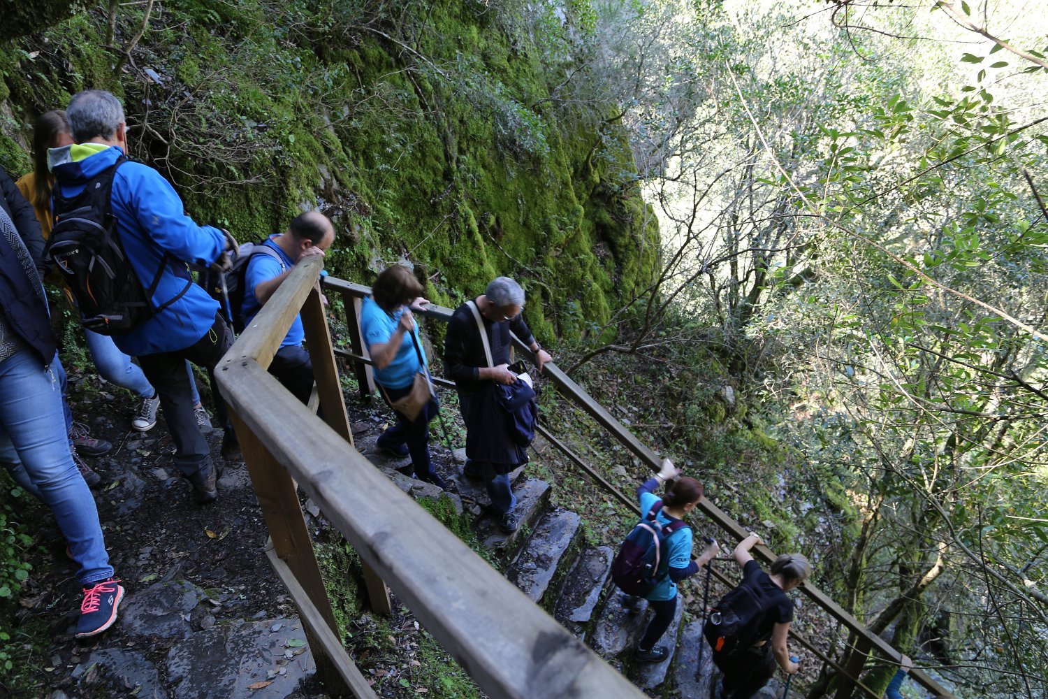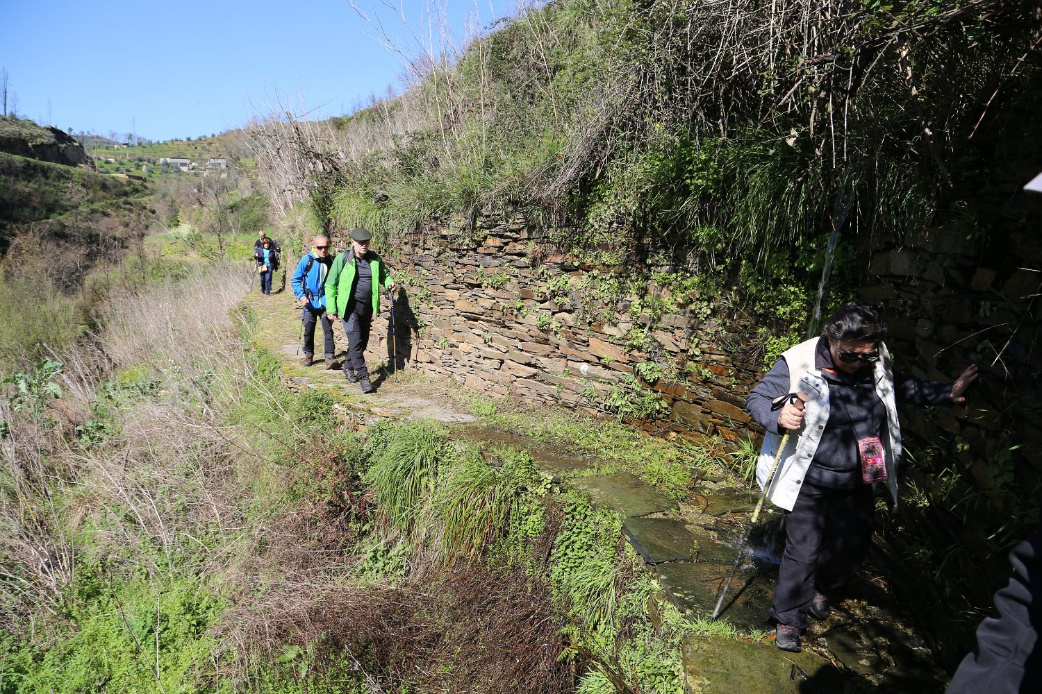 Deixamos para trás a aldeia de Benfeita e começamos a subir a margem direita da ribeira da Mata usando o Caminho de Xisto, estreito trilho que delimita antigos campos agrícolas, seguindo as curvas do rio, que aqui corre agitado apertado nas suas margens.