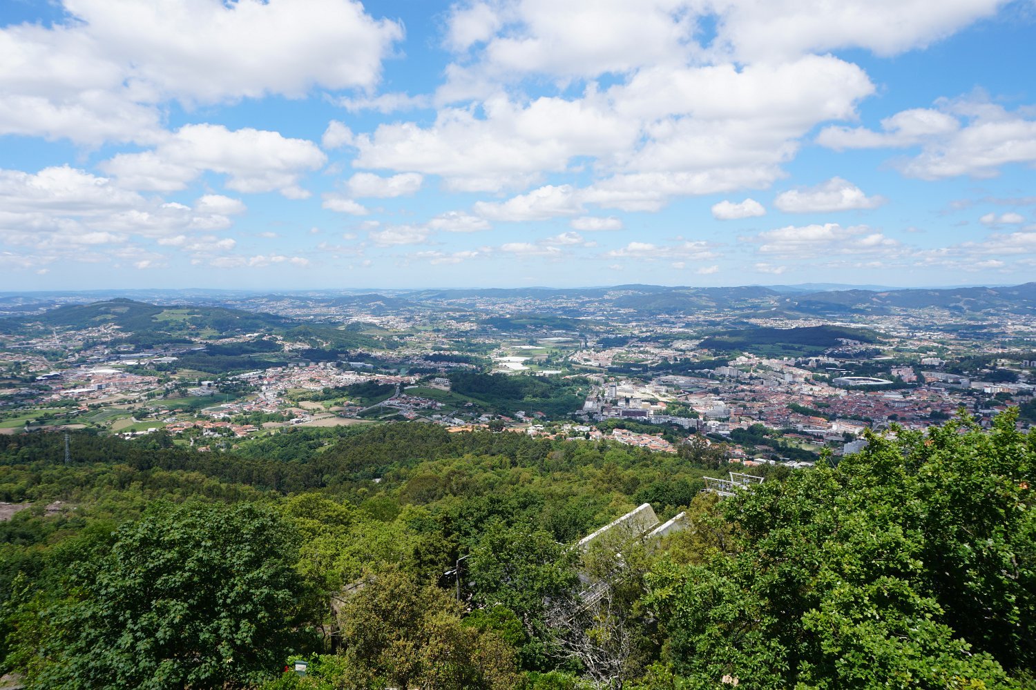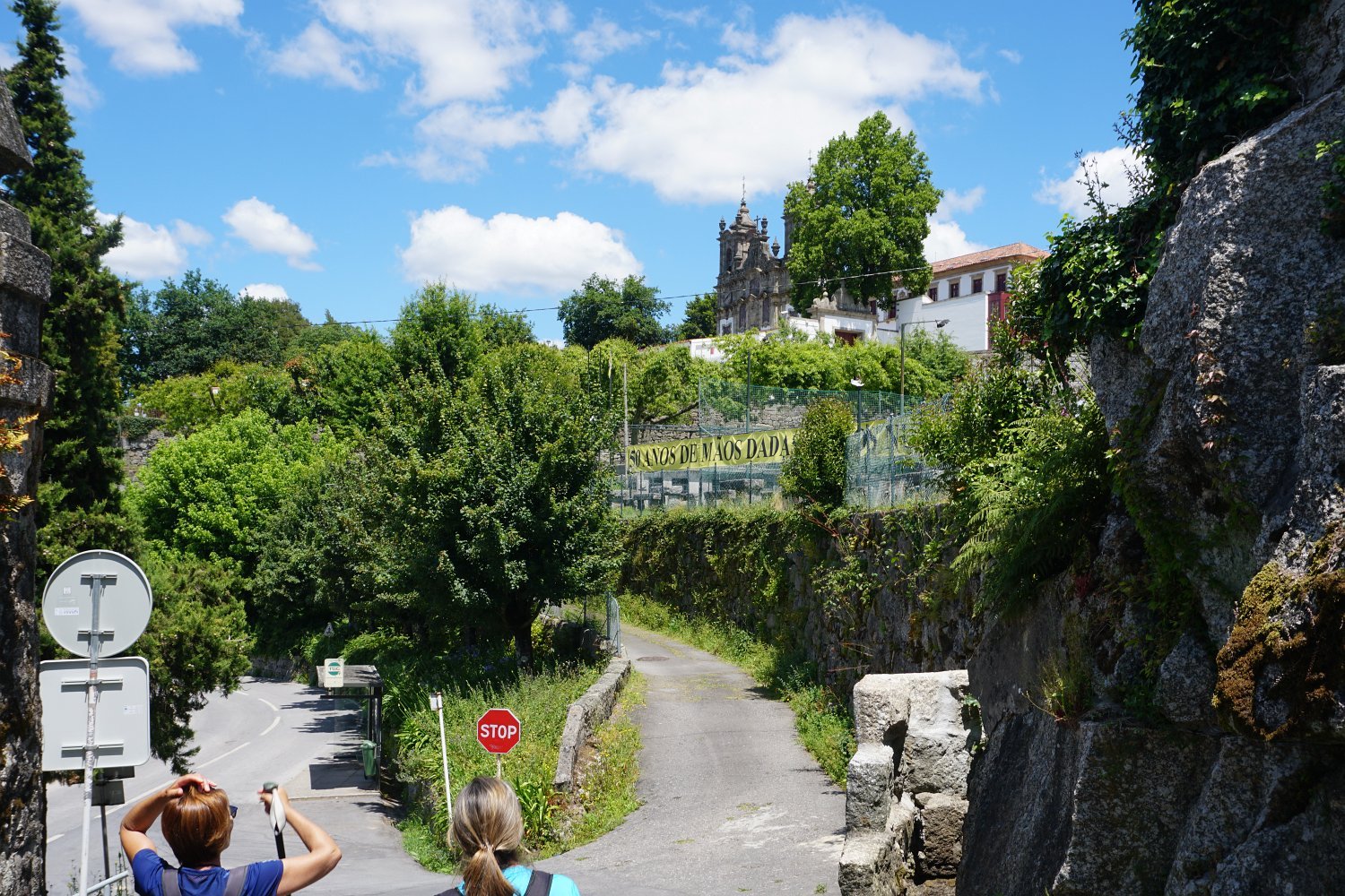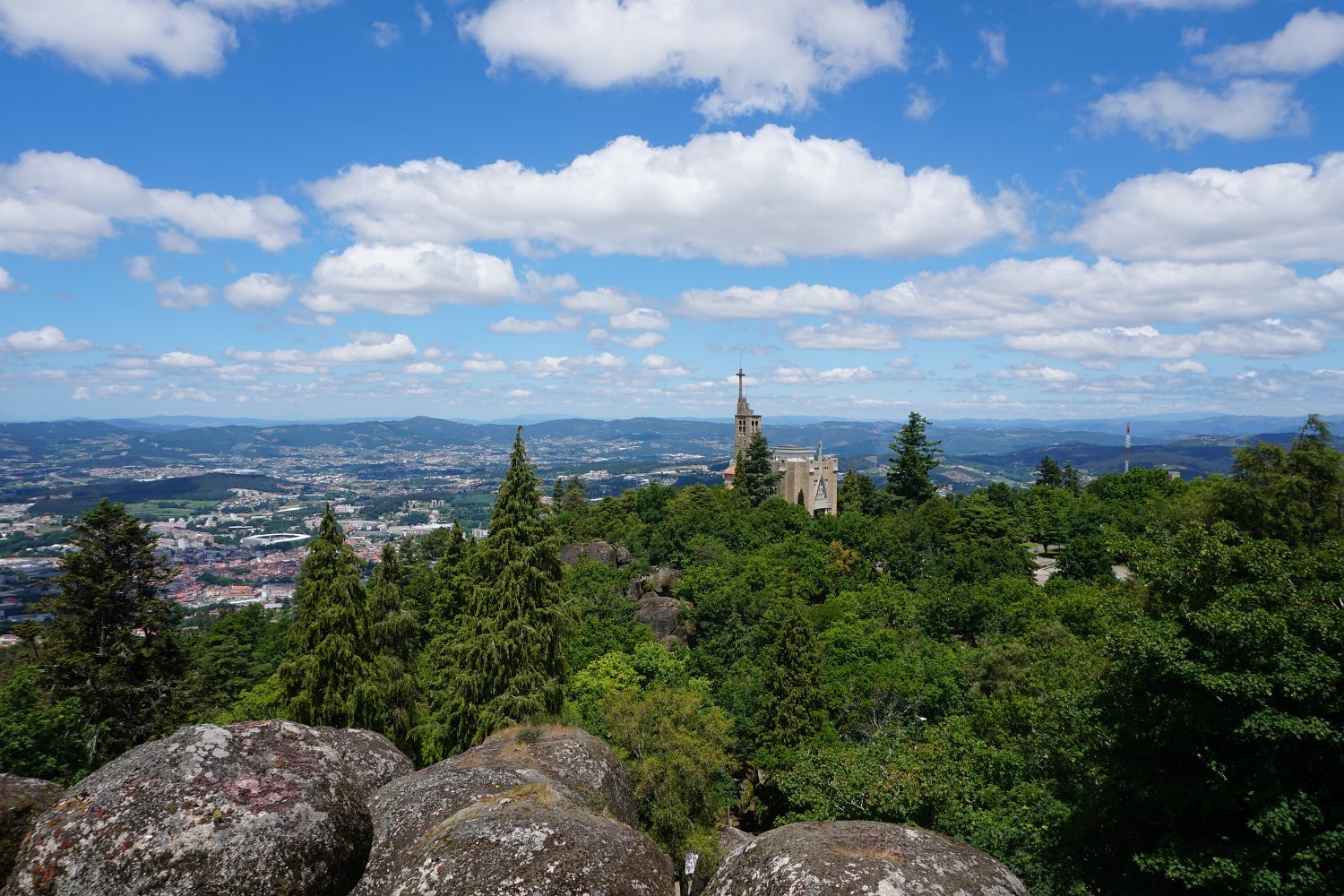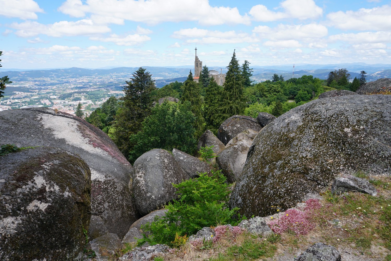 Chegados ao largo do Santuário de Nossa Senhora do Carmo da Penha, também chamado de Santuário de Nossa Senhora da Penha, reunimo-nos com os quatro companheiros que preferiram fazer a subida pelo teleférico e fomos ver Guimarães “por um canudo”, já que na parte traseira do templo há um miradouro com vista deslumbrante para a cidade.