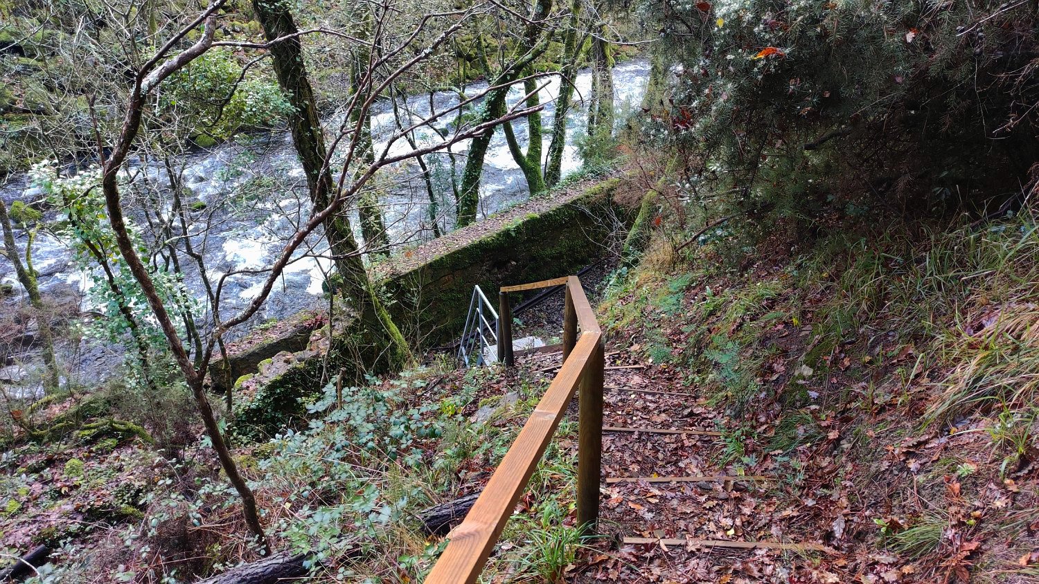 Depois de observar a barragem, continuamos a descer o Coura junto e dentro do aqueduto que serviu para a alimentação das turbinas da extinta central de Covas. Este troço do percurso é especialmente interessante, pois tem uma vista excelente para as águas tumultuosas do Coura, que nesta zona desce vertiginosamente uma estreita garganta, por entre enormes pedregulhos, num contínuo estrondo.