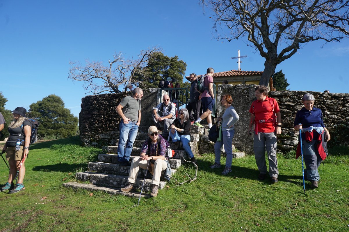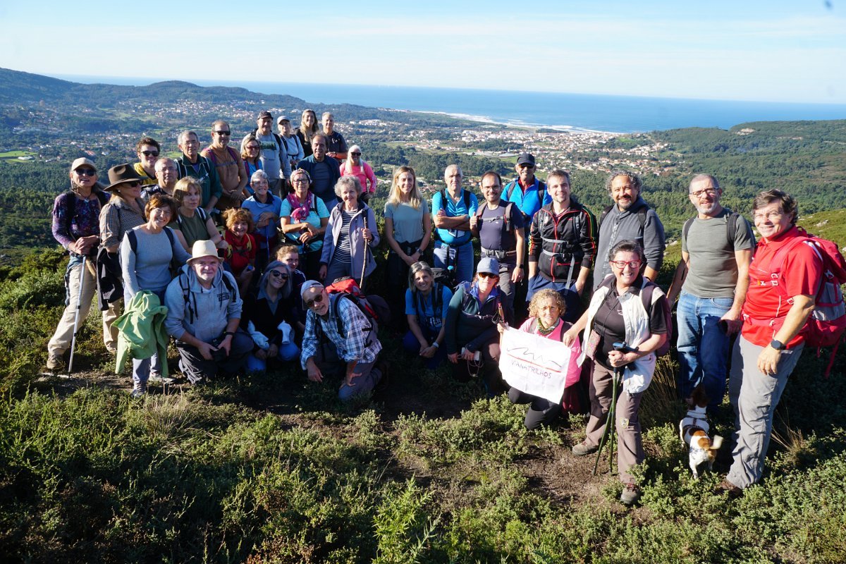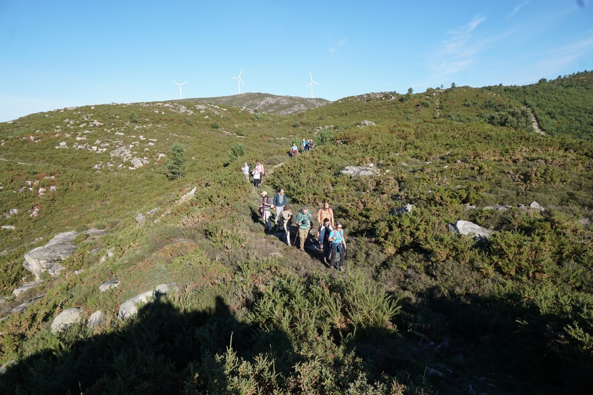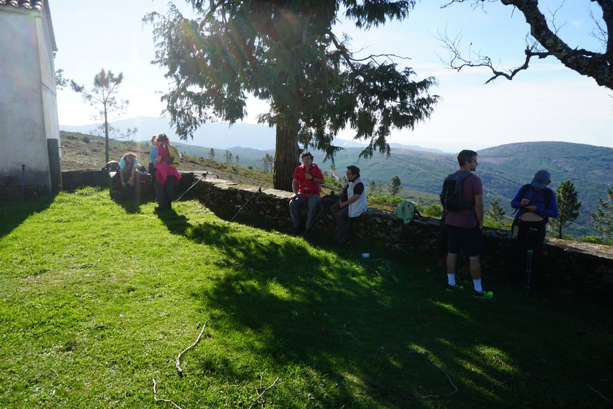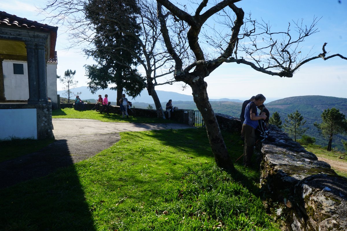 Depois de reagrupar iniciamos a subida para o miradouro da Senhora das Neves, já na freguesia de Dem, onde chegamos por volta das 12:15, momento de pausa para meter mais qualquer coisa à boca e tirar as fotos da praxe, tanto de grupo como das vistas deslumbrantes para a foz do Minho com Caminha e as freguesias de Vilar de Mouros, Argela, Venade, Vilarelho e o Monte de Santo Antão, bem como as terras da vizinha Galiza, com o monte de Santa Tecla (ou Tegra) a dominar a paisagem.