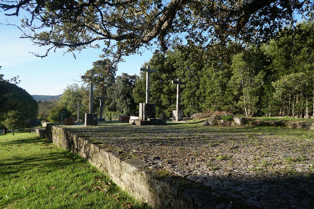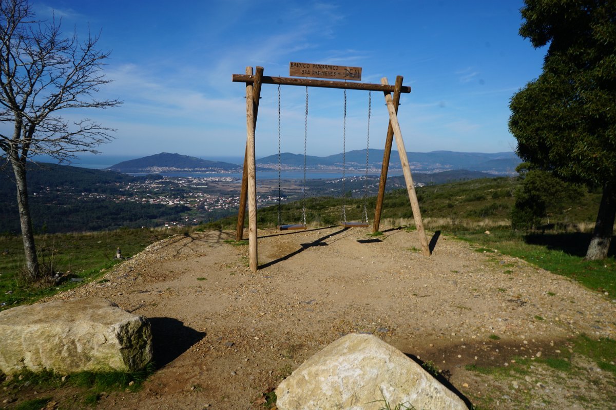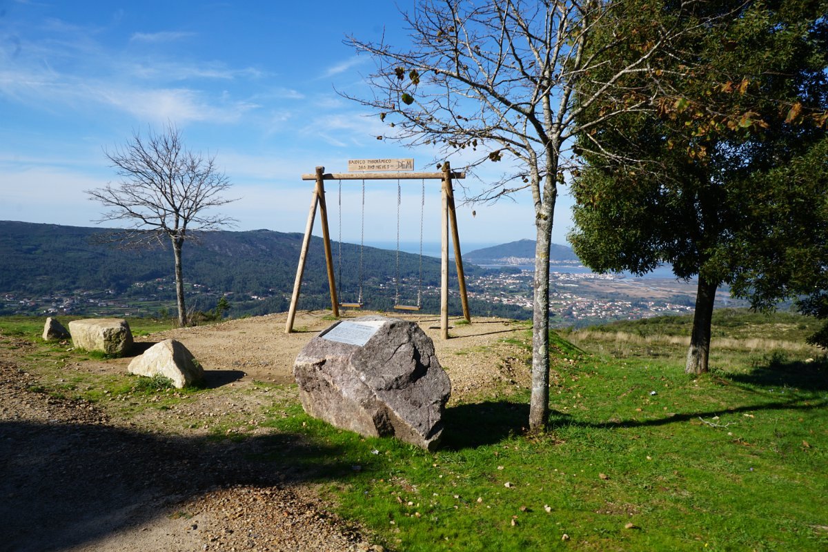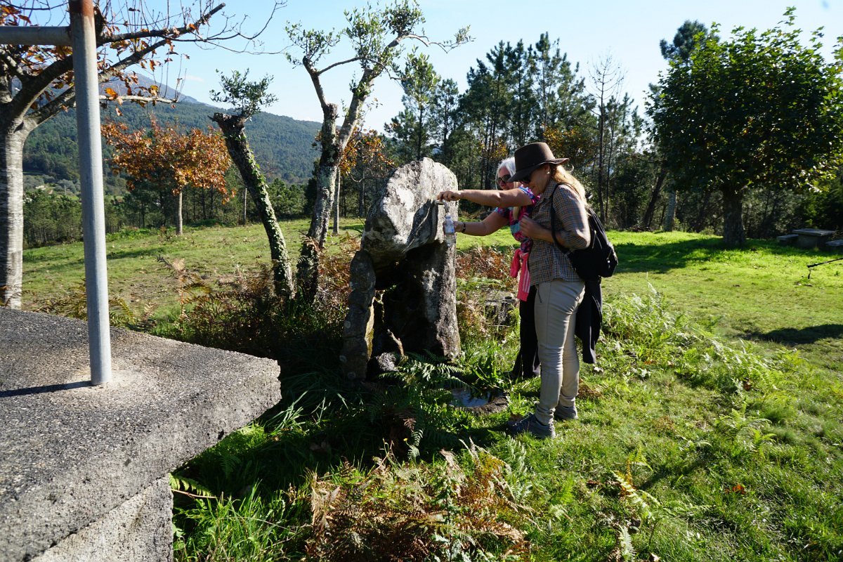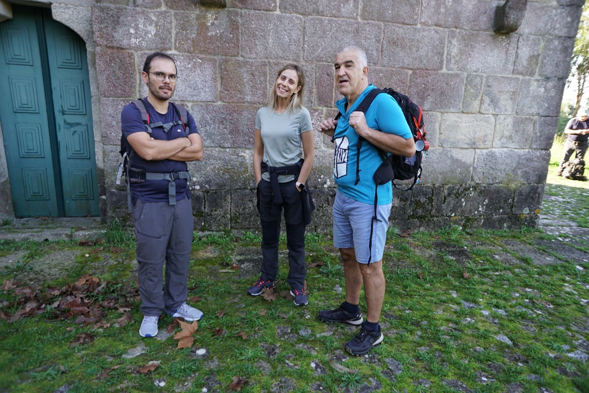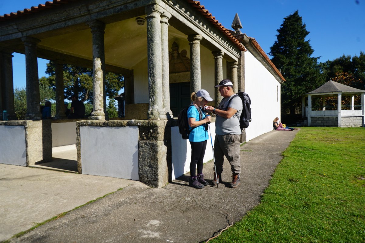 Depois de reagrupar iniciamos a subida para o miradouro da Senhora das Neves, já na freguesia de Dem, onde chegamos por volta das 12:15, momento de pausa para meter mais qualquer coisa à boca e tirar as fotos da praxe, tanto de grupo como das vistas deslumbrantes para a foz do Minho com Caminha e as freguesias de Vilar de Mouros, Argela, Venade, Vilarelho e o Monte de Santo Antão, bem como as terras da vizinha Galiza, com o monte de Santa Tecla (ou Tegra) a dominar a paisagem.