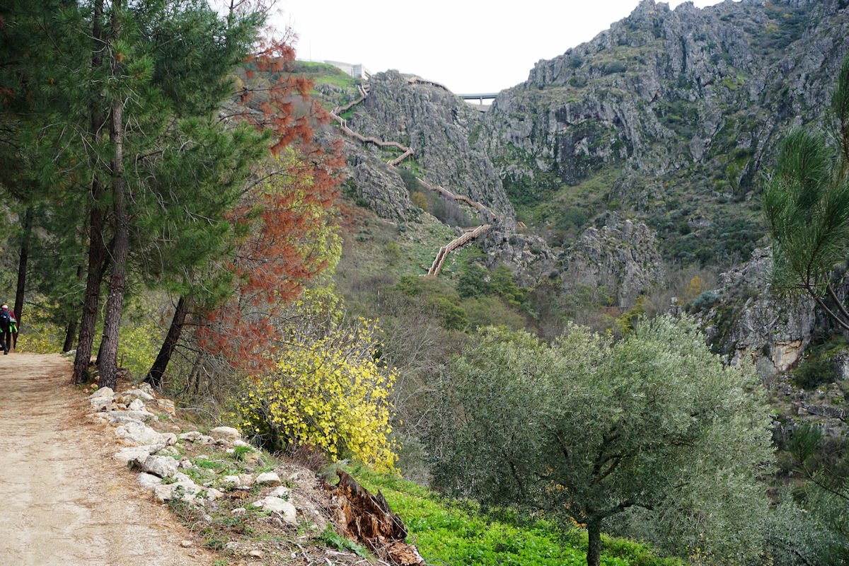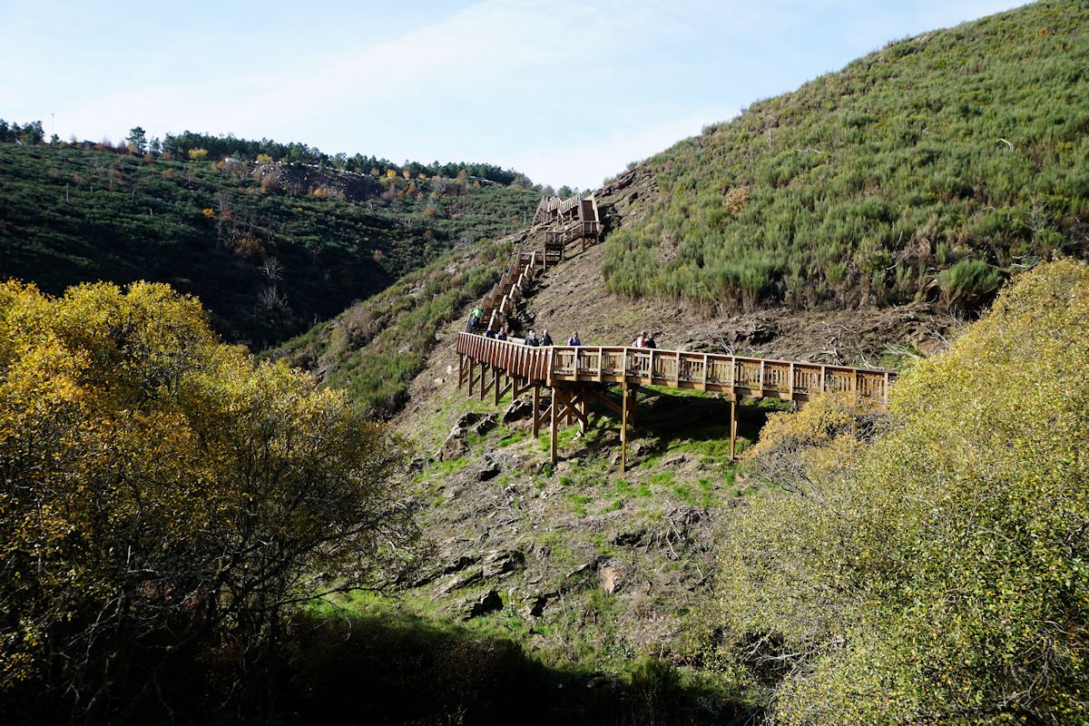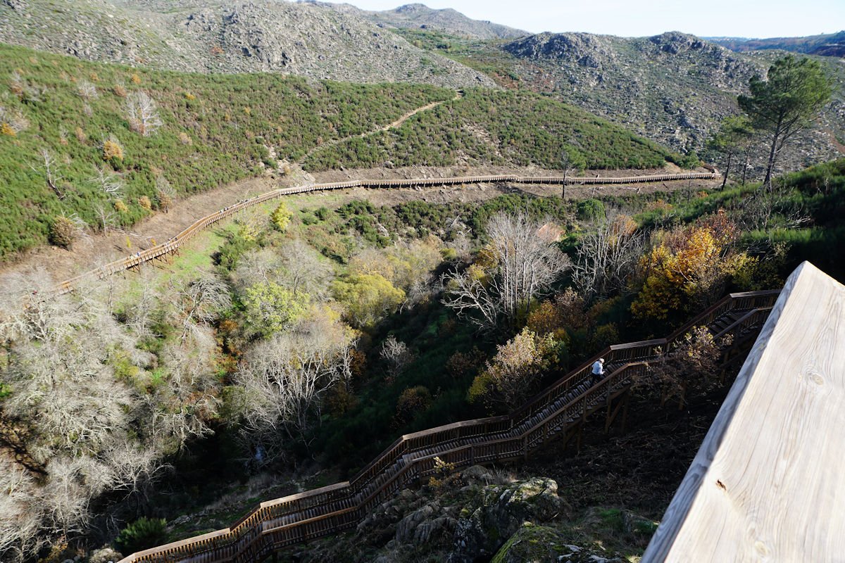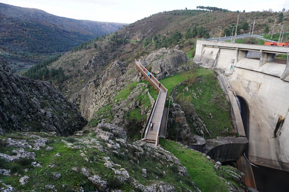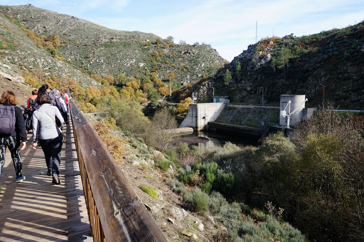 Fomos descendo o vale escarpado do Mondego, passamos defronte do túnel de captação de água da barragem do Caldeirão e um pouco adiante termina este troço de passadiços, tendo cruzado o Mondego por uma ponte suspensa para a sua margem direita. A partir da tomada de água da barragem, o coitado do Mondego quase desaparece e, este que é o maior rio de Portugal, fica reduzido a um ténue fio de água que corre discretamente por entre as pedras nuas do seu leito.