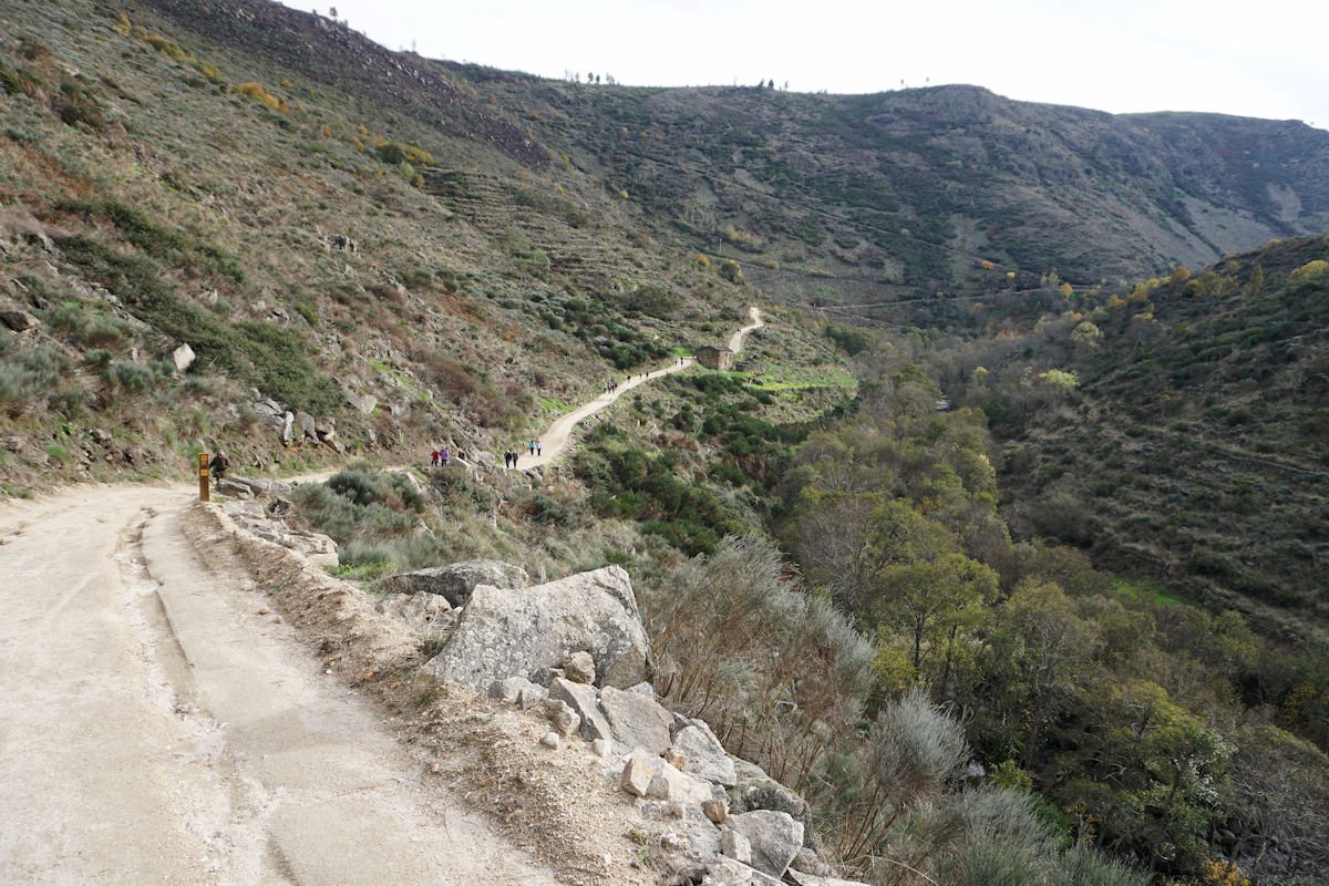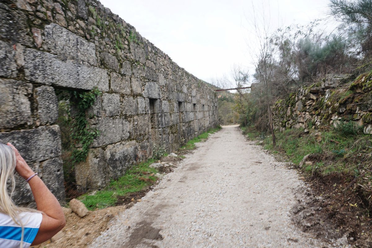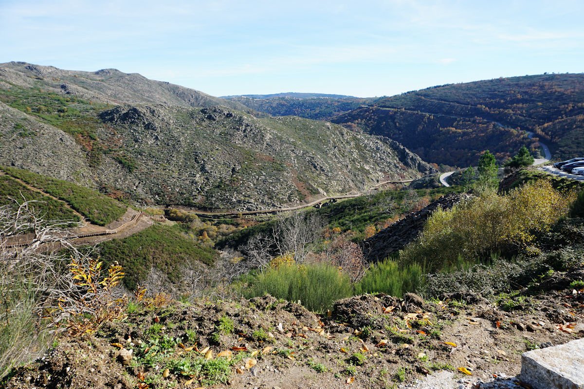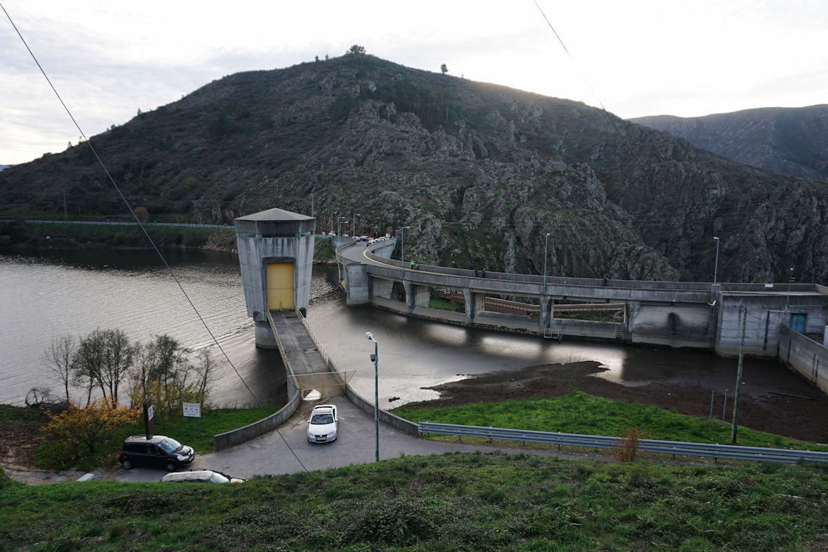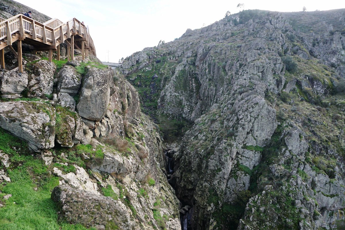 Fomos descendo o vale escarpado do Mondego, passamos defronte do túnel de captação de água da barragem do Caldeirão e um pouco adiante termina este troço de passadiços, tendo cruzado o Mondego por uma ponte suspensa para a sua margem direita. A partir da tomada de água da barragem, o coitado do Mondego quase desaparece e, este que é o maior rio de Portugal, fica reduzido a um ténue fio de água que corre discretamente por entre as pedras nuas do seu leito.