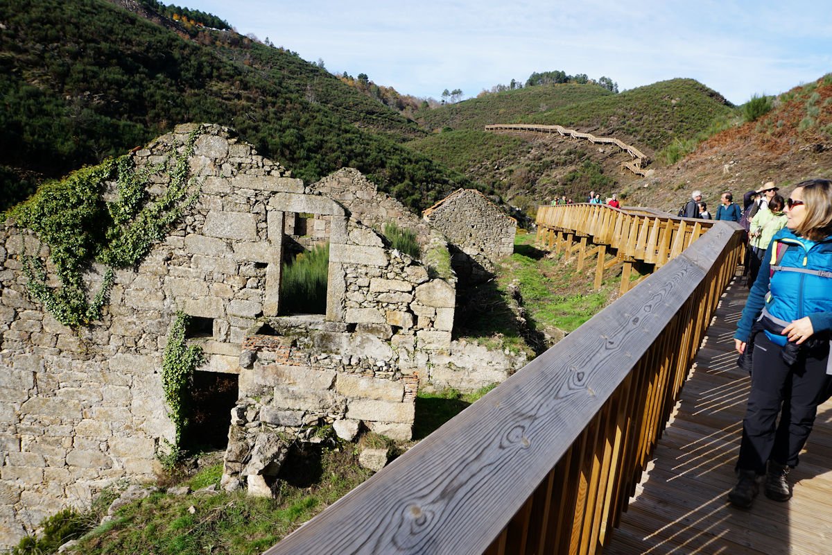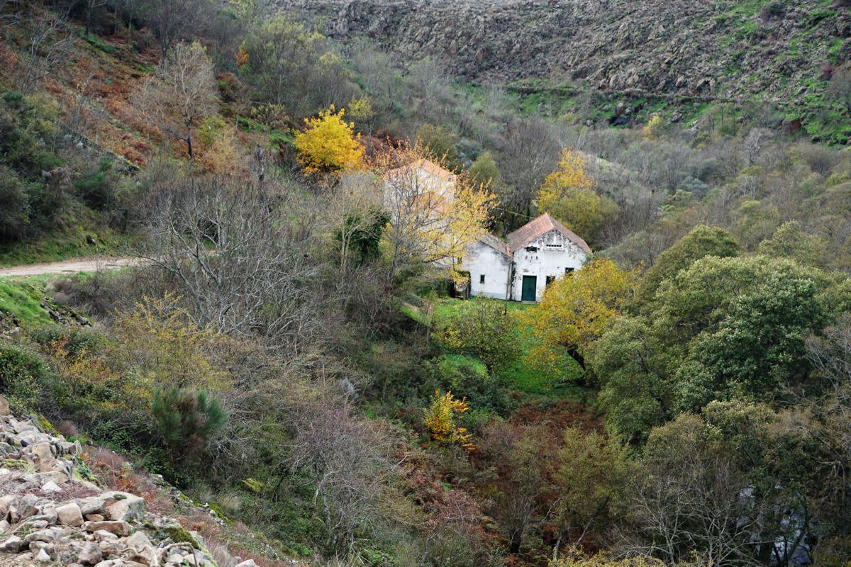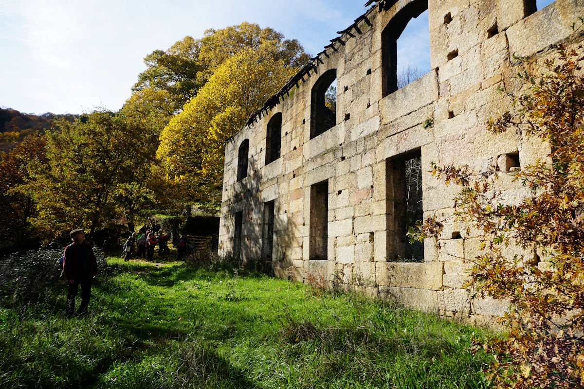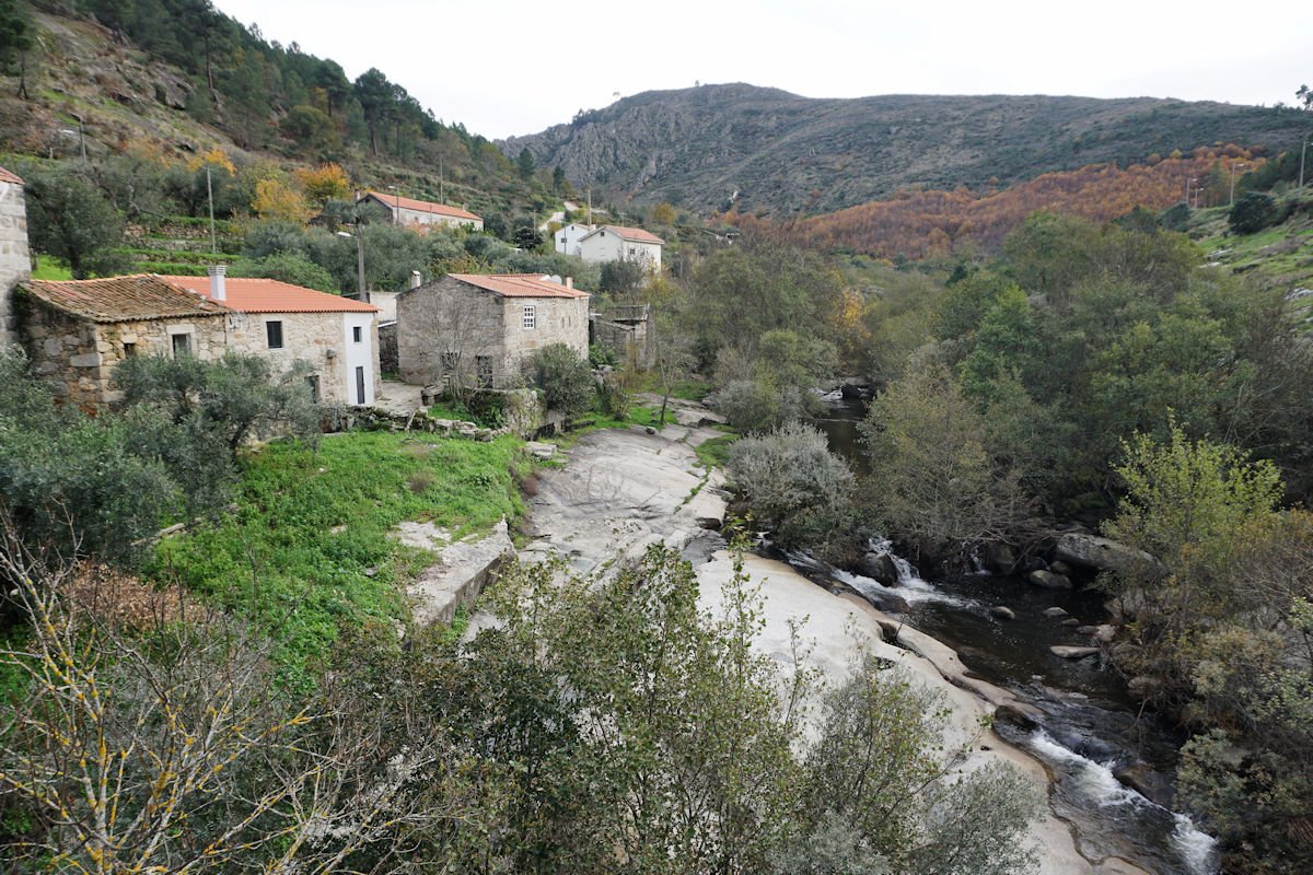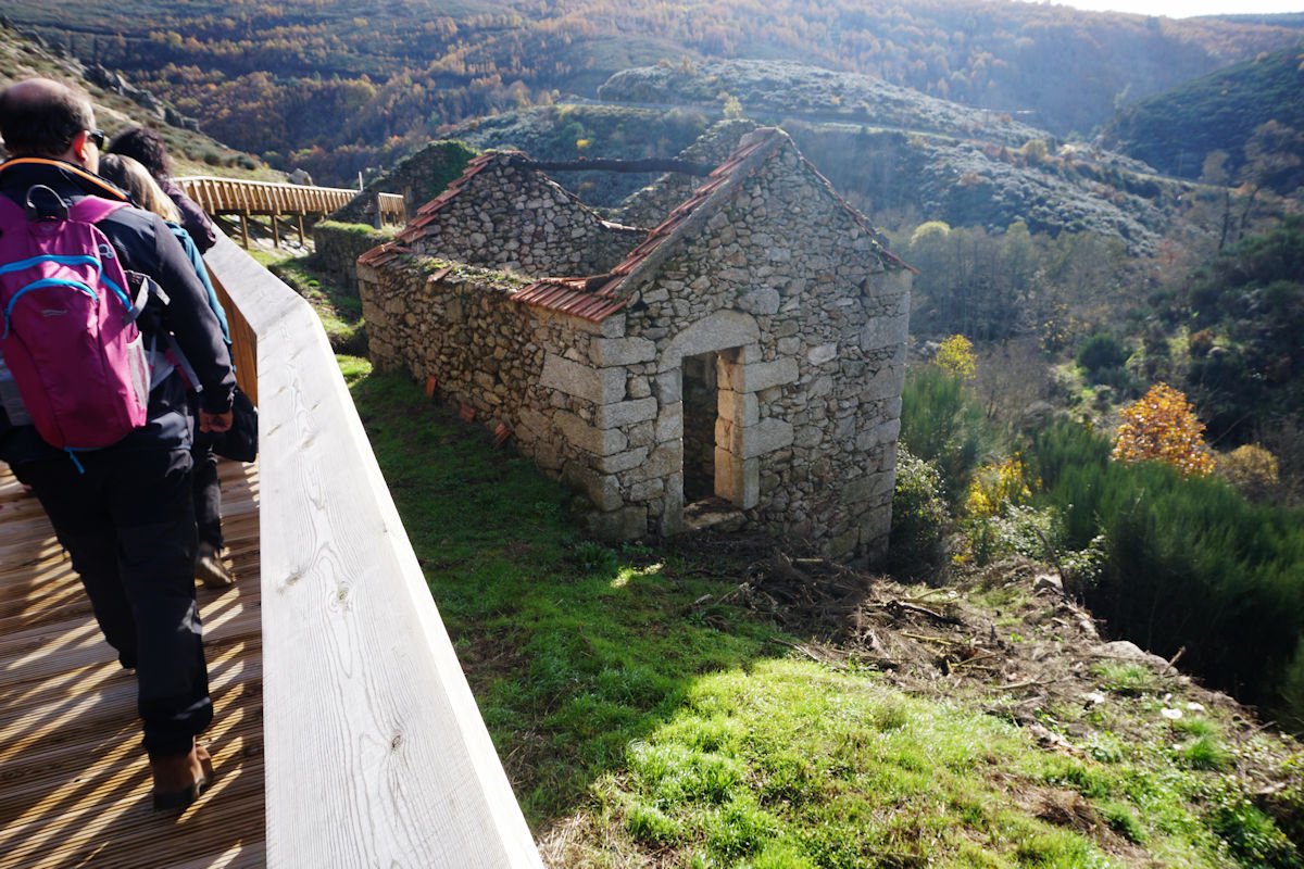 Iniciamos o percurso pelas 11:10 por uma enorme escadaria que desce a pique, encavalitada nas rochas xistosas, na direção de uma vistosa cascata do Ribeiro dos Moinhos onde são ainda visíveis as ruínas de vários deles. O pendor da descida reduz e passamos junto ao Engenho dos Carriços, situado muito perto da confluência do ribeiro de Cabris com o rio Mondego, que passa depois a correr à nossa direita bem engrossado com as chuvas que temos tido neste muito chuvoso mês de Novembro. Este e os outros engenhos que fomos vendo ao longo do percurso eram destinado à tecelagem, nomeadamente à feitura dos cobertores de papa e tiveram a sua época áurea no fim do séc. XIX e início do séc. XX, sendo posteriormente abandonados, quando outras formas de energia substituíram com vantagem a energia hidráulica dos engenhos.