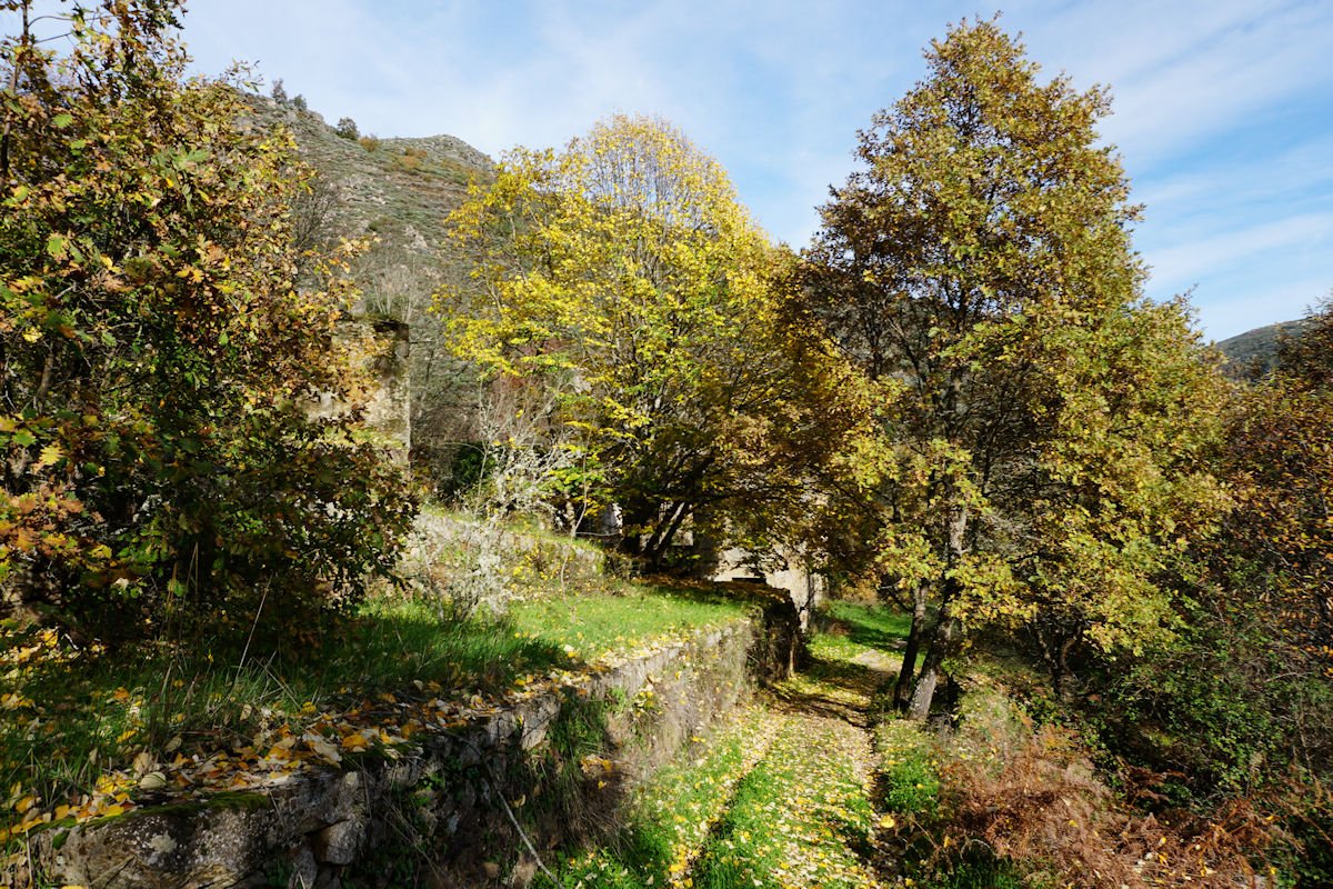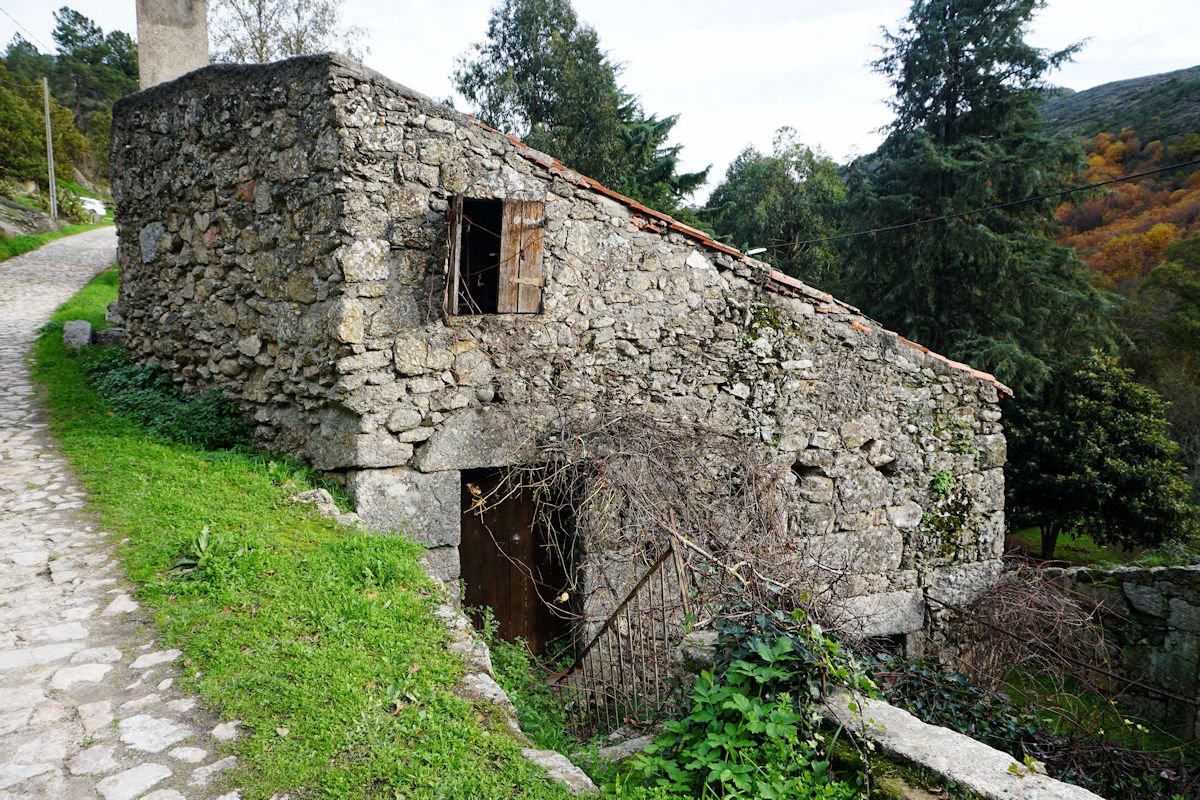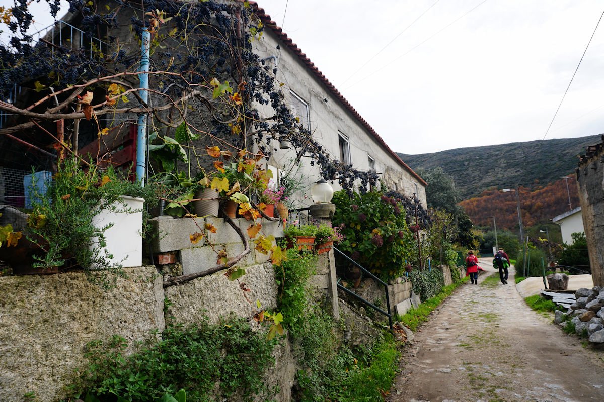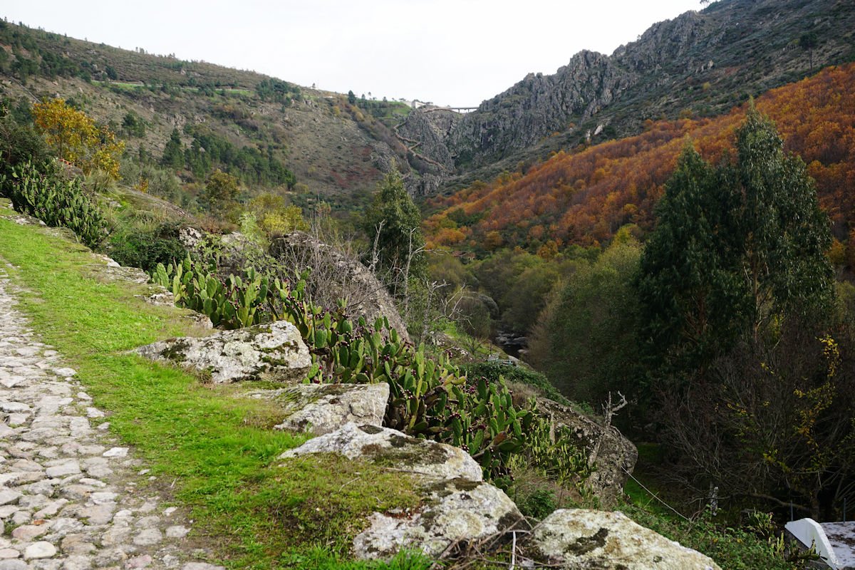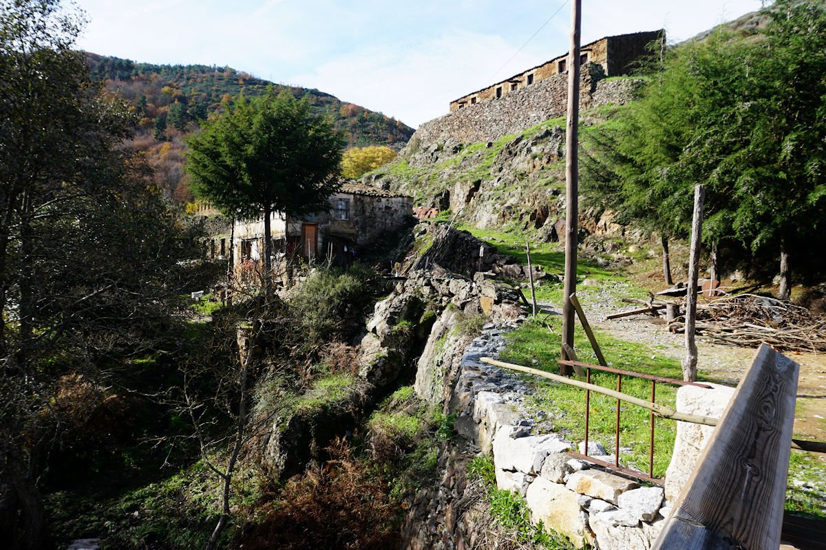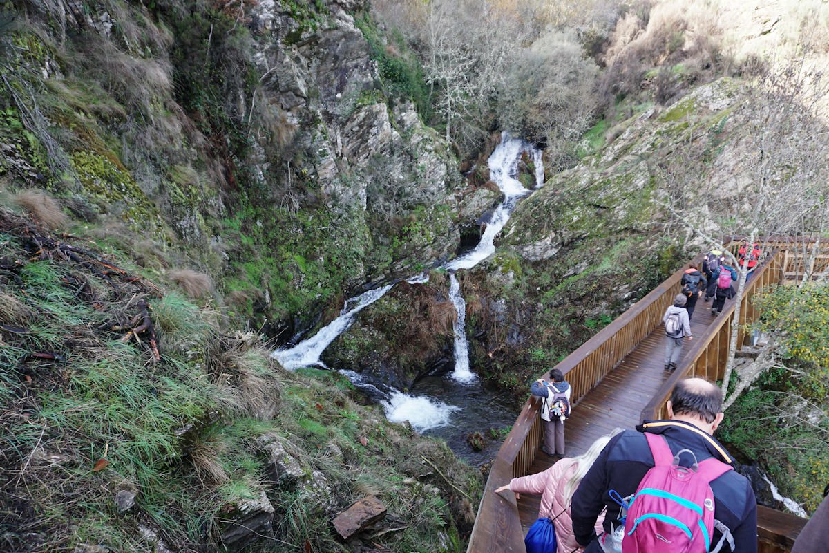 Iniciamos o percurso pelas 11:10 por uma enorme escadaria que desce a pique, encavalitada nas rochas xistosas, na direção de uma vistosa cascata do Ribeiro dos Moinhos onde são ainda visíveis as ruínas de vários deles. O pendor da descida reduz e passamos junto ao Engenho dos Carriços, situado muito perto da confluência do ribeiro de Cabris com o rio Mondego, que passa depois a correr à nossa direita bem engrossado com as chuvas que temos tido neste muito chuvoso mês de Novembro. Este e os outros engenhos que fomos vendo ao longo do percurso eram destinado à tecelagem, nomeadamente à feitura dos cobertores de papa e tiveram a sua época áurea no fim do séc. XIX e início do séc. XX, sendo posteriormente abandonados, quando outras formas de energia substituíram com vantagem a energia hidráulica dos engenhos.