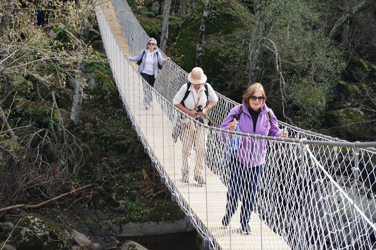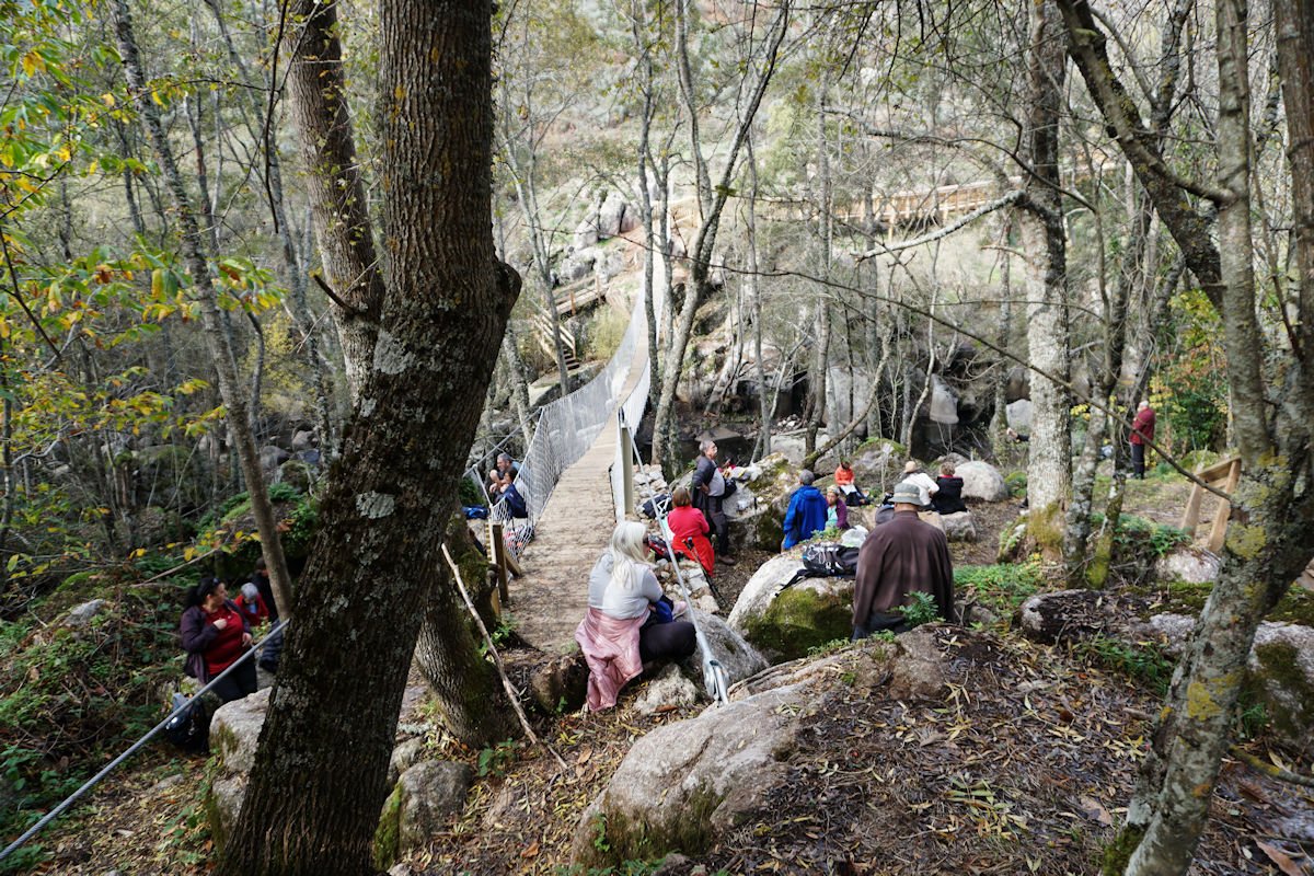 Como entretanto chegava a hora de almoço fizemos a paragem um pouco mais adiante, junto da ponte suspensa que transpunha para a margem esquerda, aproveitando umas pedras e o arvoredo para retemperar energias, antes de reentrar nos passadiços do outro lado.