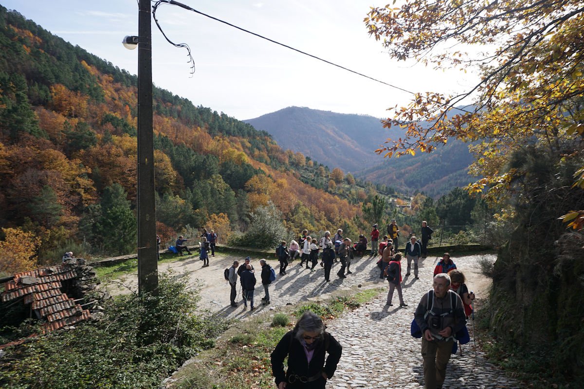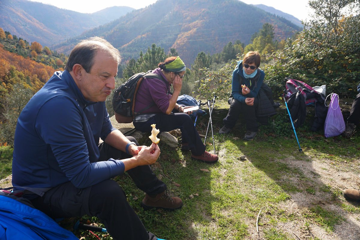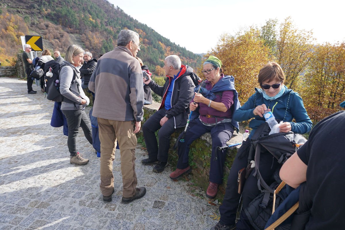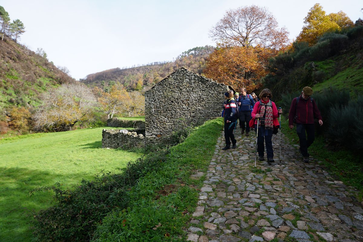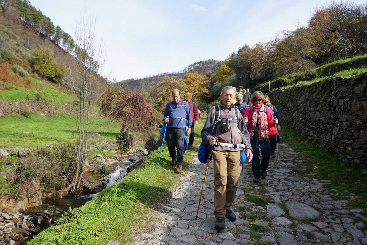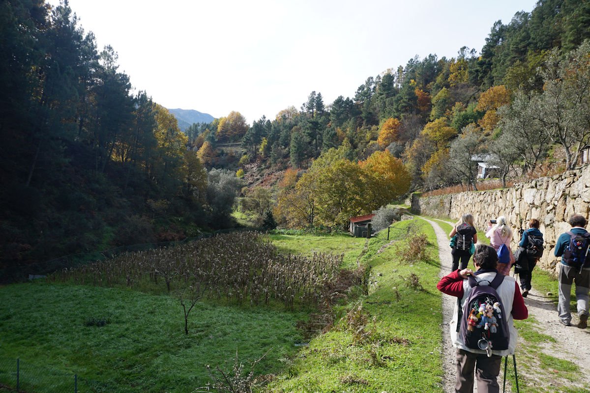 Inicialmente tínhamos previsto fazer todo o percurso circular, subindo o vale e regressando à Cruz da Jugadas, mas depois de ponderar o tempo disponível e o andamento do grupo, decidimos alterar o percurso, descendo o frondoso vale e terminando mais abaixo, num acesso bem agreste à EN 232, onde marcamos encontro com o nosso transporte. Os mais capazes que nos perdoem esta alteração ao programa, mas quem gere o grupo tem que estar atento às dificuldades que os participantes evidenciam, e havia gente já muito cansada com o acumular dos dois dias de caminhada.