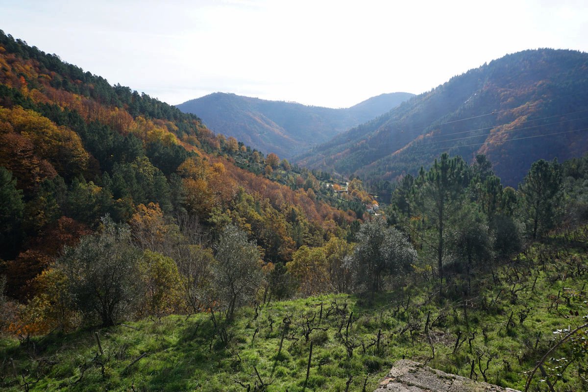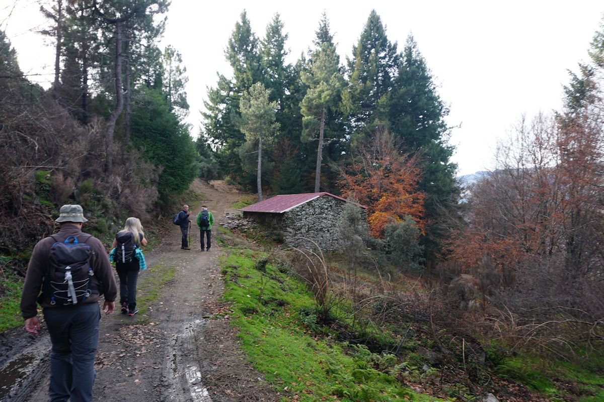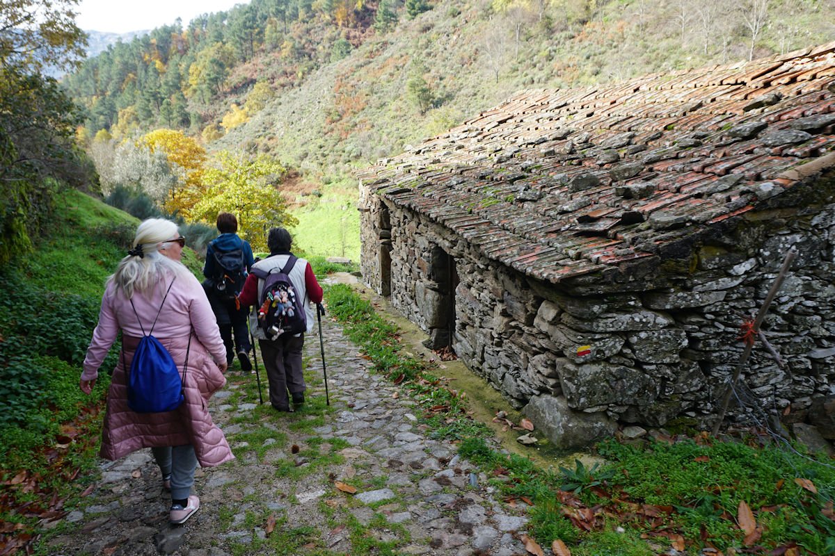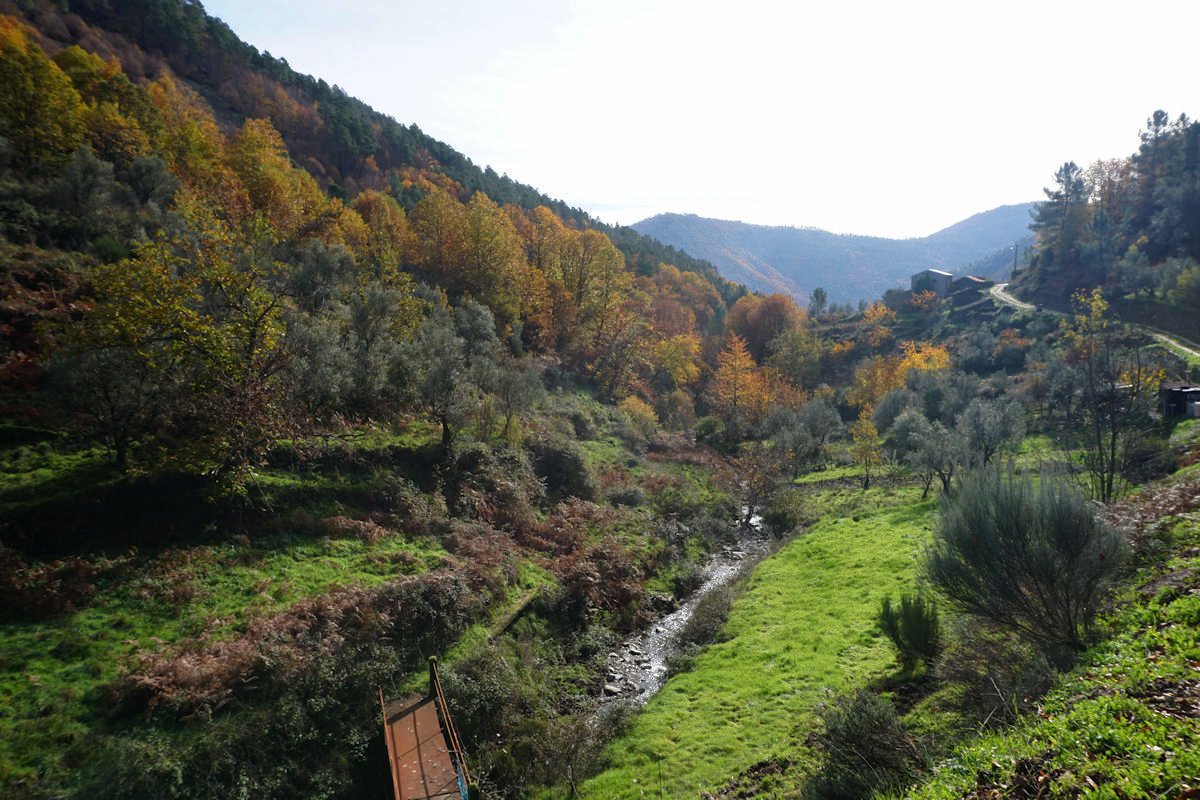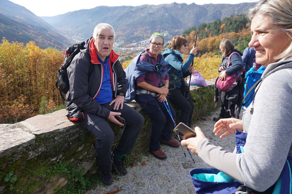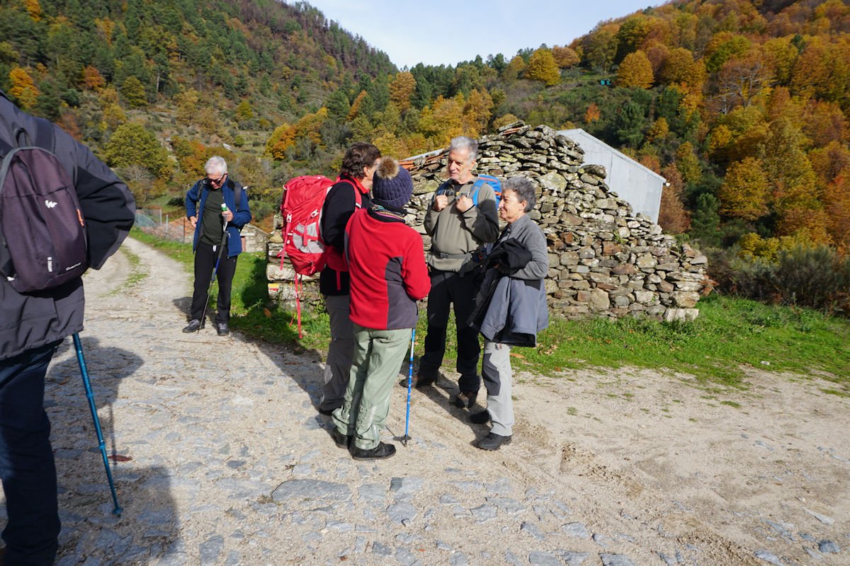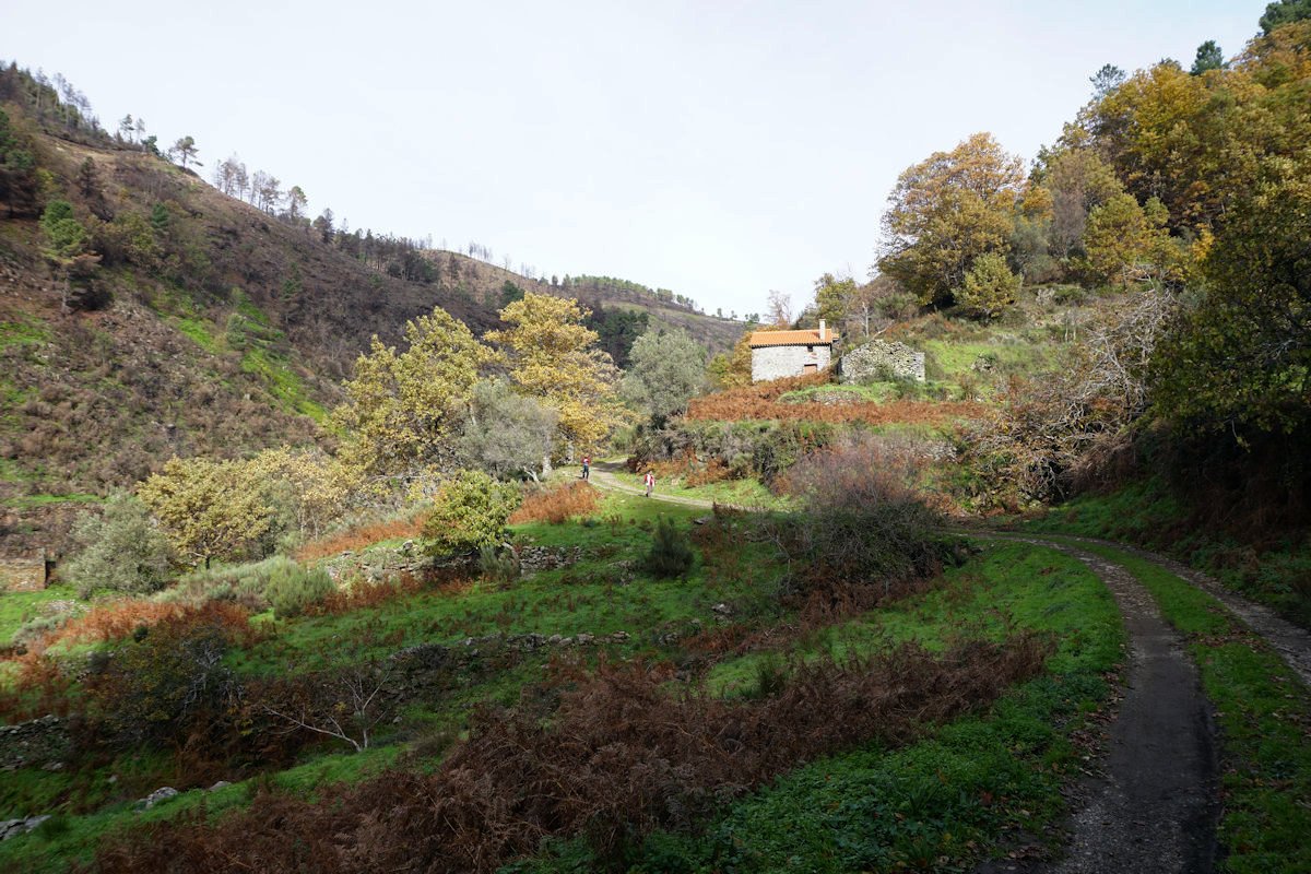 Inicialmente tínhamos previsto fazer todo o percurso circular, subindo o vale e regressando à Cruz da Jugadas, mas depois de ponderar o tempo disponível e o andamento do grupo, decidimos alterar o percurso, descendo o frondoso vale e terminando mais abaixo, num acesso bem agreste à EN 232, onde marcamos encontro com o nosso transporte. Os mais capazes que nos perdoem esta alteração ao programa, mas quem gere o grupo tem que estar atento às dificuldades que os participantes evidenciam, e havia gente já muito cansada com o acumular dos dois dias de caminhada.