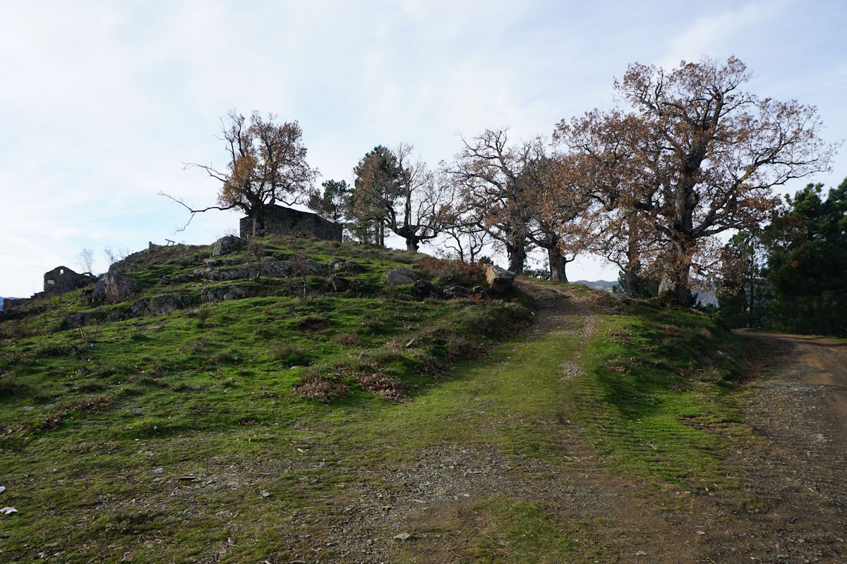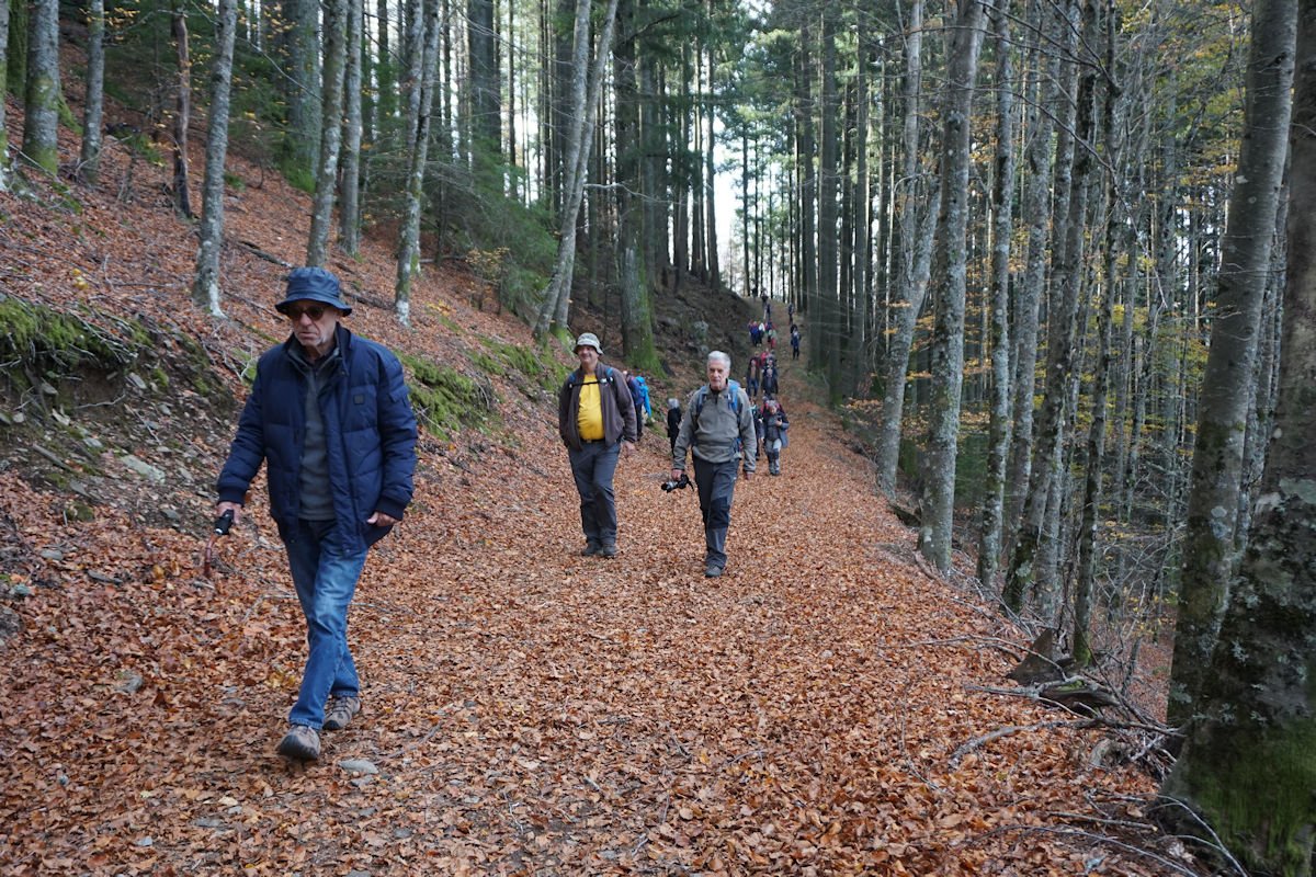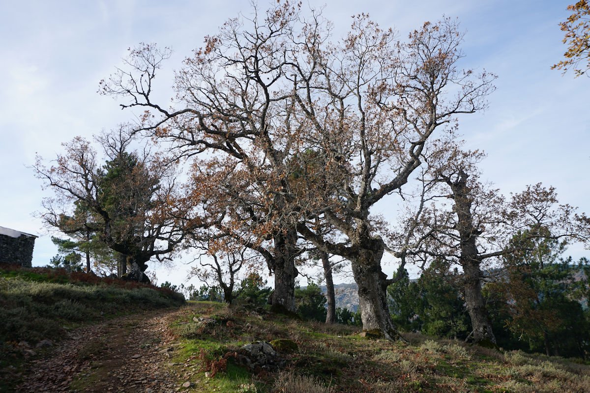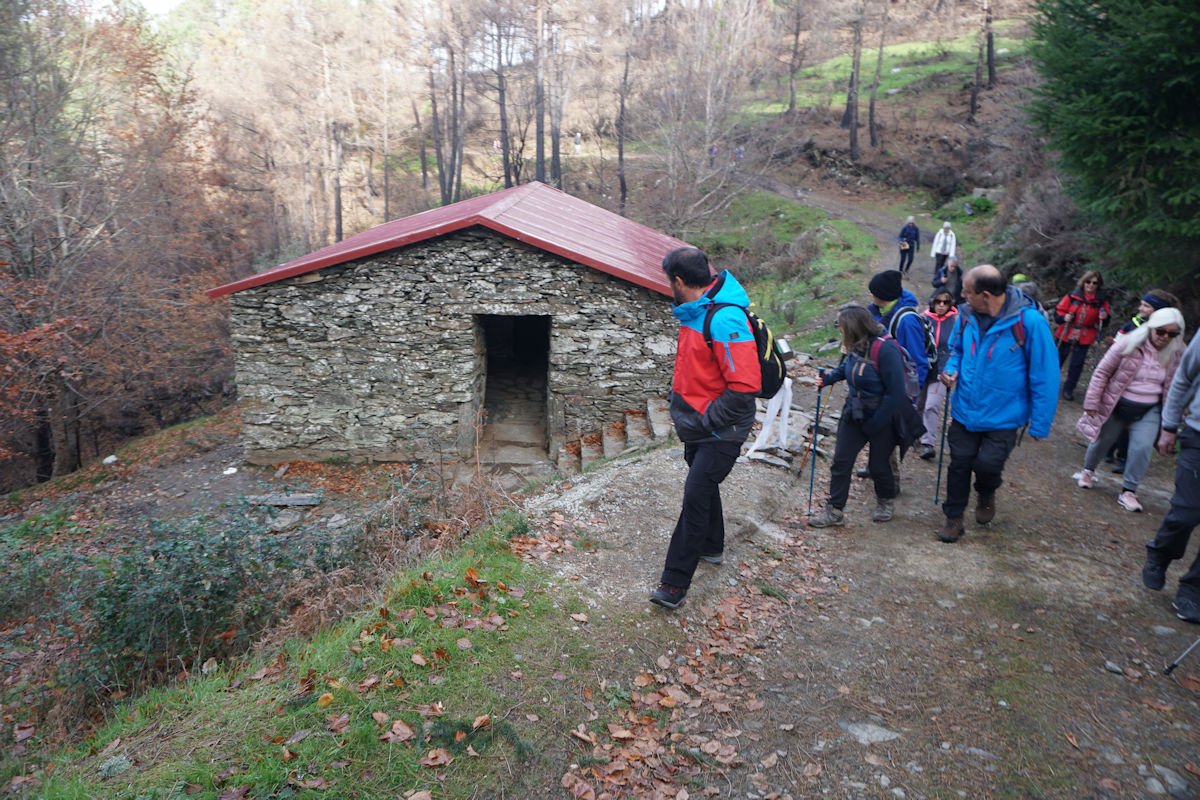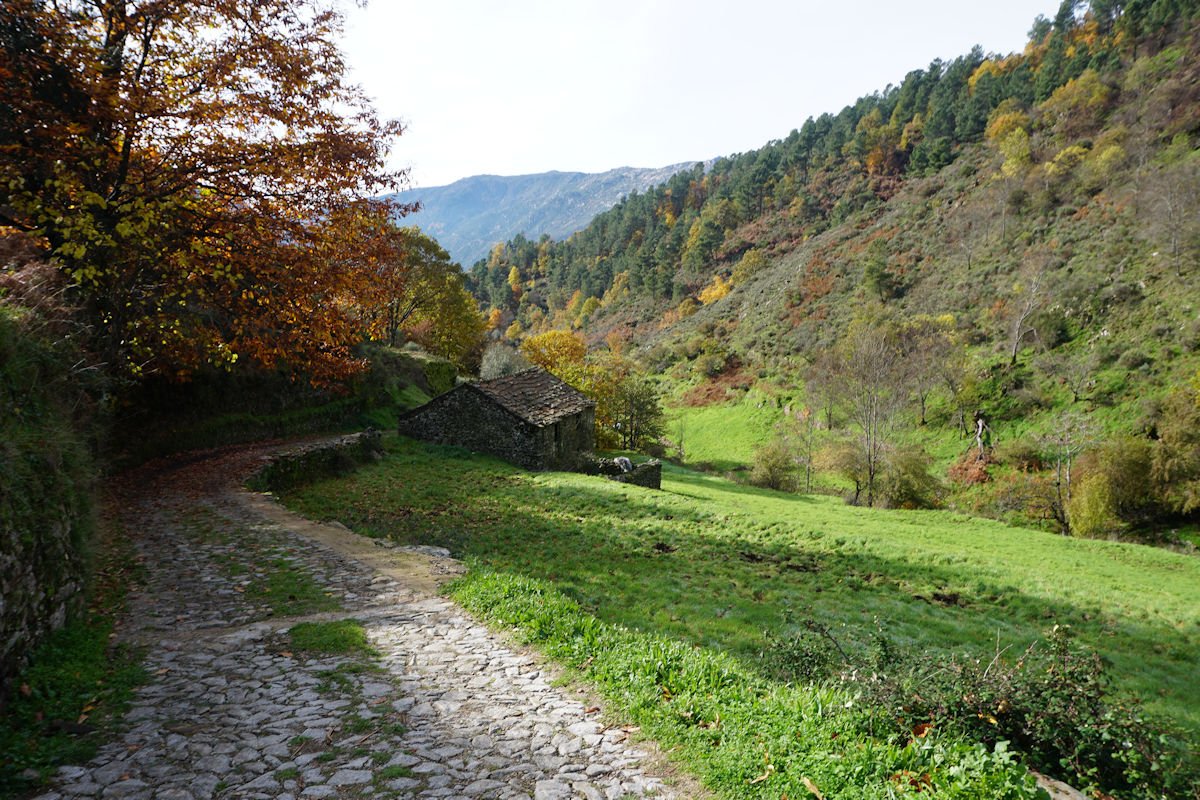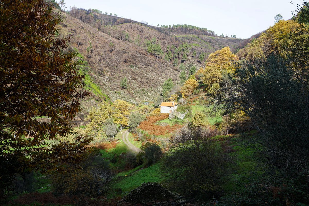 Inicialmente tínhamos previsto fazer todo o percurso circular, subindo o vale e regressando à Cruz da Jugadas, mas depois de ponderar o tempo disponível e o andamento do grupo, decidimos alterar o percurso, descendo o frondoso vale e terminando mais abaixo, num acesso bem agreste à EN 232, onde marcamos encontro com o nosso transporte. Os mais capazes que nos perdoem esta alteração ao programa, mas quem gere o grupo tem que estar atento às dificuldades que os participantes evidenciam, e havia gente já muito cansada com o acumular dos dois dias de caminhada.