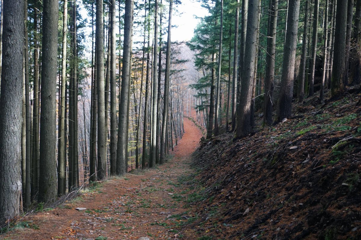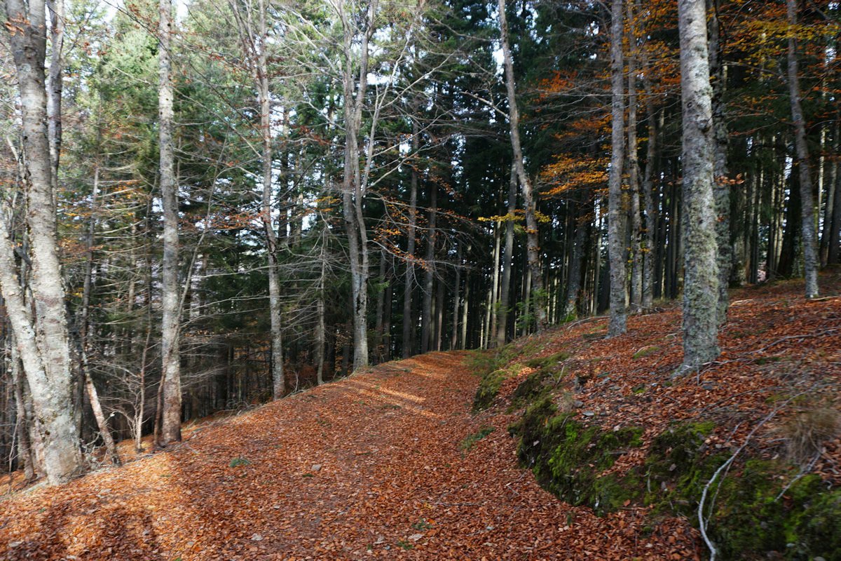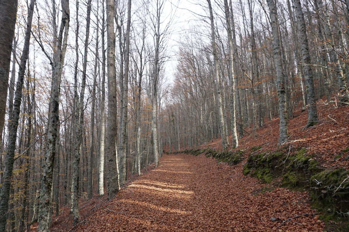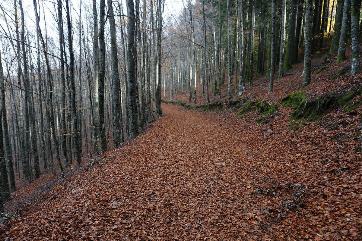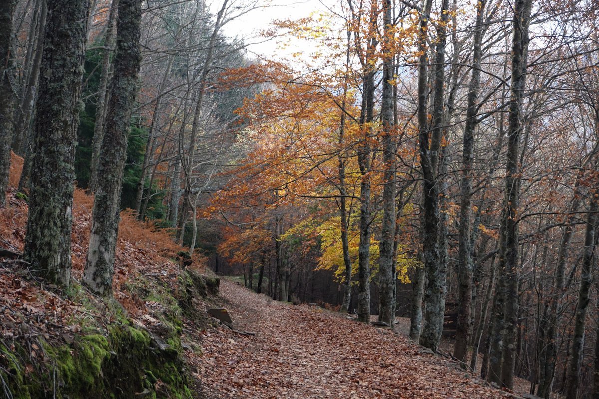 Depois de mais umas fotos continuamos a forte descida pelo interior da mata de S. Lourenço até à ribeira do Pandil, onde encurtamos o percurso PR-13 Rota das Faias para descer o vale na direção da Granja.