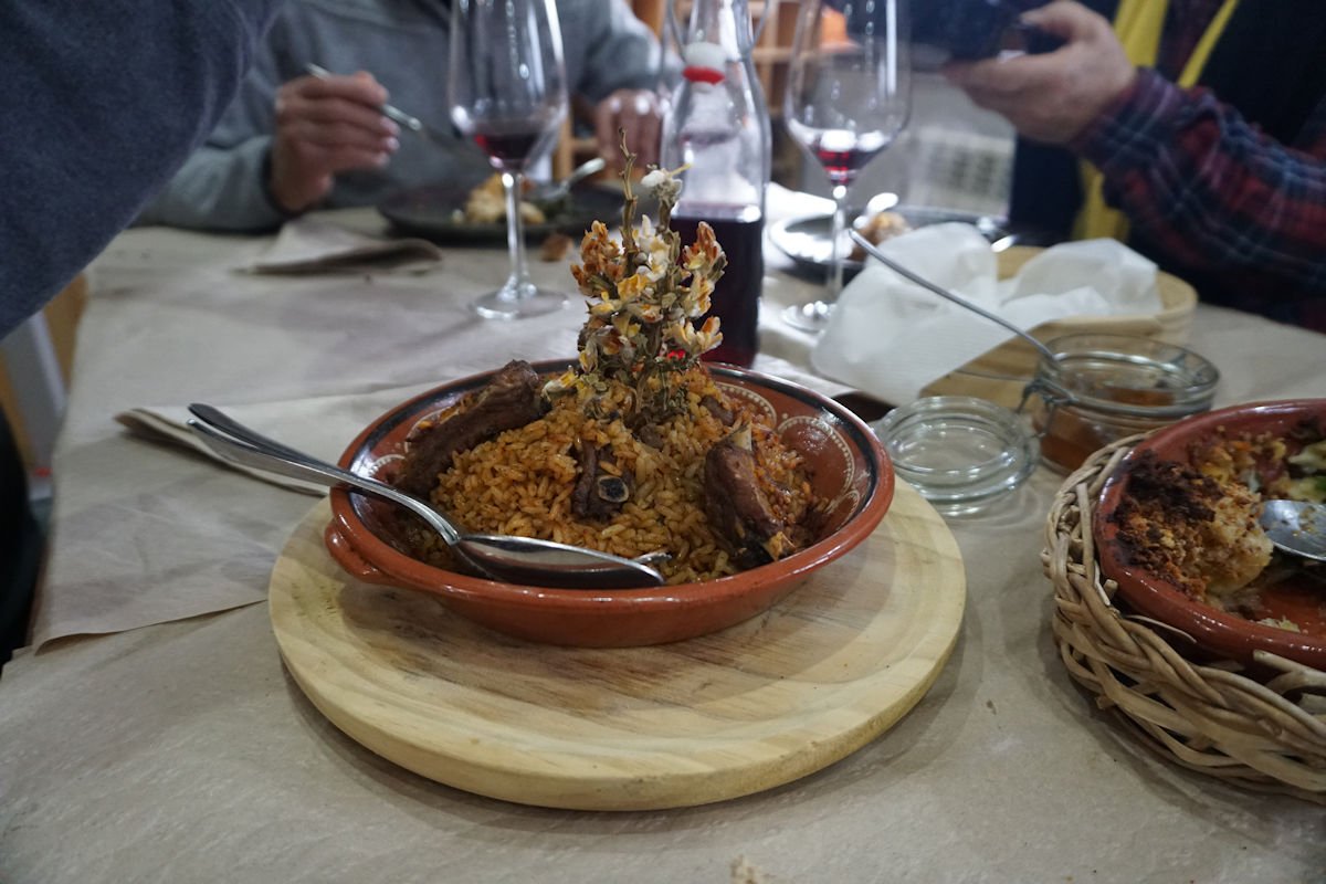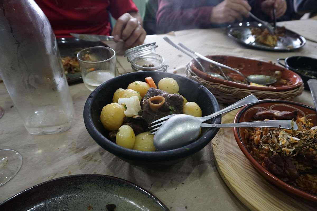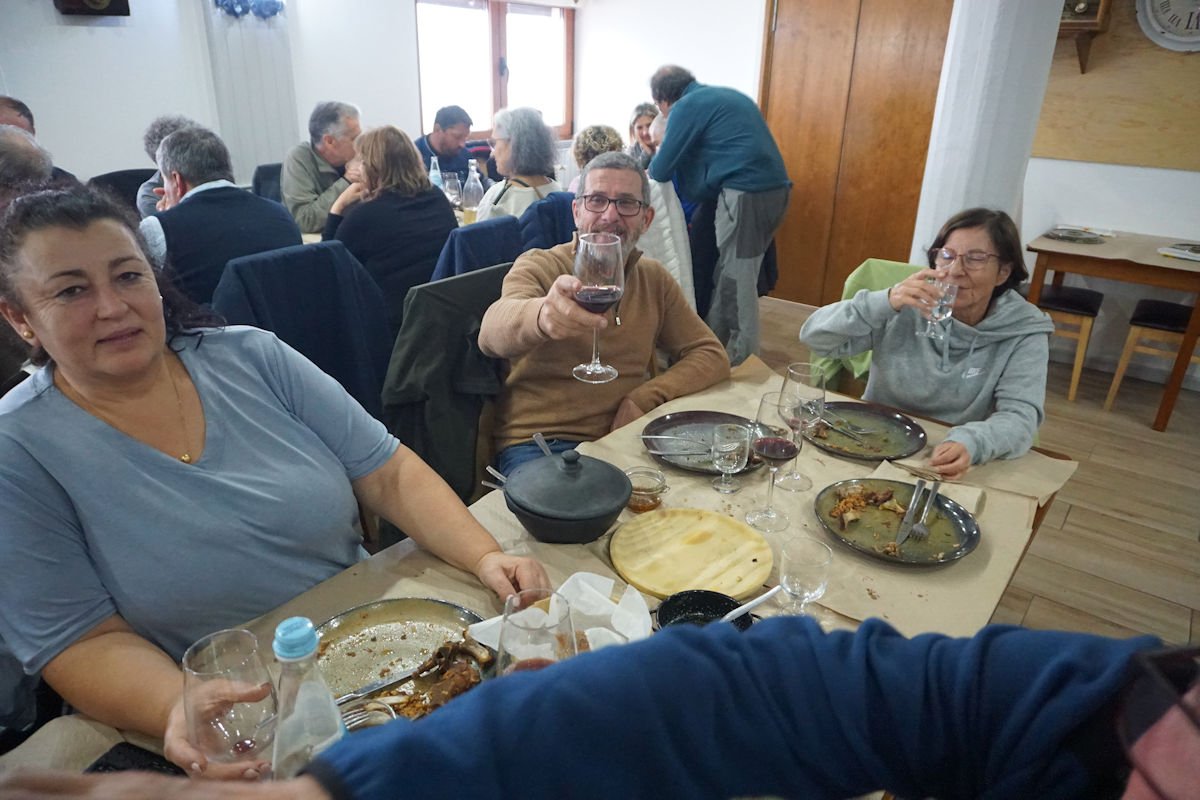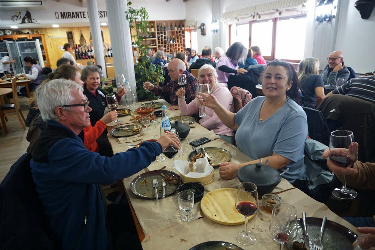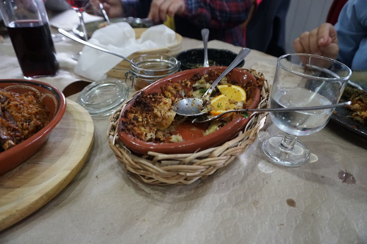 Chegados a Sabugueiro, depois de uma prévia pausa para compras de produtos regionais, fomos finalmente para o restaurante com a barriga a dar horas, mas valeu a pena a espera. Depois de umas entradas regionais de queijos e enchidos, pudemos apreciar os pratos típicos de bacalhau com broa, arroz de carqueja e a chanfana.