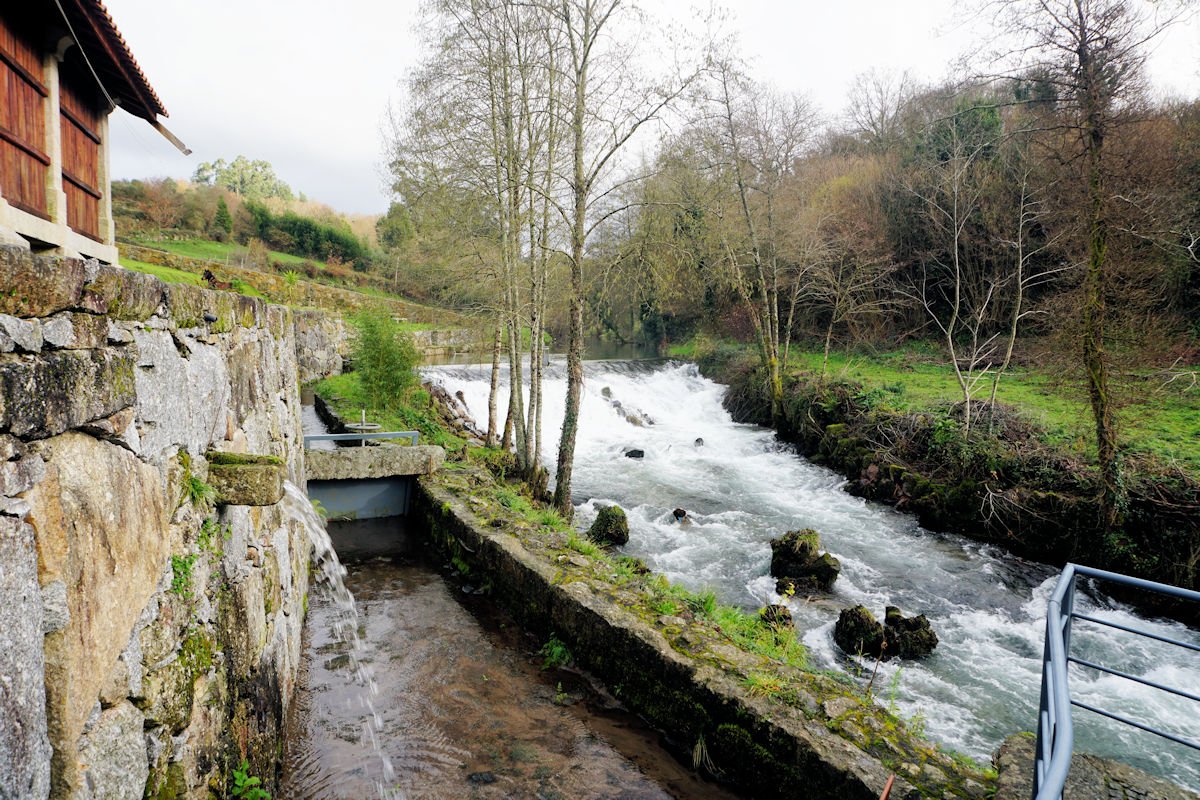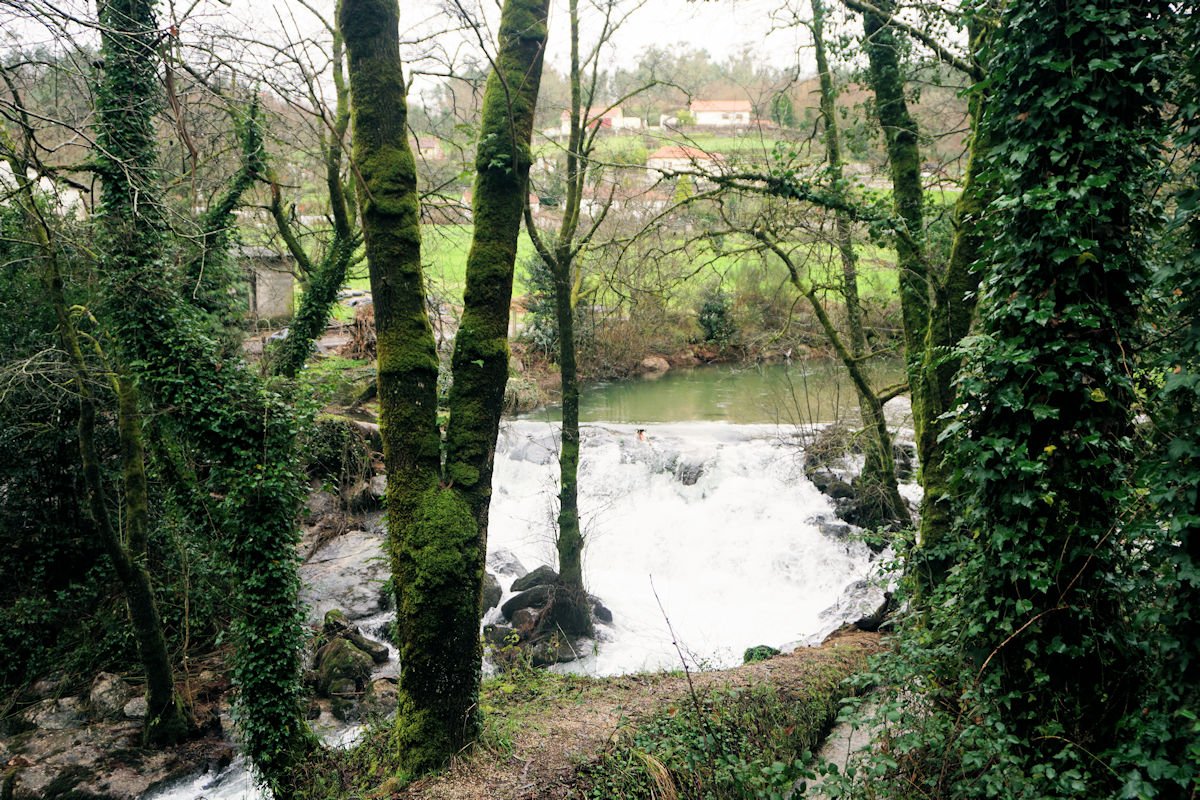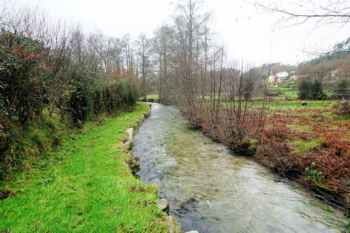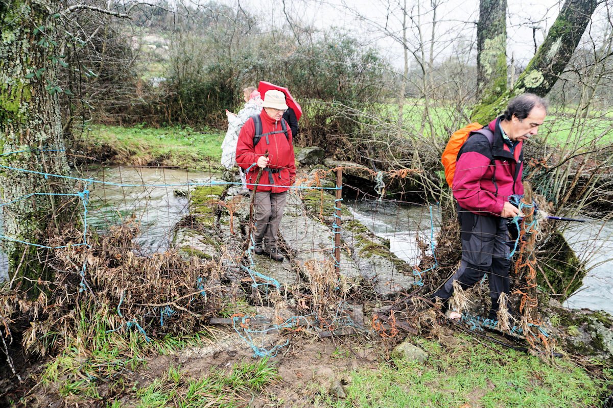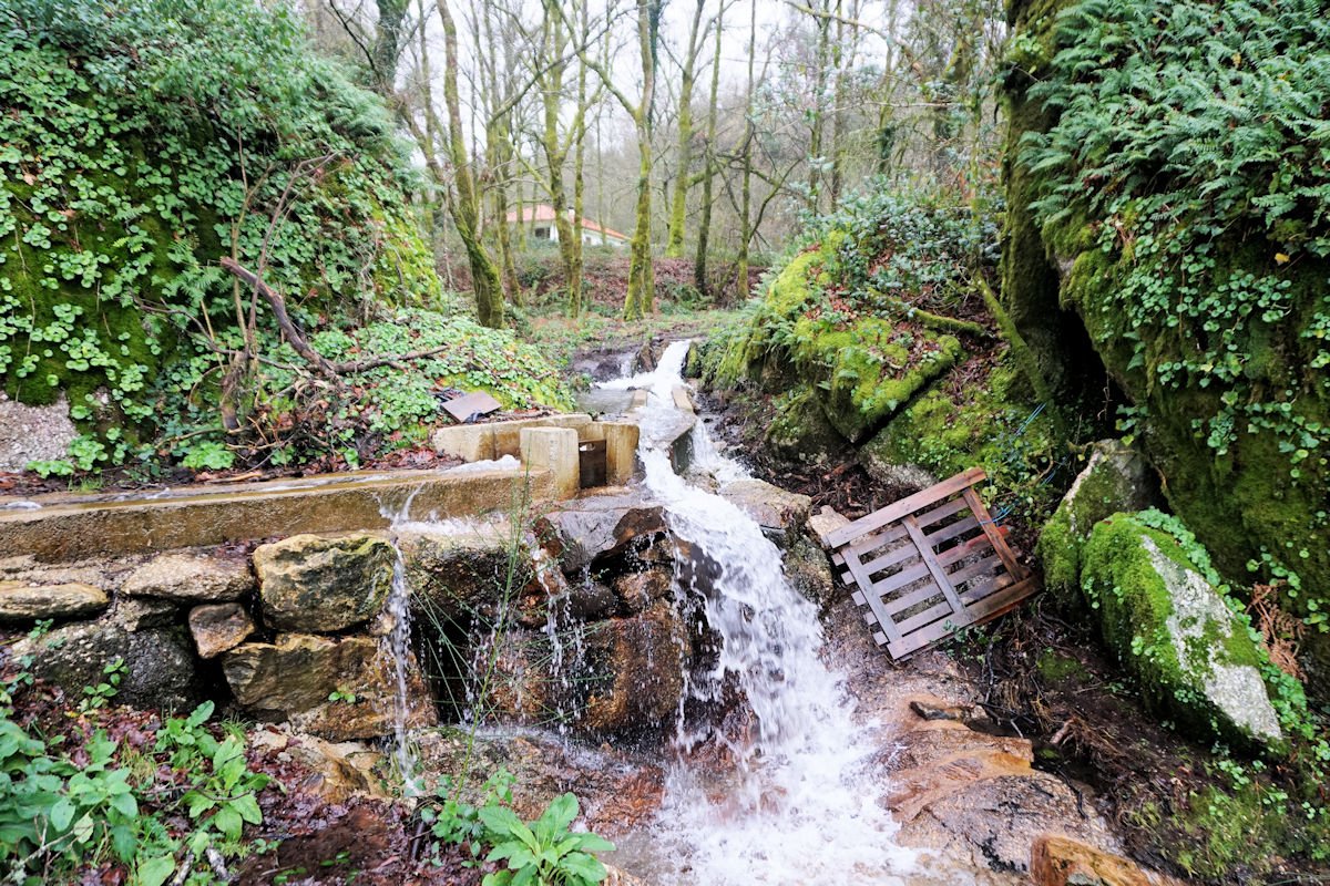 Rumamos pelas extremas dos campos de cultivo às margens do Coura, que cruzamos numa pontelha semidestruída, passando para a sua margem direita que fomos sempre acompanhando até à Ponte de Parada. Aí cruzamos de novo o rio Coura, continuando agora pela sua margem esquerda, seguindo uma levada que corre paralela ao rio, que nesta zona tem um pendor importante, descendo a encosta por uma série de quedas de água que o iam afastando cada vez mais do nosso trilho. Este troço difere do que originalmente estava previsto, mas valorizou muito o percurso, pois esta levada tem uma vista muito interessante.