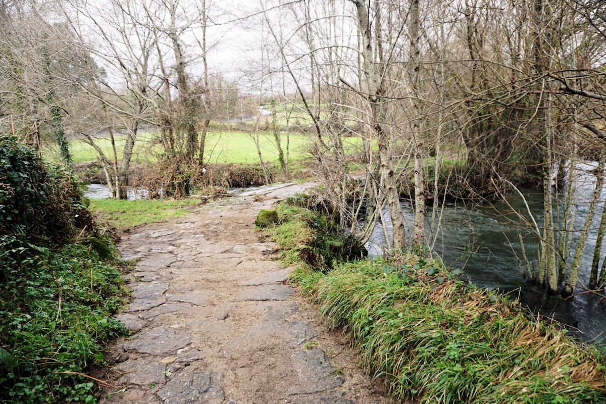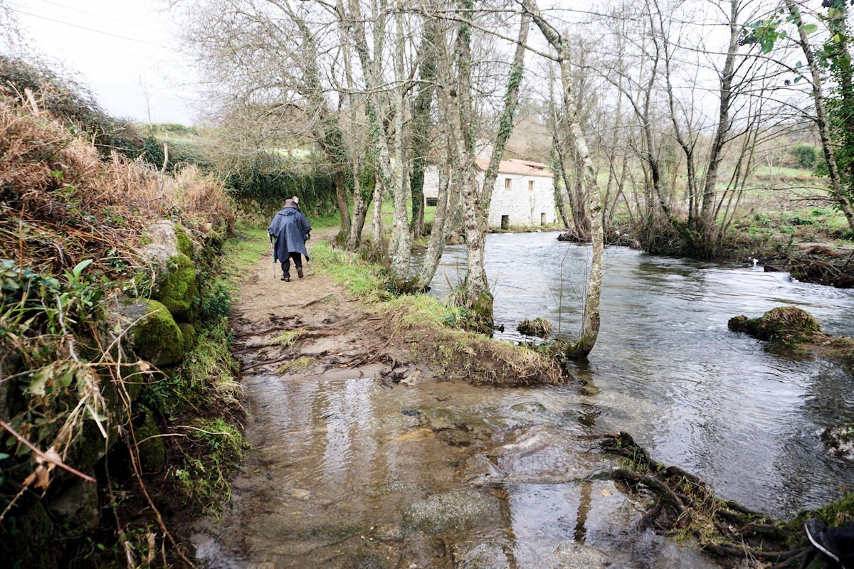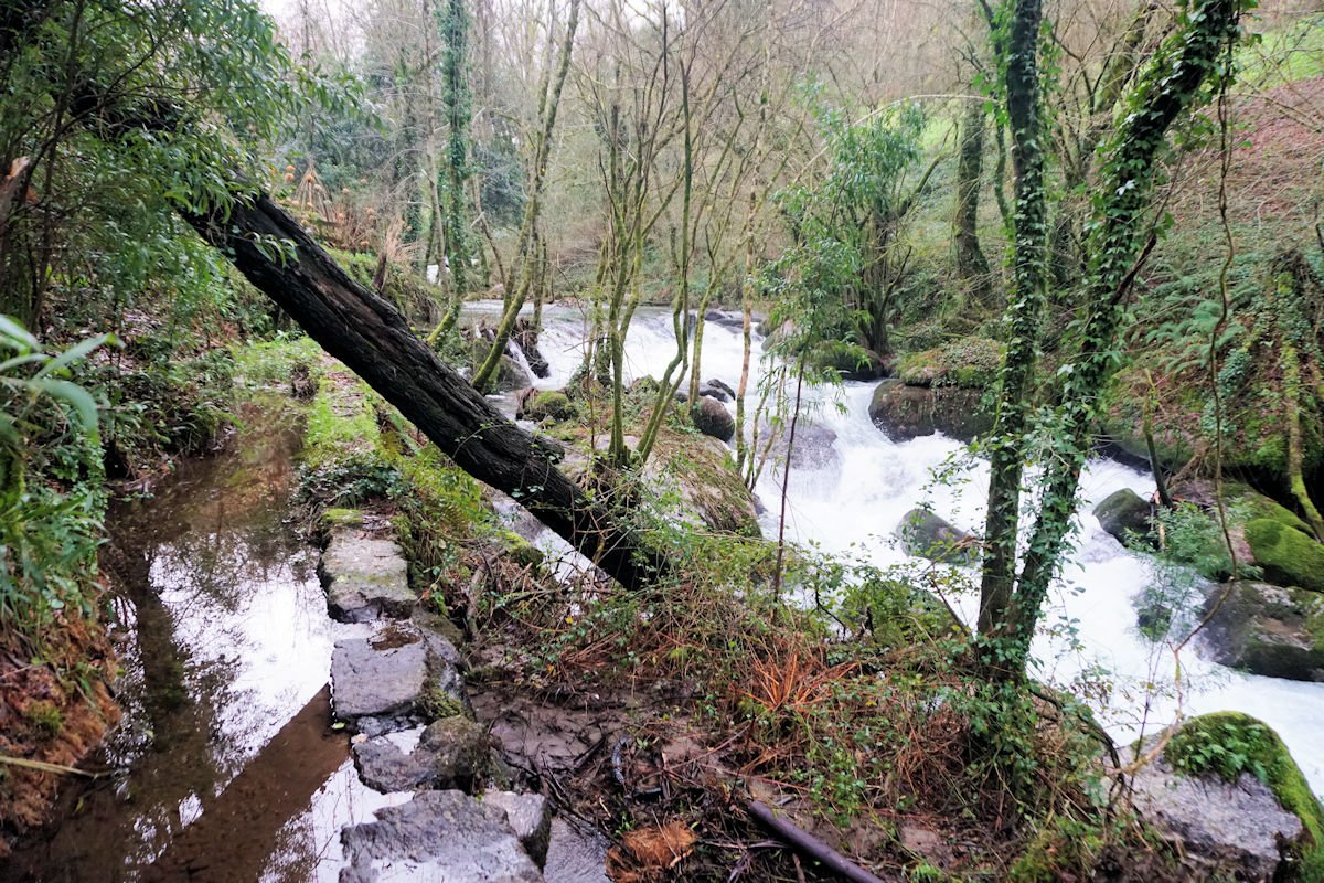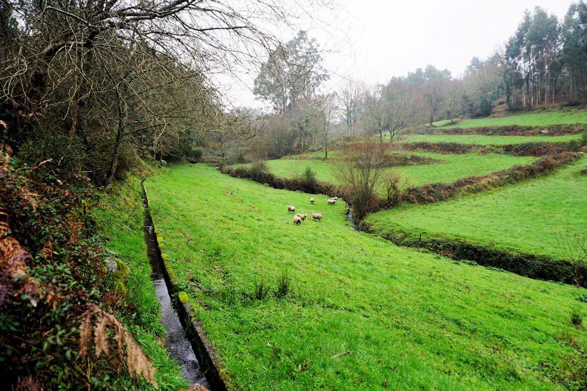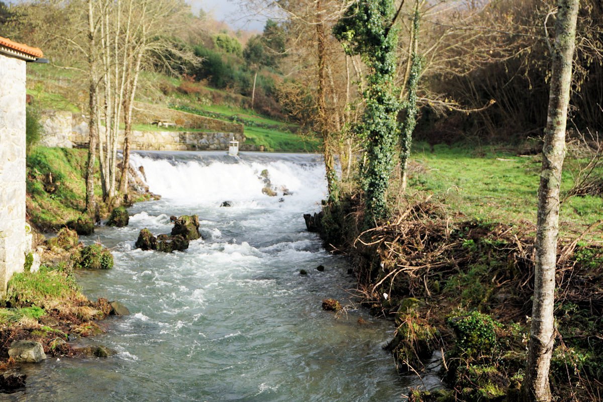 Rumamos pelas extremas dos campos de cultivo às margens do Coura, que cruzamos numa pontelha semidestruída, passando para a sua margem direita que fomos sempre acompanhando até à Ponte de Parada. Aí cruzamos de novo o rio Coura, continuando agora pela sua margem esquerda, seguindo uma levada que corre paralela ao rio, que nesta zona tem um pendor importante, descendo a encosta por uma série de quedas de água que o iam afastando cada vez mais do nosso trilho. Este troço difere do que originalmente estava previsto, mas valorizou muito o percurso, pois esta levada tem uma vista muito interessante.