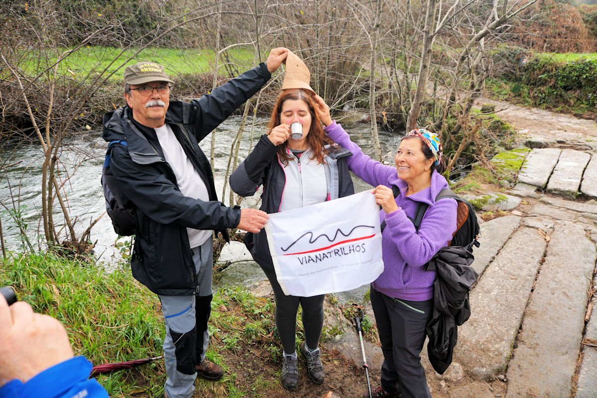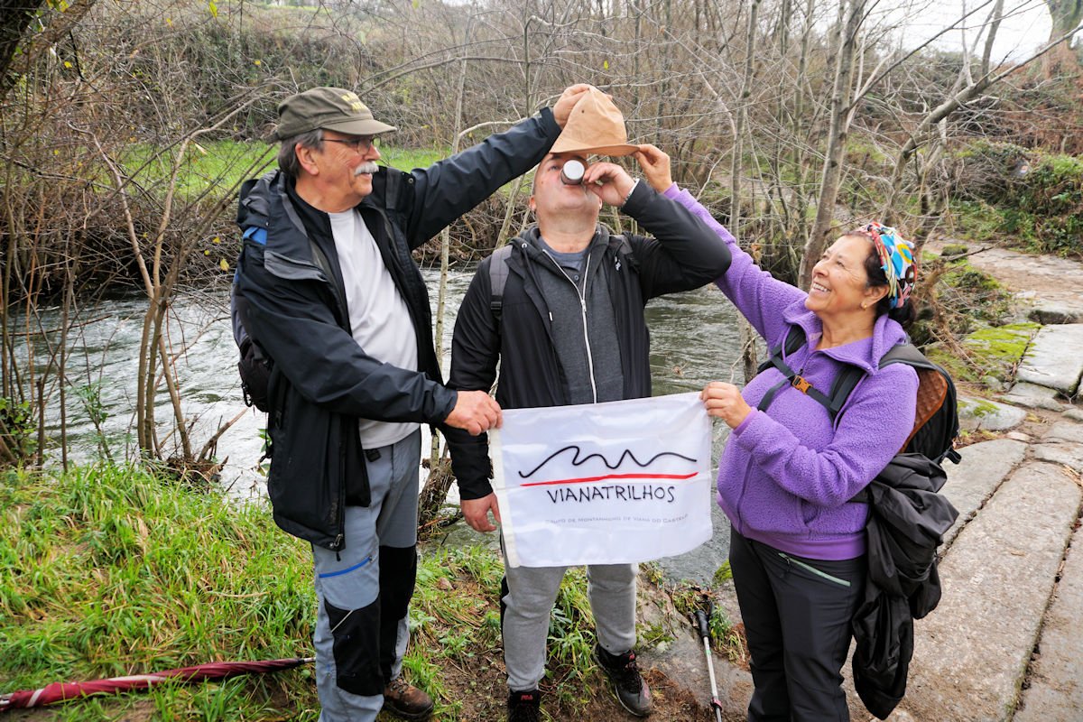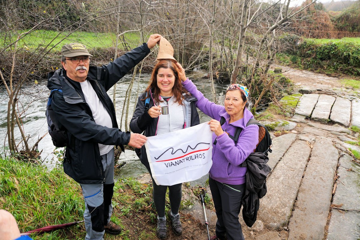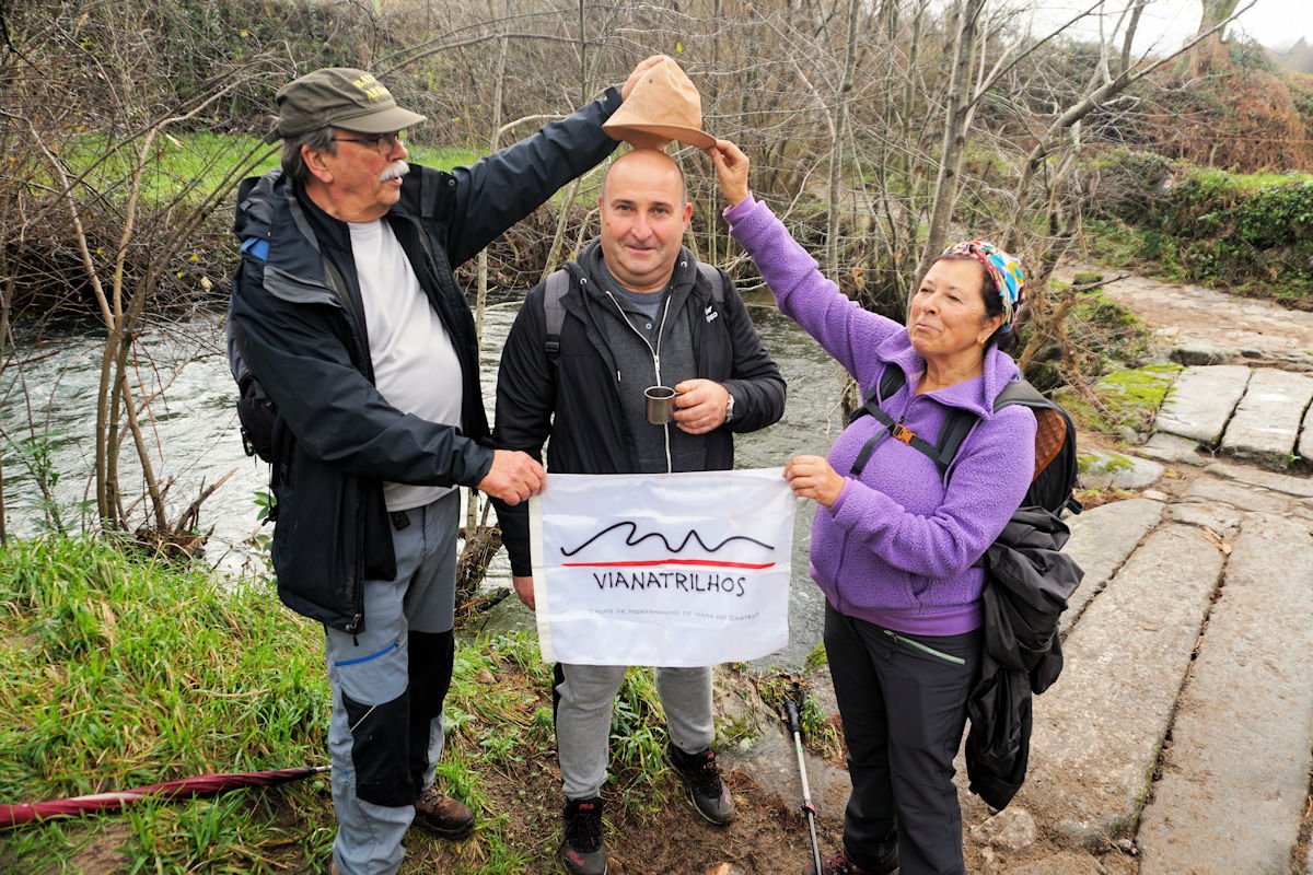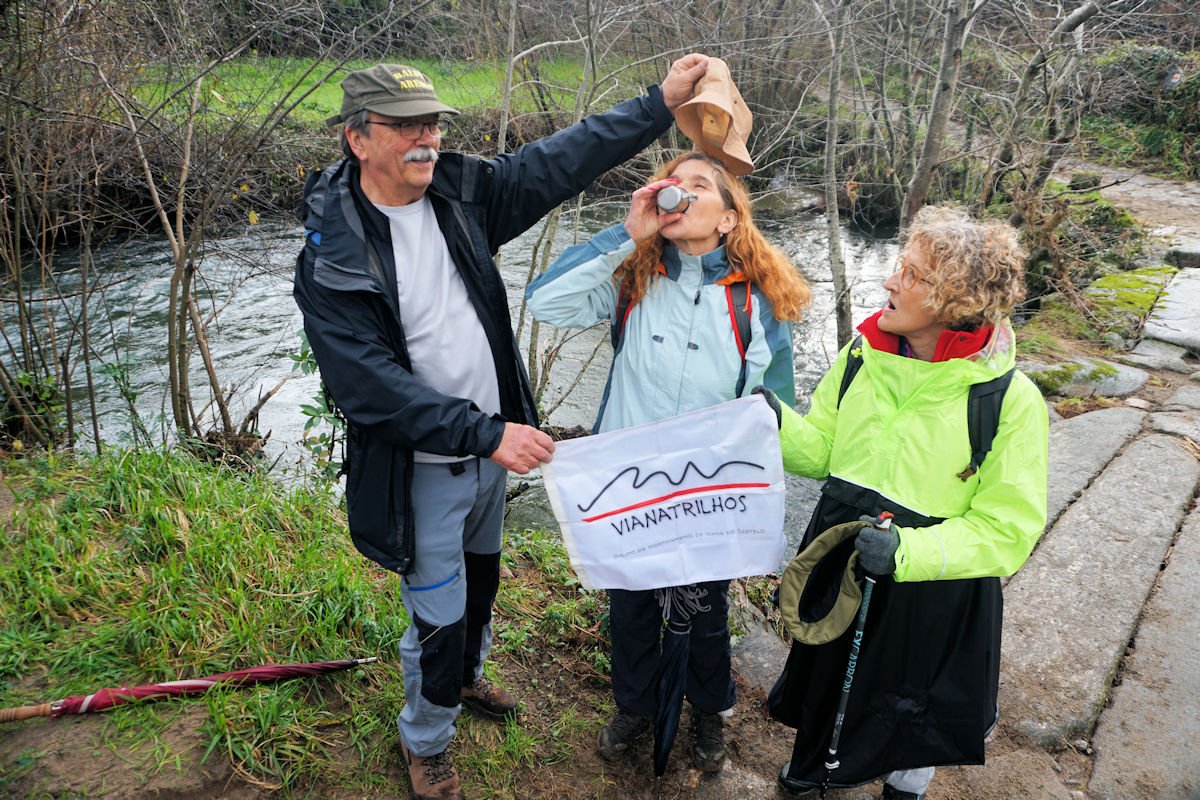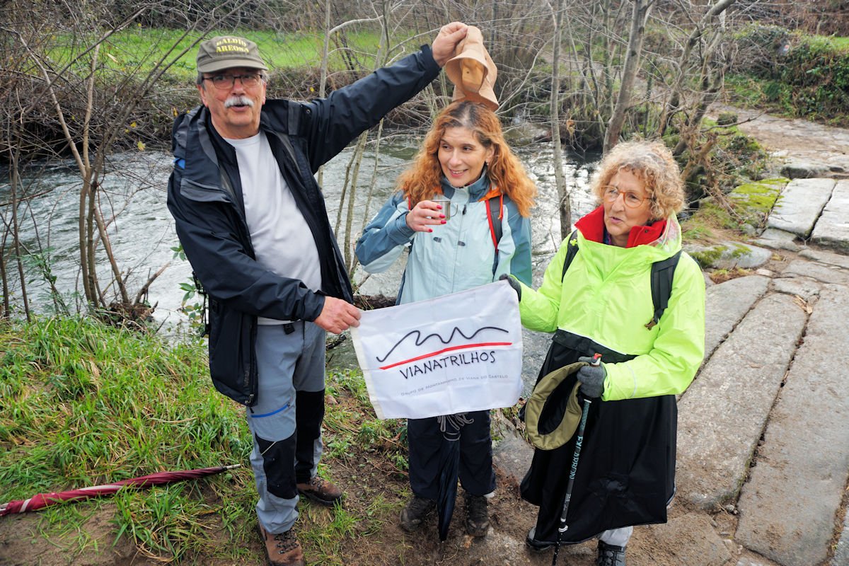 Como o sol raiava e o cenário era adequado, fizemos aquí nas margens do Coura o batismo do Camilo Correia, Paula Cristina e Graça Barroso. Não foi com as águas do Coura mas com a aguardente bagaceira do Branco que se fizeram os batismos de mais estes novos caminheiros, que assim passam a integrar o grupo.