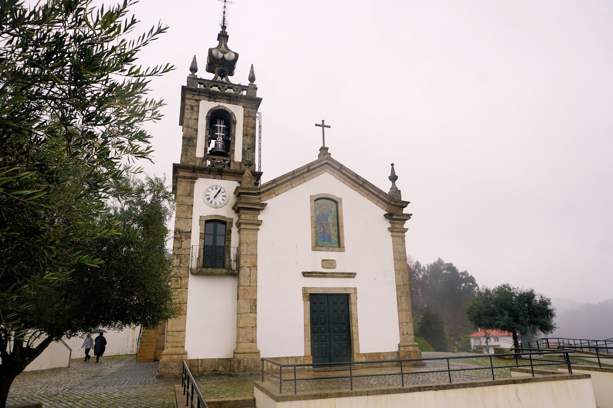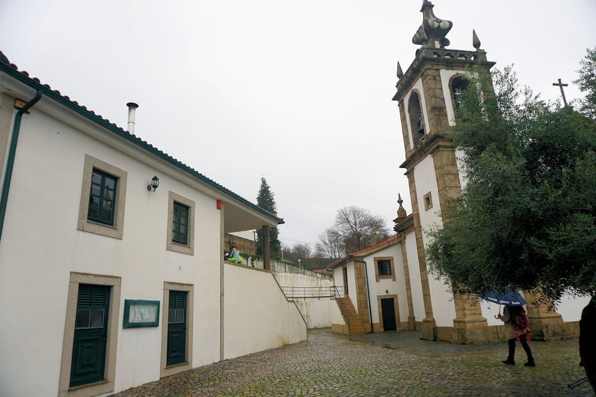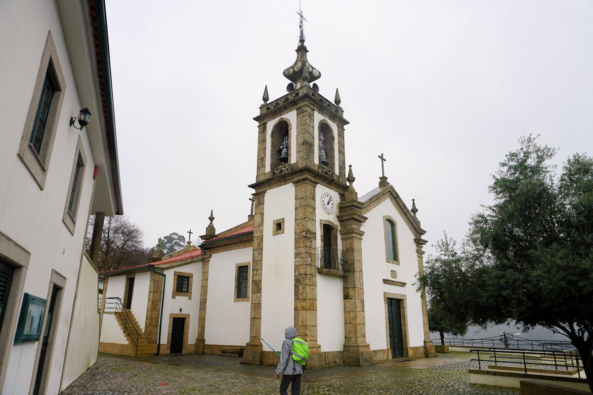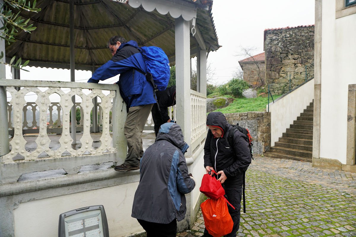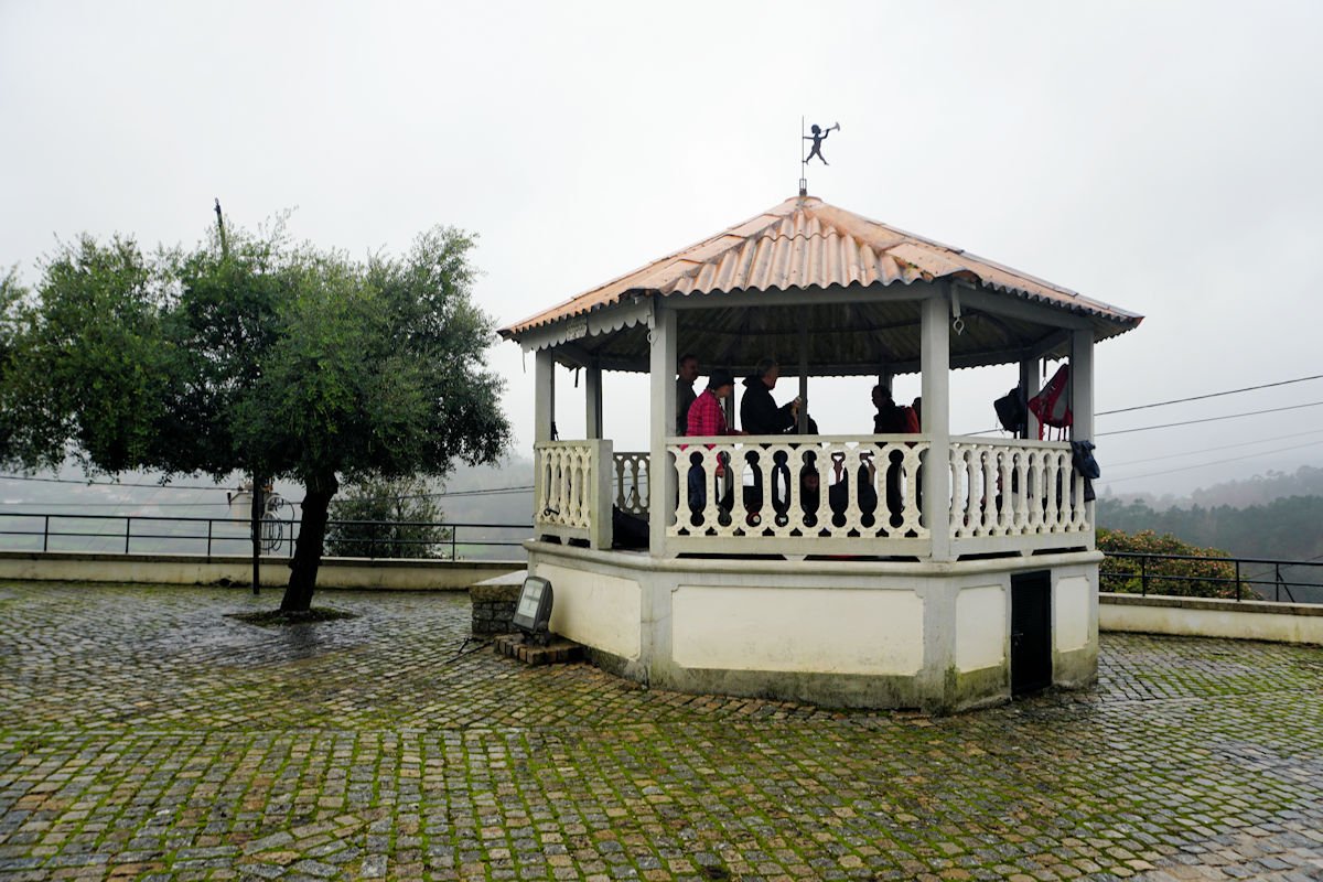 Comemos no coreto e nos diversos recantos dos anexos ao templo, fugindo à chuva e vento e contemplando as vastas vistas para o vale do Coura, um tanto obscurecidas pela chuva e neblina.