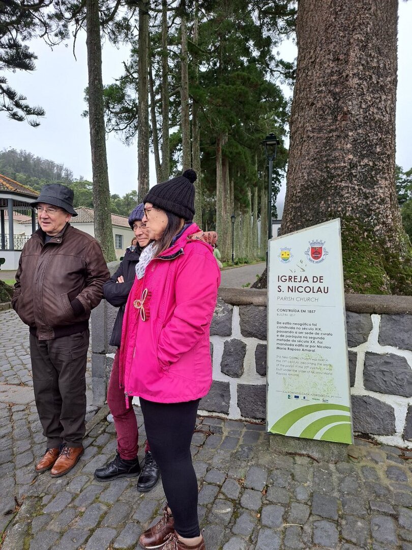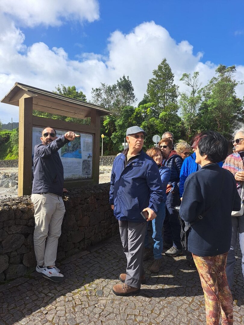 Largados os hotéis e novamente conduzidos pelo Rui Pavão e o Bruno, iniciamos mais um passeio pela ilha de S. Miguel, percorrendo a encosta Sul – Lagoa, Ribeira Chã e Vila Franca do Campo. Nesta última, oportunidade para degustar as suas famosas queijadas, e para visitar algumas das suas igrejas (das quais, cinco em cerca de 800 metros), destacando-se a Igreja do Senhor Bom Jesus da Pedra e a bela Igreja de S. Miguel Arcanjo, esta em estilo gótico, reconstruída após o terramoto de 1522. Na parede da sua torre sineira, voltada ao mar, conserva ainda uma curiosa marca de um projéctil de artilharia, tendo sido inscrito, por baixo, a data do ataque: 1624.