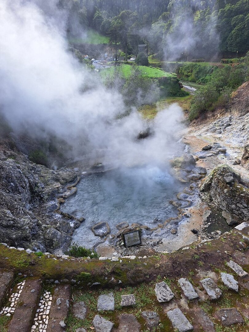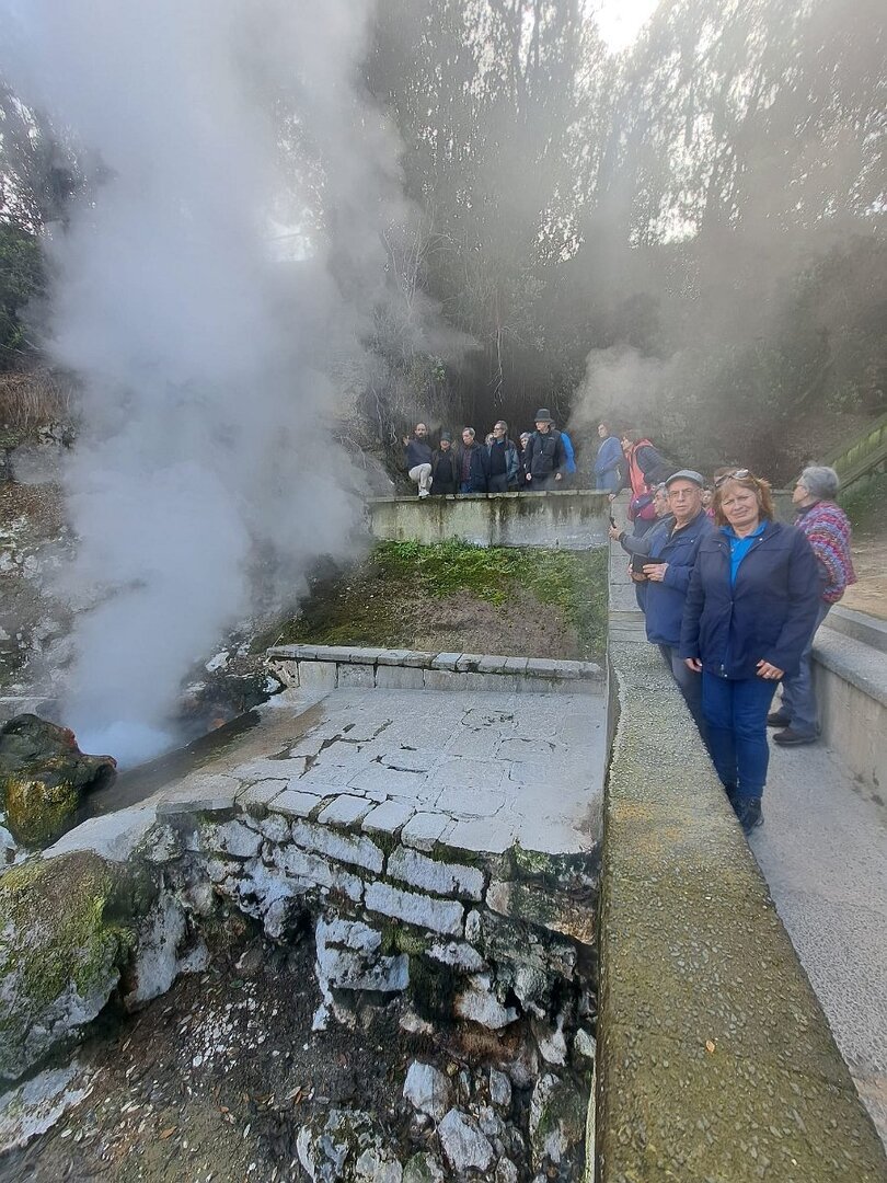 De seguida dirigimo-nos às Furnas, com passagem pelas suas caldeiras, em constante ebulição, numa viva demonstração da origem vulcânica destas ilhas. Houve quem bebesse água das várias fontes existentes (mas fresquinha!), uma água, segundo os nossos condutores/guias, à qual não faltam propriedades benéficas para a nossa saúde.