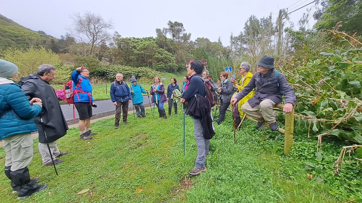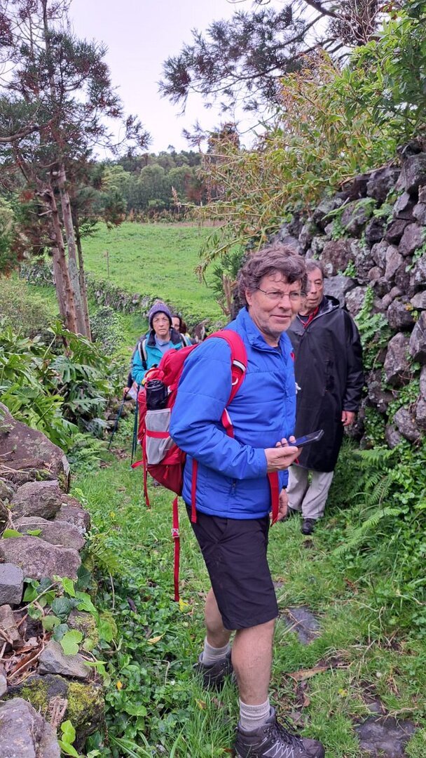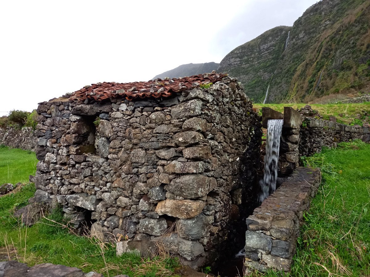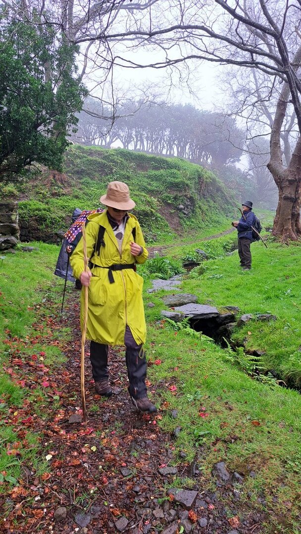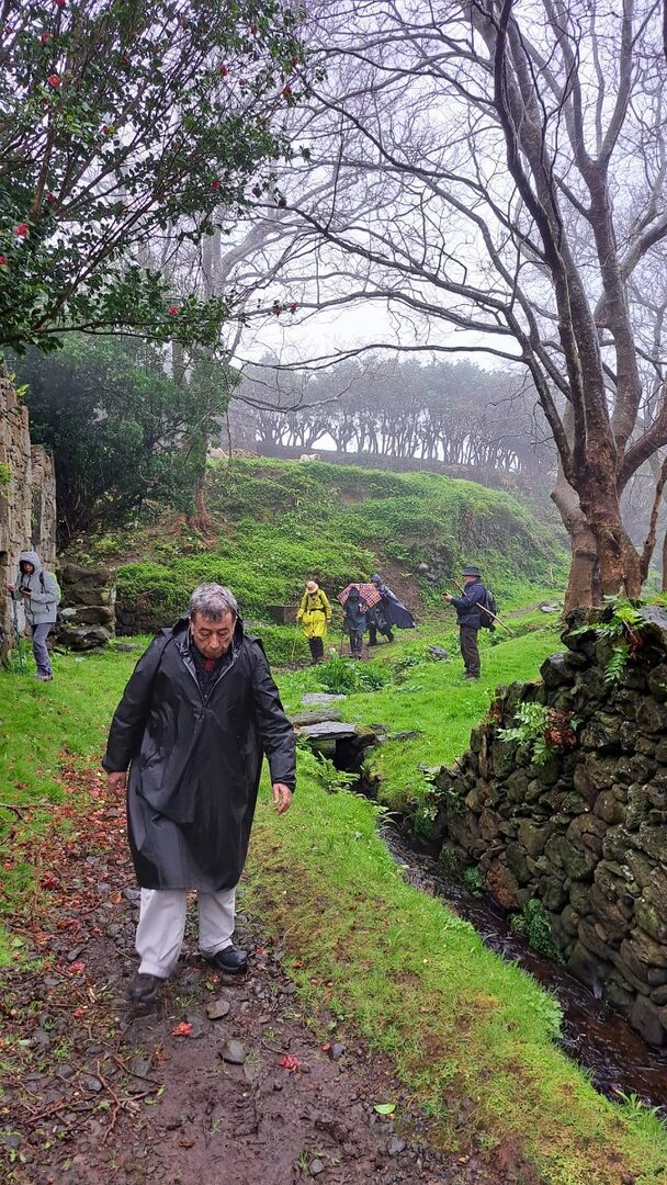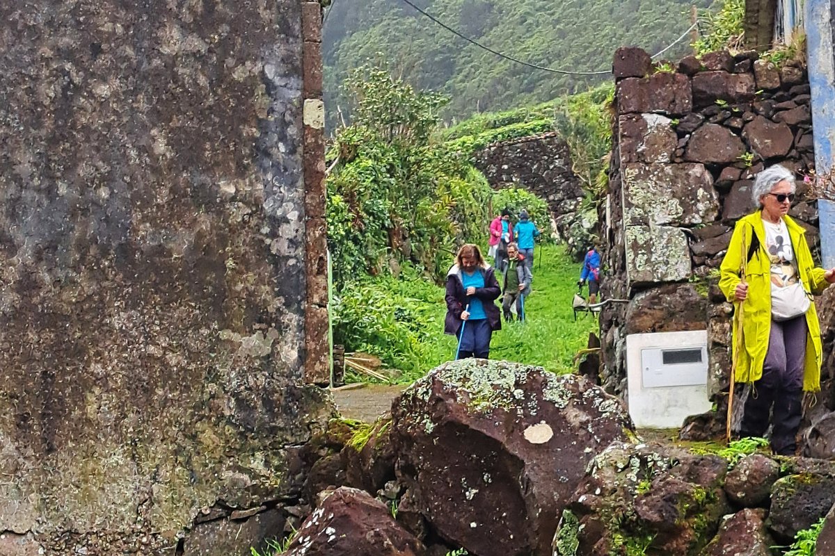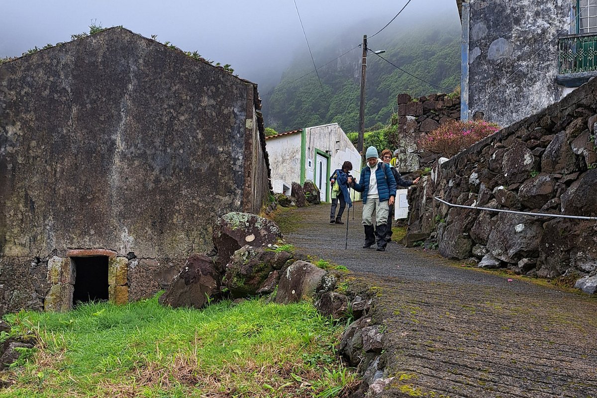 O que não contávamos era com as condições da descida para a Fajãzinha, em calçada rústica, que nos ficará na memória como uma das mais difíceis que nos tem aparecido, pelas condições em que se encontrava: íngreme, molhada, cheia de lama e folhas, extremamente escorregadia. Para estes caminheiros, um breve desafio, até com o seu lado divertido, temperado pela beleza do percurso, o edificado, os animais, a paisagem, o contacto sempre interessante com as (poucas) pessoas que connosco se cruzaram.