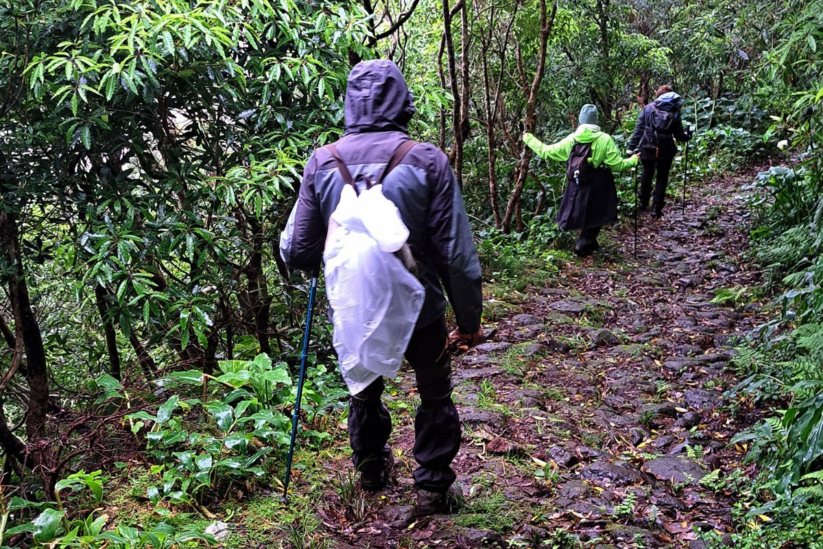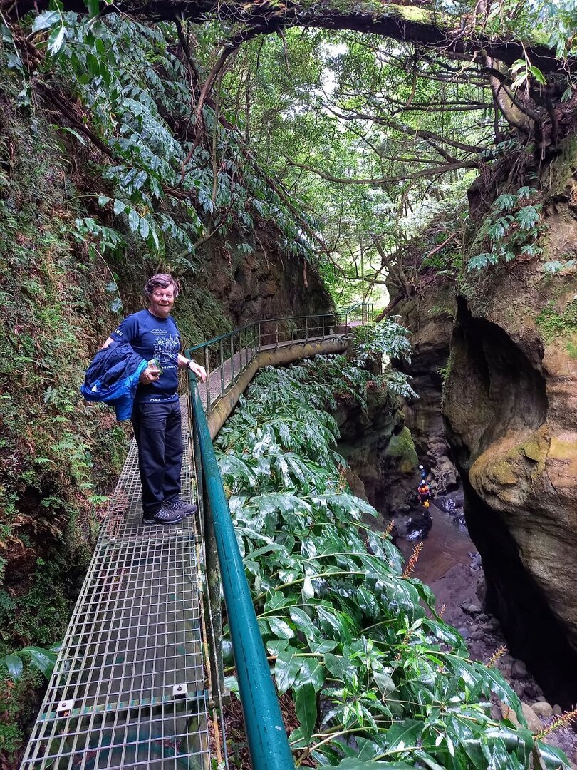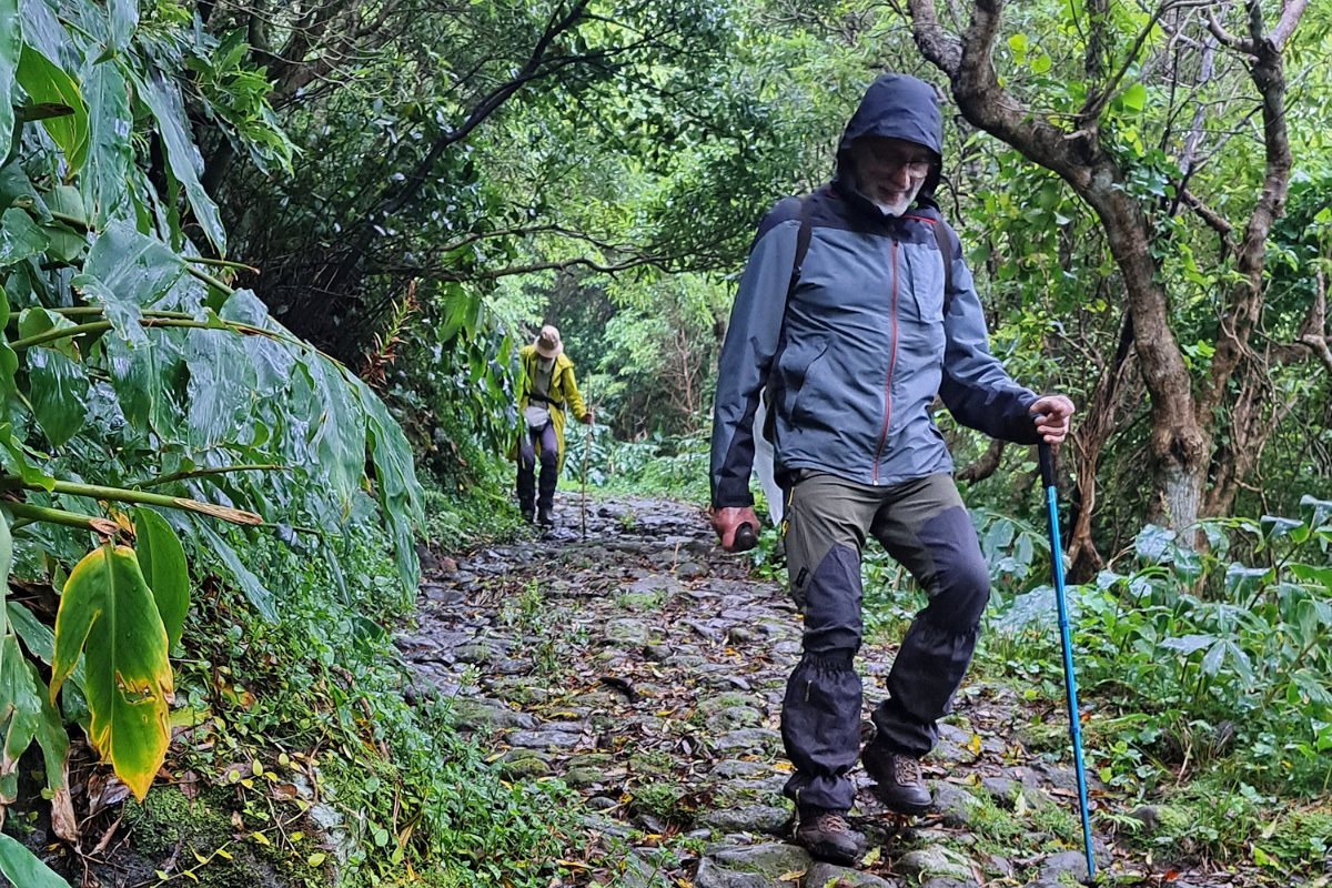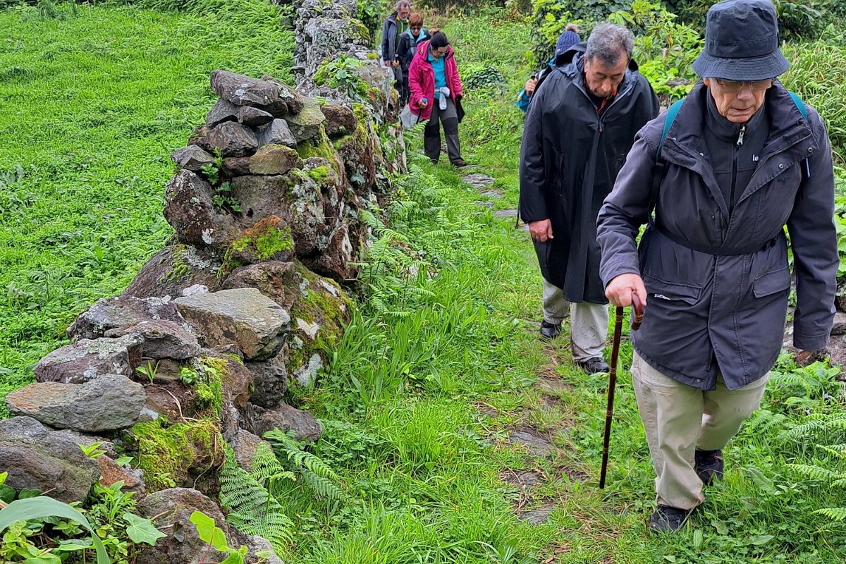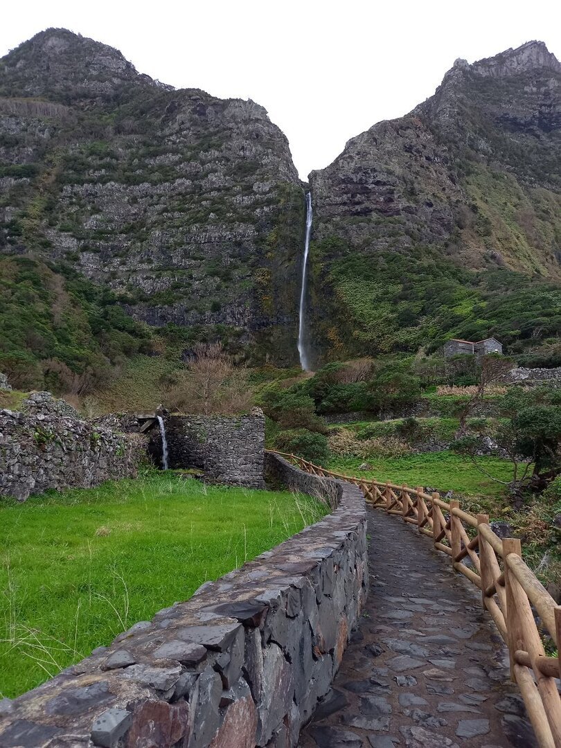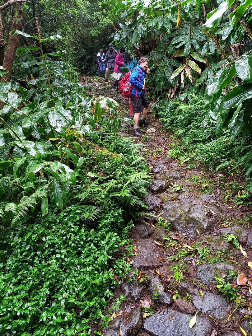 O que não contávamos era com as condições da descida para a Fajãzinha, em calçada rústica, que nos ficará na memória como uma das mais difíceis que nos tem aparecido, pelas condições em que se encontrava: íngreme, molhada, cheia de lama e folhas, extremamente escorregadia. Para estes caminheiros, um breve desafio, até com o seu lado divertido, temperado pela beleza do percurso, o edificado, os animais, a paisagem, o contacto sempre interessante com as (poucas) pessoas que connosco se cruzaram.