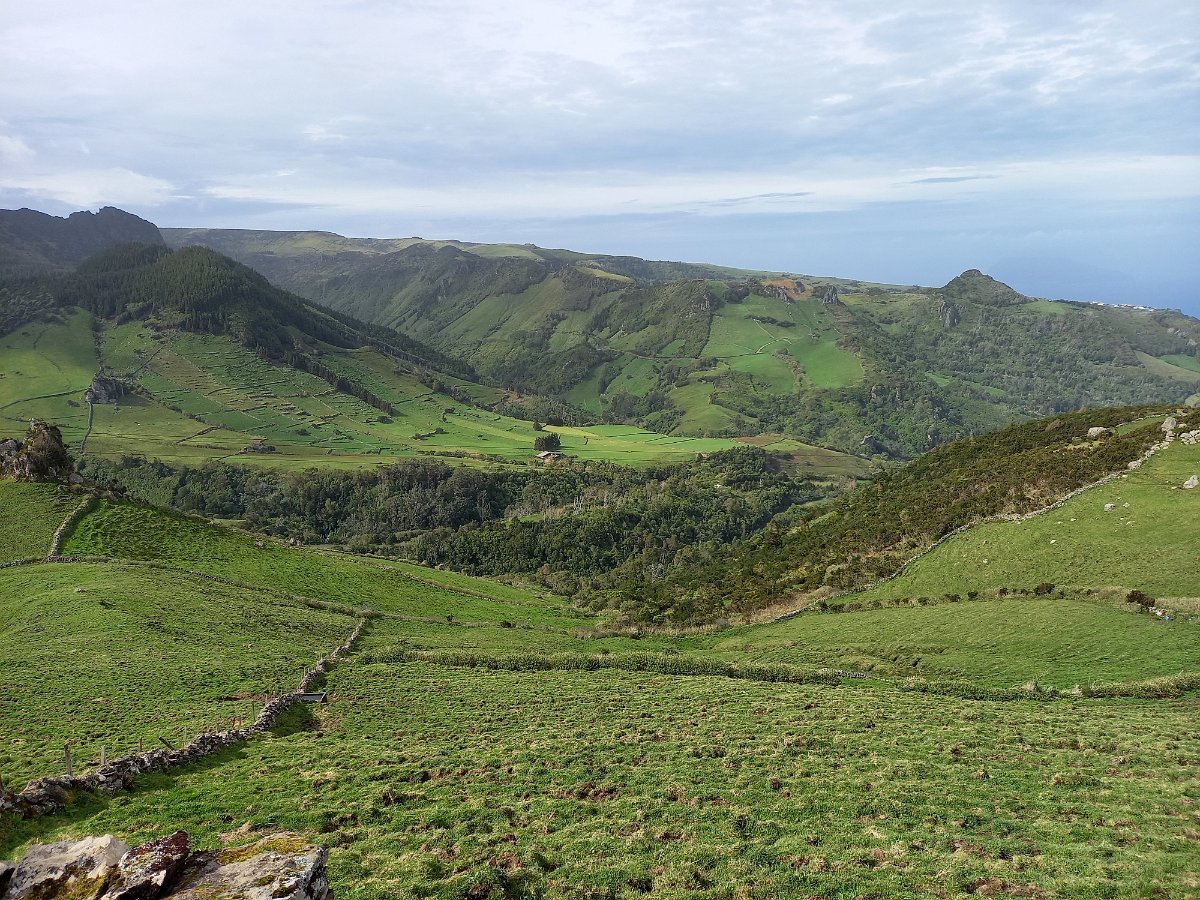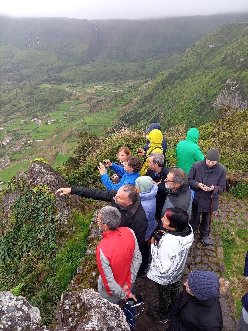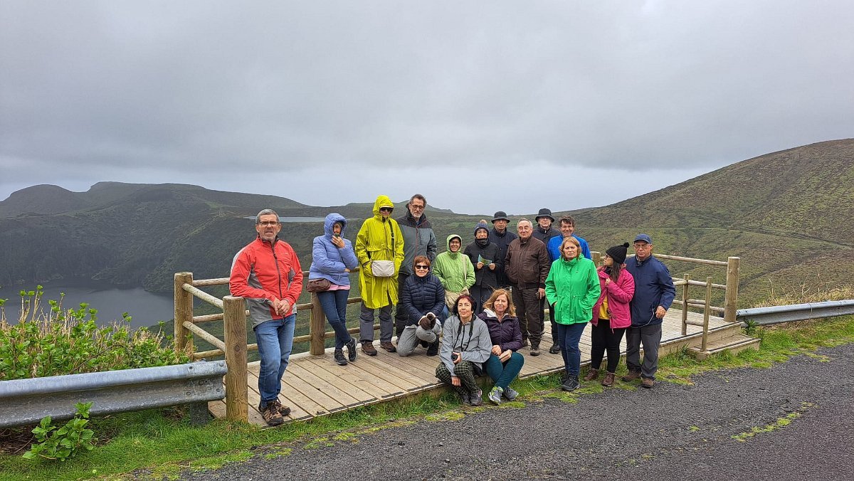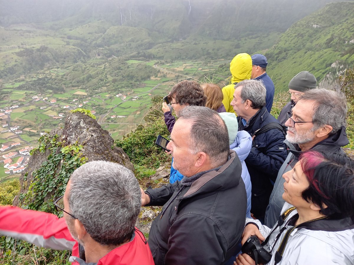 Largadas as malas, acomodamo-nos em duas carrinhas, semelhantes às anteriores, mas conduzidas agora pelo Sílvio Medina e pelo Chico, partindo a explorar o interior da ilha, com paragens nos pontos de vista mais interessantes e nas várias lagoas: Pico da Casinha, Caldeira da Lomba, Miradouro da Pedrinha, Caldeira Rasa, Caldeira Seca, Caldeira Branca, Caldeira Negra e Caldeira Comprida, Miradouro Craveiro Lopes e Fajã Grande. Toda esta zona, frequentemente envolta em neblina, beneficiou nesse dia (embora frio e húmido) de uma atmosfera razoavelmente limpa, o que nos permitiu desfrutar da sua cativante beleza.
