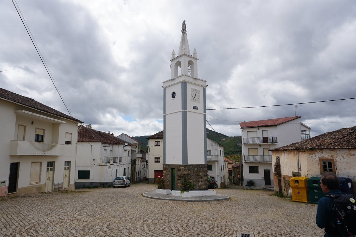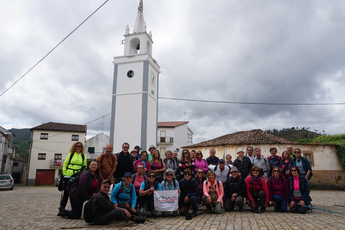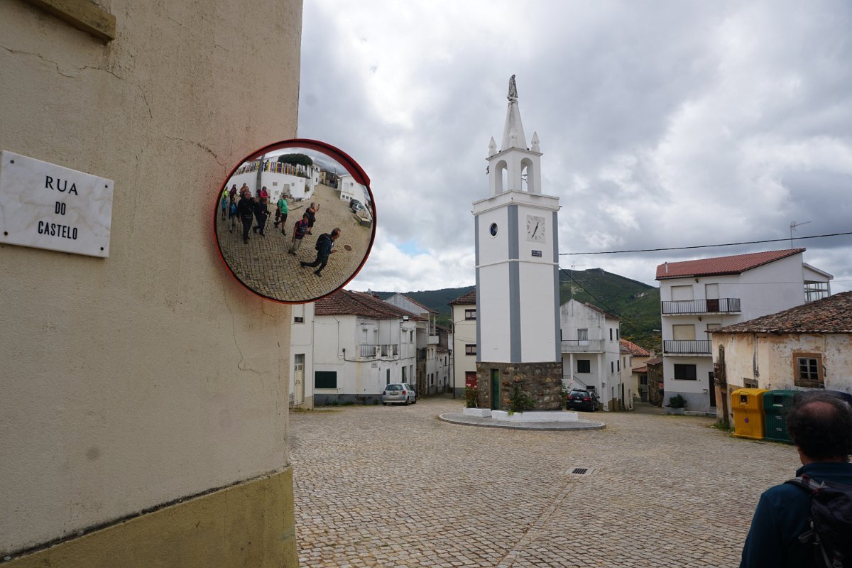 Um pouco adiante fizemos uma curta pausa, para a foto de grupo, na “Torre do Relógio” ou “Torre sineira”, curiosa construção implantada bem no centro de uma pequena praça. A torre fez parte integrante da primeira Igreja Matriz (Igreja Velha) com o campanário de Nossa Senhora de Fátima, entretanto demolida.