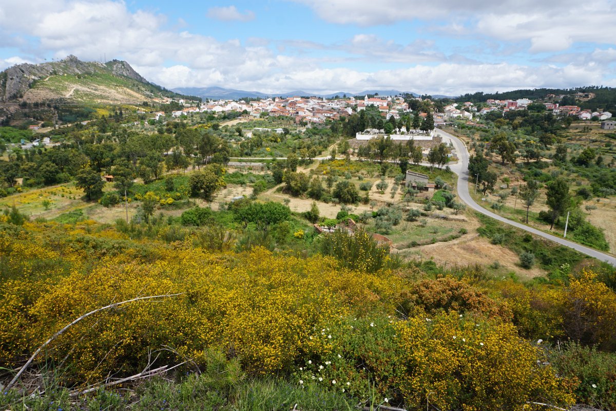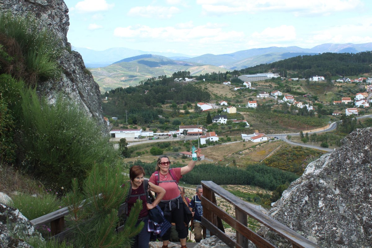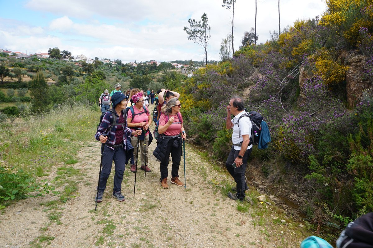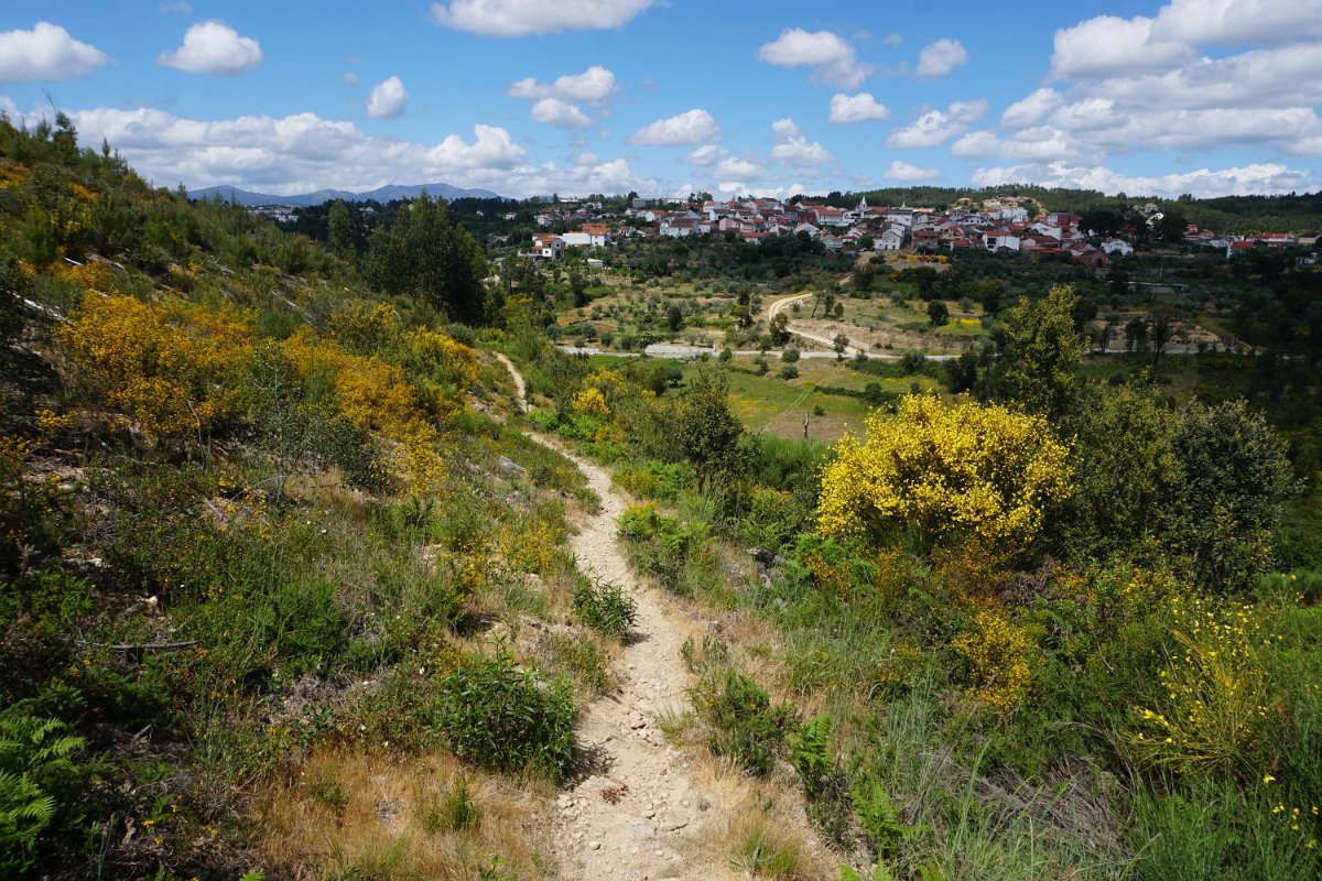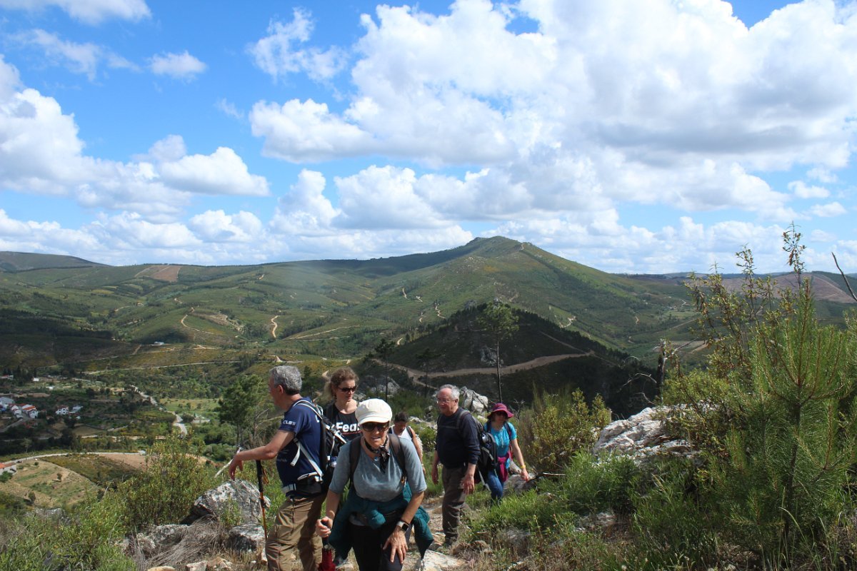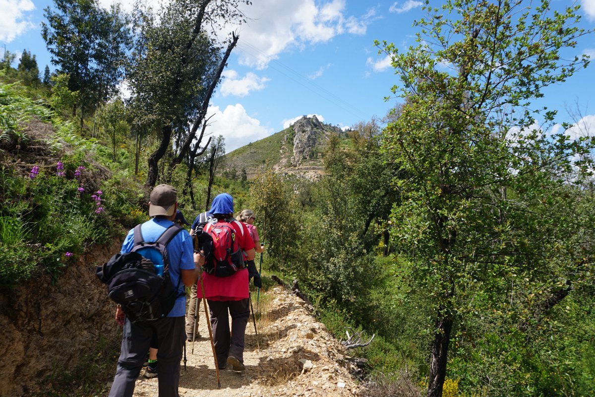 Depois de deixar a aldeia escolhemos seguir o percurso no sentido dos ponteiros do relógio, rumando à “Cascata da Fraga da Água d’Alta” percorrendo caminhos rurais, que nos proporcionaram a vista da aldeia com o enorme maciço rochoso do Cabeço do Mosqueiro a servir de pano de fundo, recordando-nos que essa seria com certeza a maior dificuldade deste percurso.
