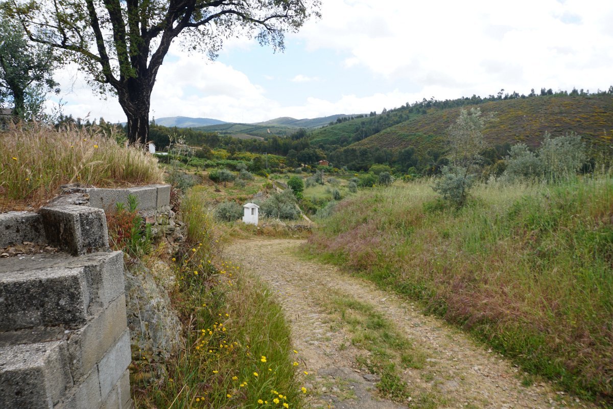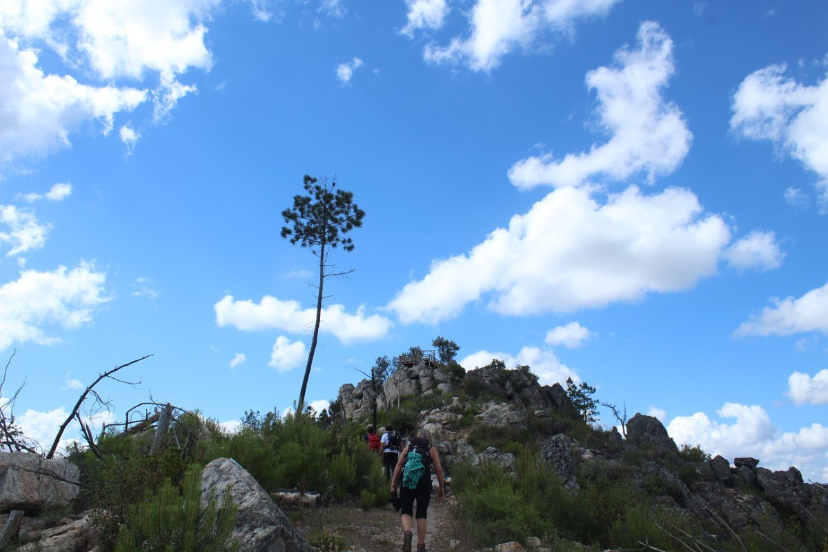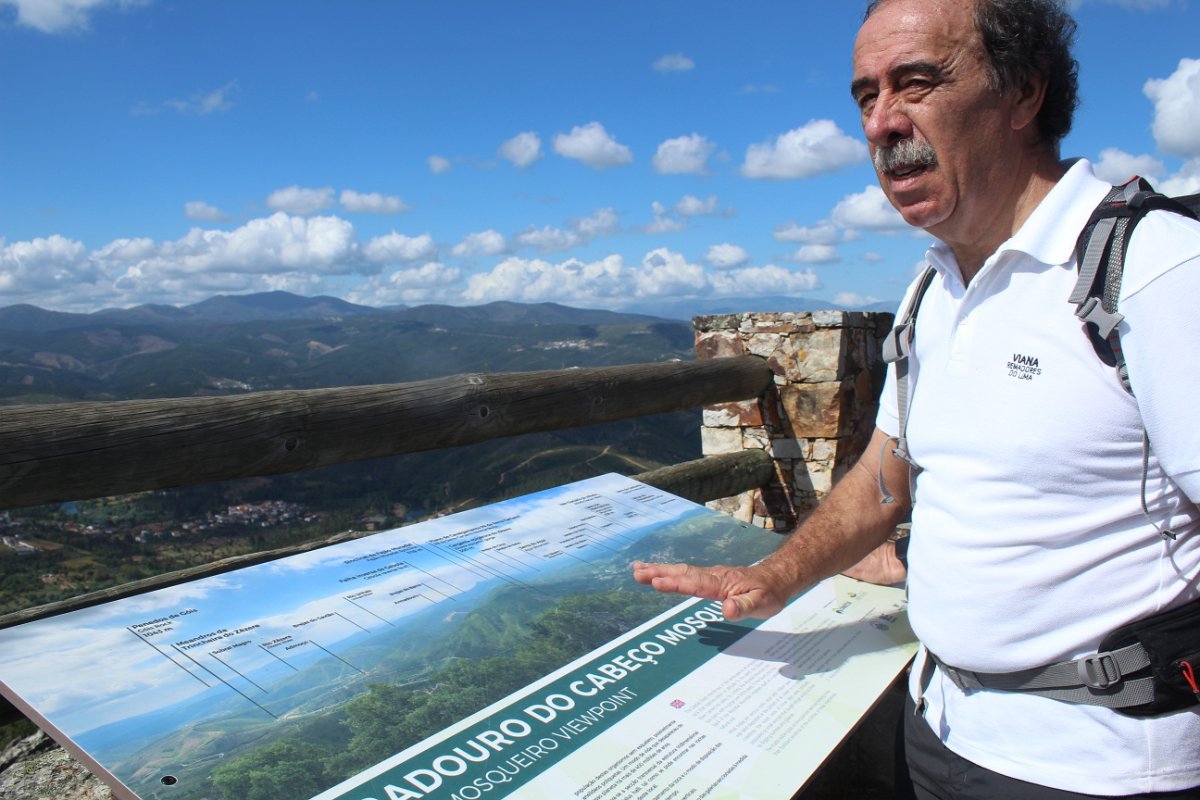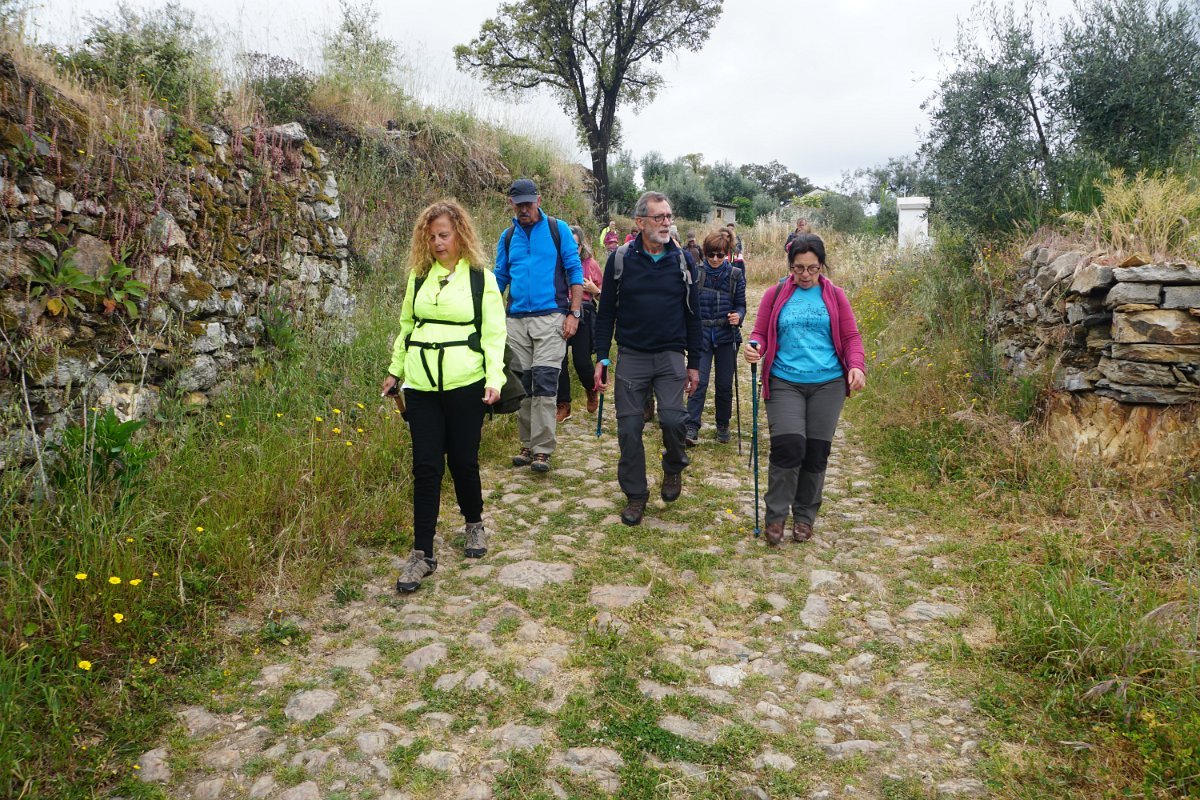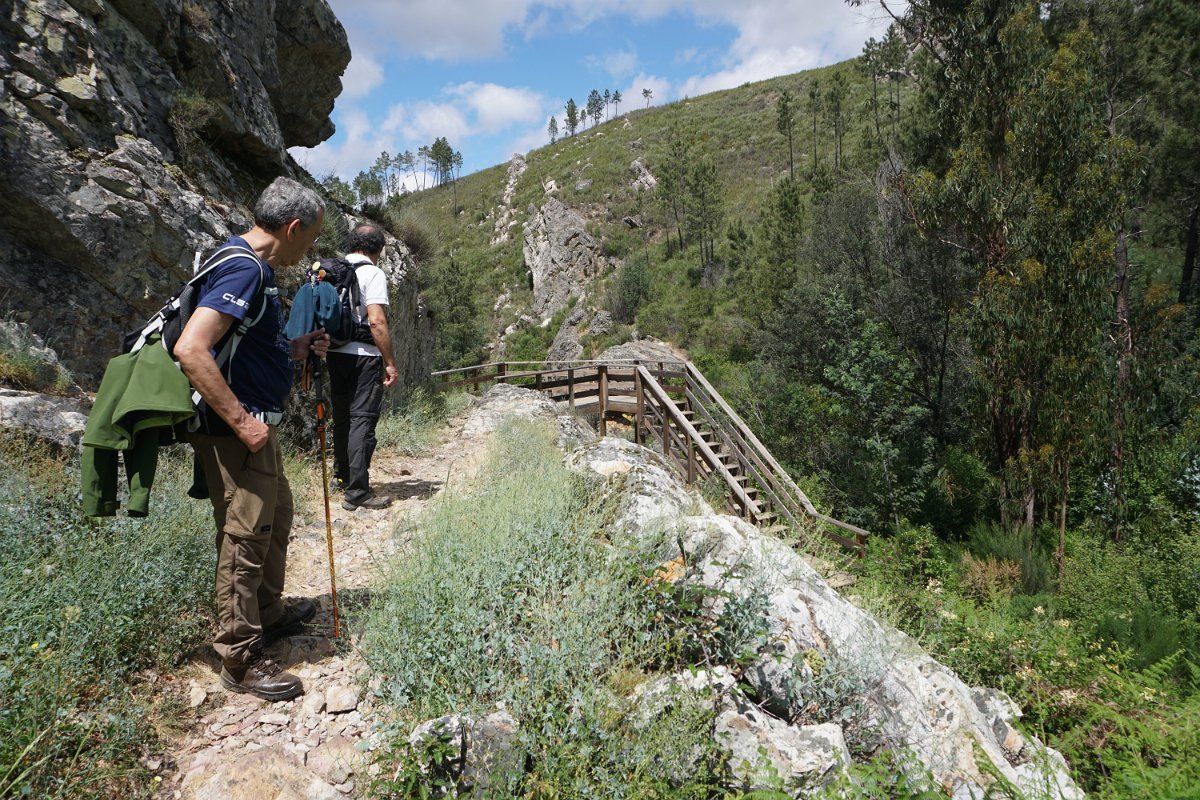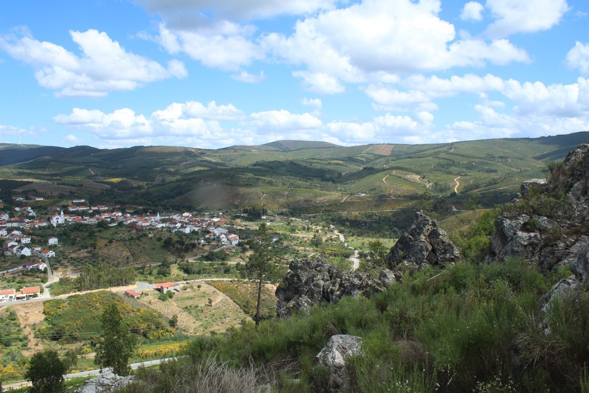 Depois de deixar a aldeia escolhemos seguir o percurso no sentido dos ponteiros do relógio, rumando à “Cascata da Fraga da Água d’Alta” percorrendo caminhos rurais, que nos proporcionaram a vista da aldeia com o enorme maciço rochoso do Cabeço do Mosqueiro a servir de pano de fundo, recordando-nos que essa seria com certeza a maior dificuldade deste percurso.