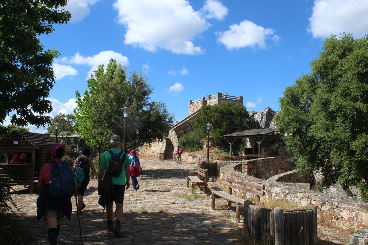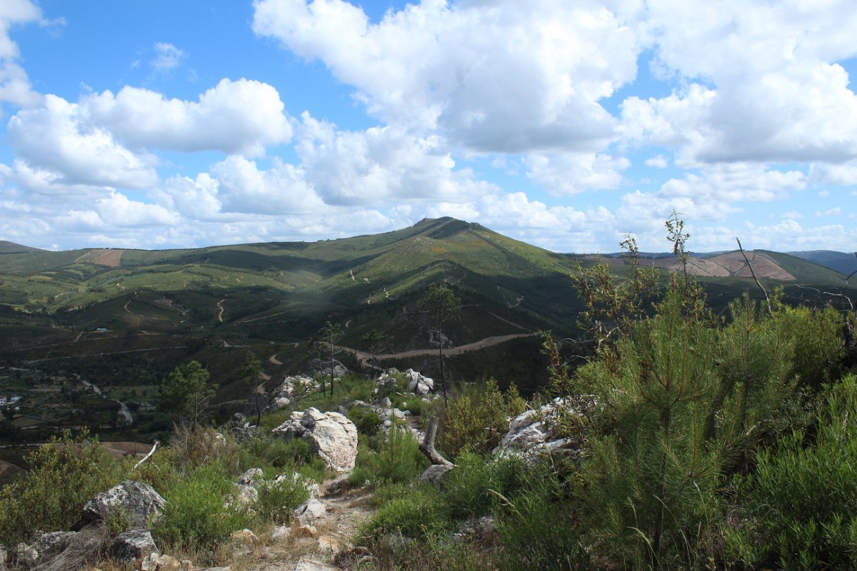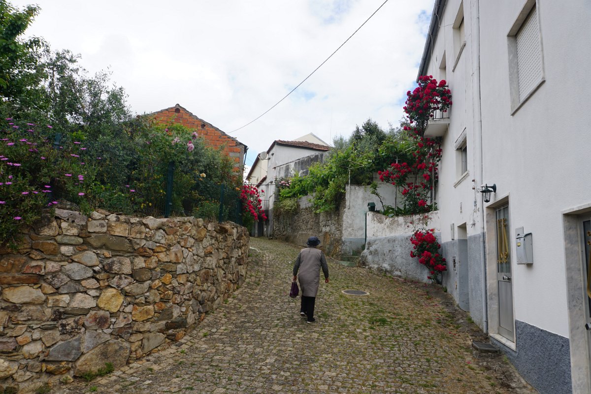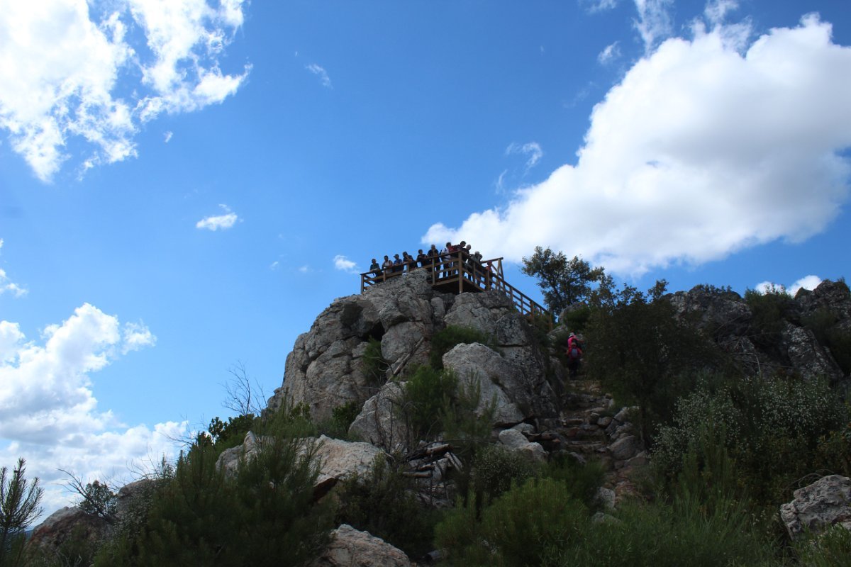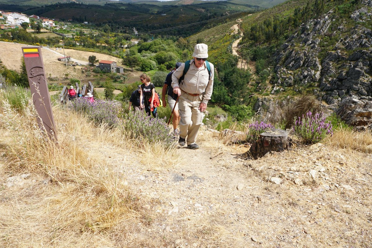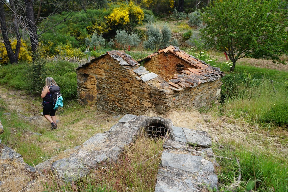 Depois de deixar a aldeia escolhemos seguir o percurso no sentido dos ponteiros do relógio, rumando à “Cascata da Fraga da Água d’Alta” percorrendo caminhos rurais, que nos proporcionaram a vista da aldeia com o enorme maciço rochoso do Cabeço do Mosqueiro a servir de pano de fundo, recordando-nos que essa seria com certeza a maior dificuldade deste percurso.