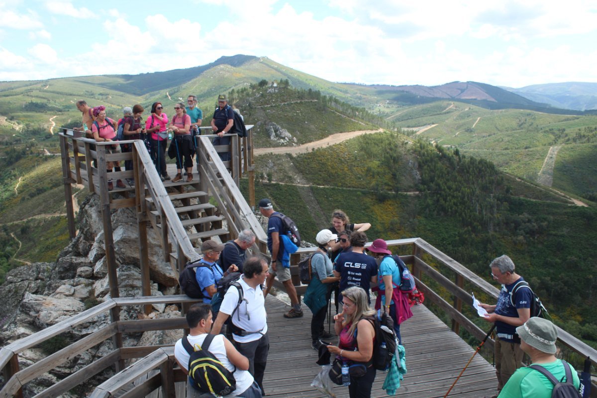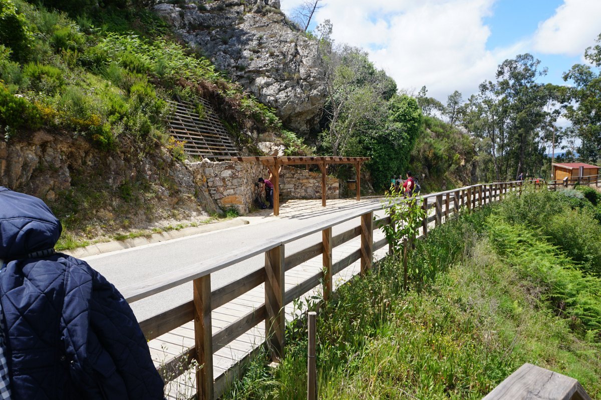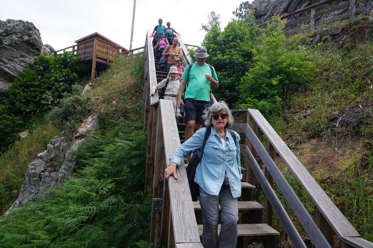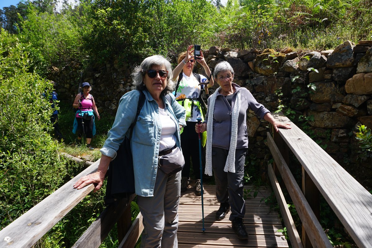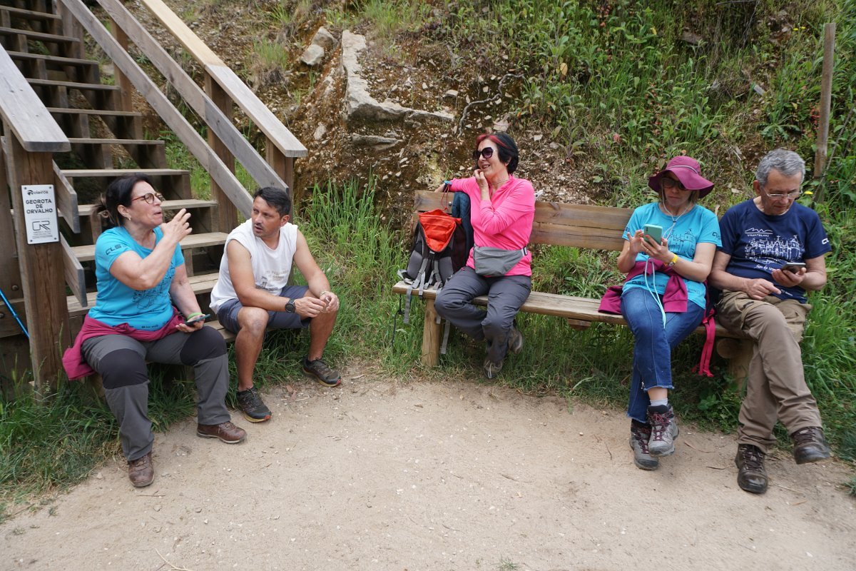 Não foi sozinha, pois alguns dos caminheiros optaram por também encurtar o percurso, não continuando para os passadiços de acesso ao ribeiro e depois ao miradouro do Mosqueiro, que aparecia imponente do outro lado do ribeiro, mais ao fundo.