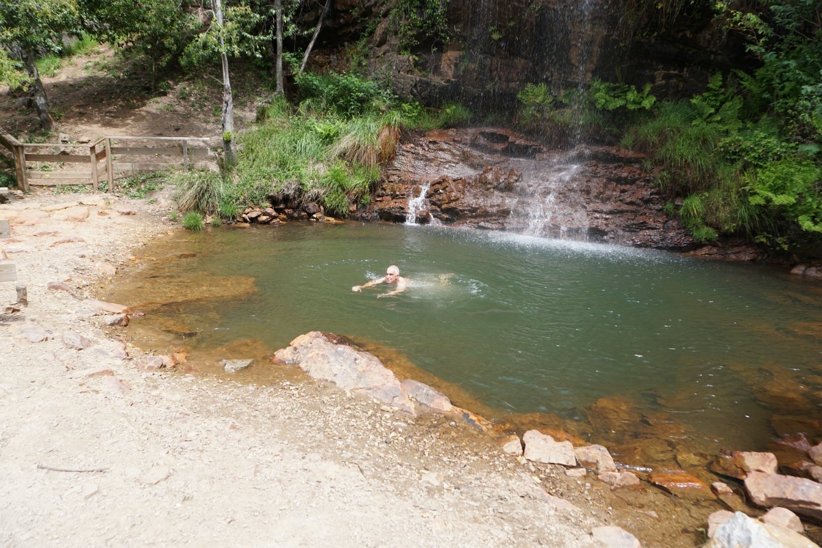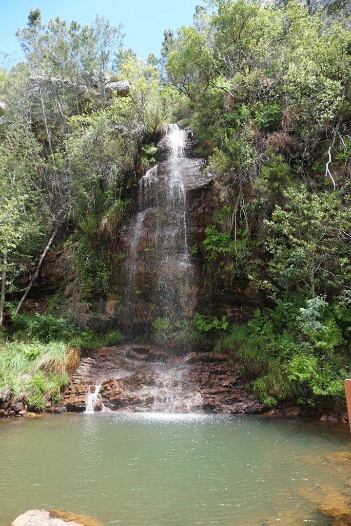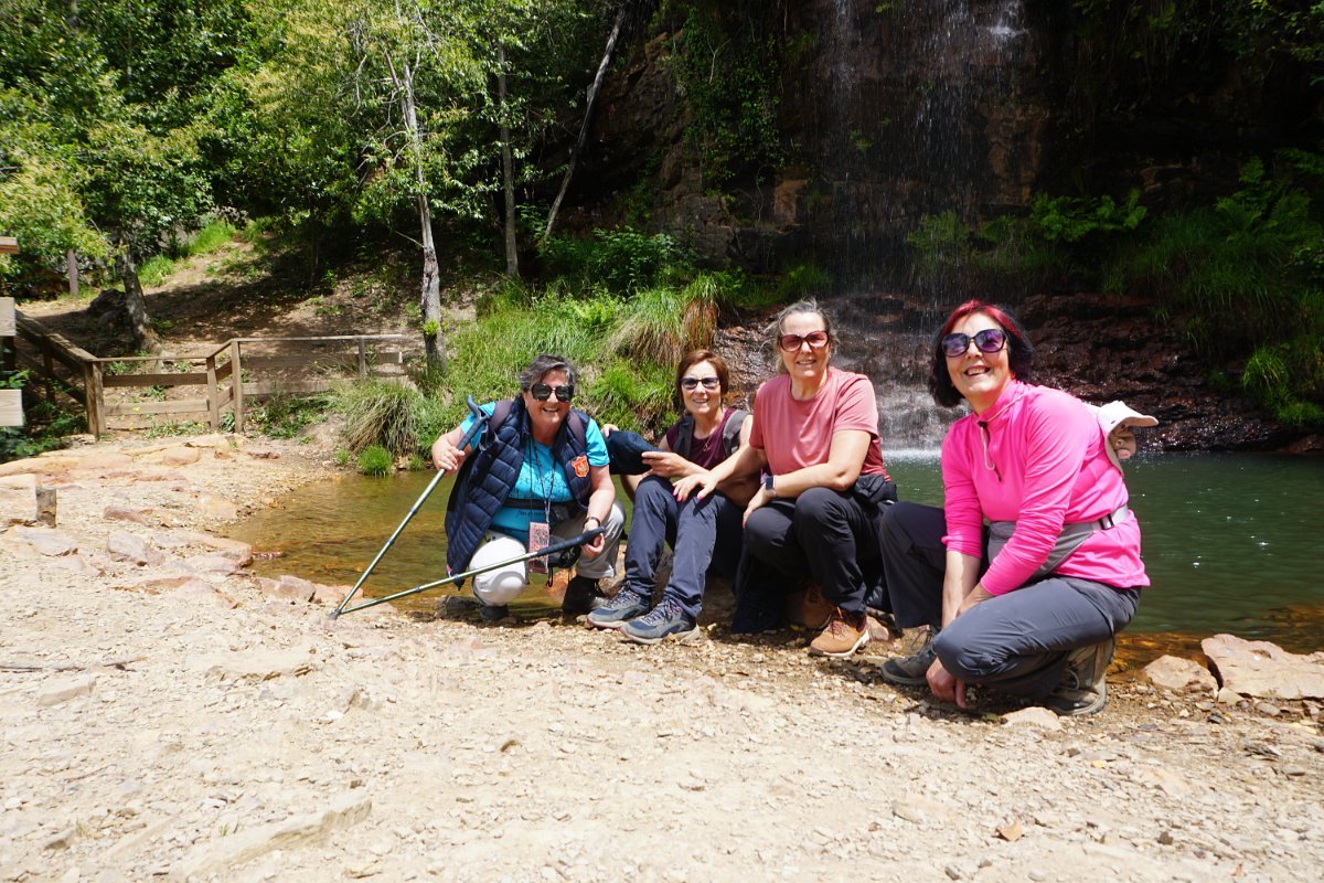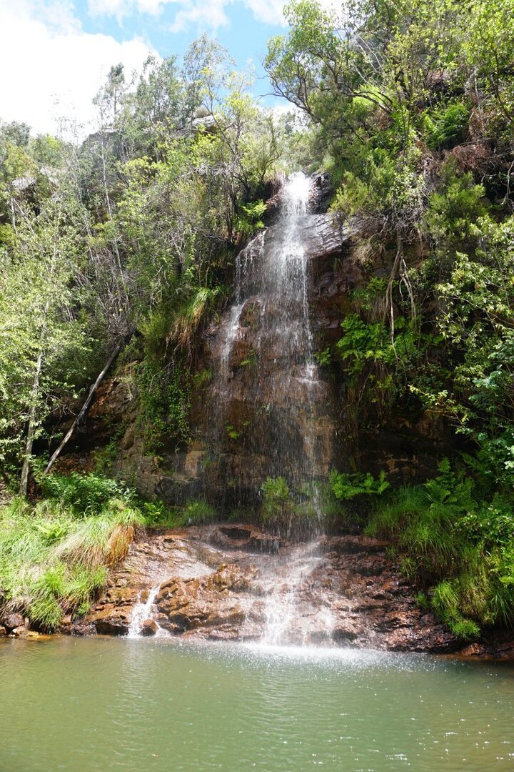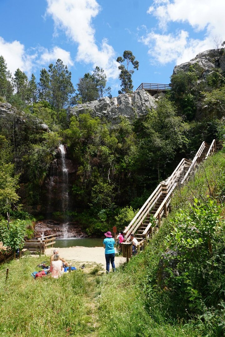 A cascata é um encanto pelo seu enquadramento natural, com árvores frondosas ao redor e com a água a transpor os 25m de desnível, vencidos por uma sucessão de três véus de água turbulentos e crepitantes. Foi neste local idílico que metemos qualquer coisa à boca e o mais aventureiro Cocas se refrescou junto à queda de água da cascata. Não houve mais corajosos a entrar na água bem fria da cascata.