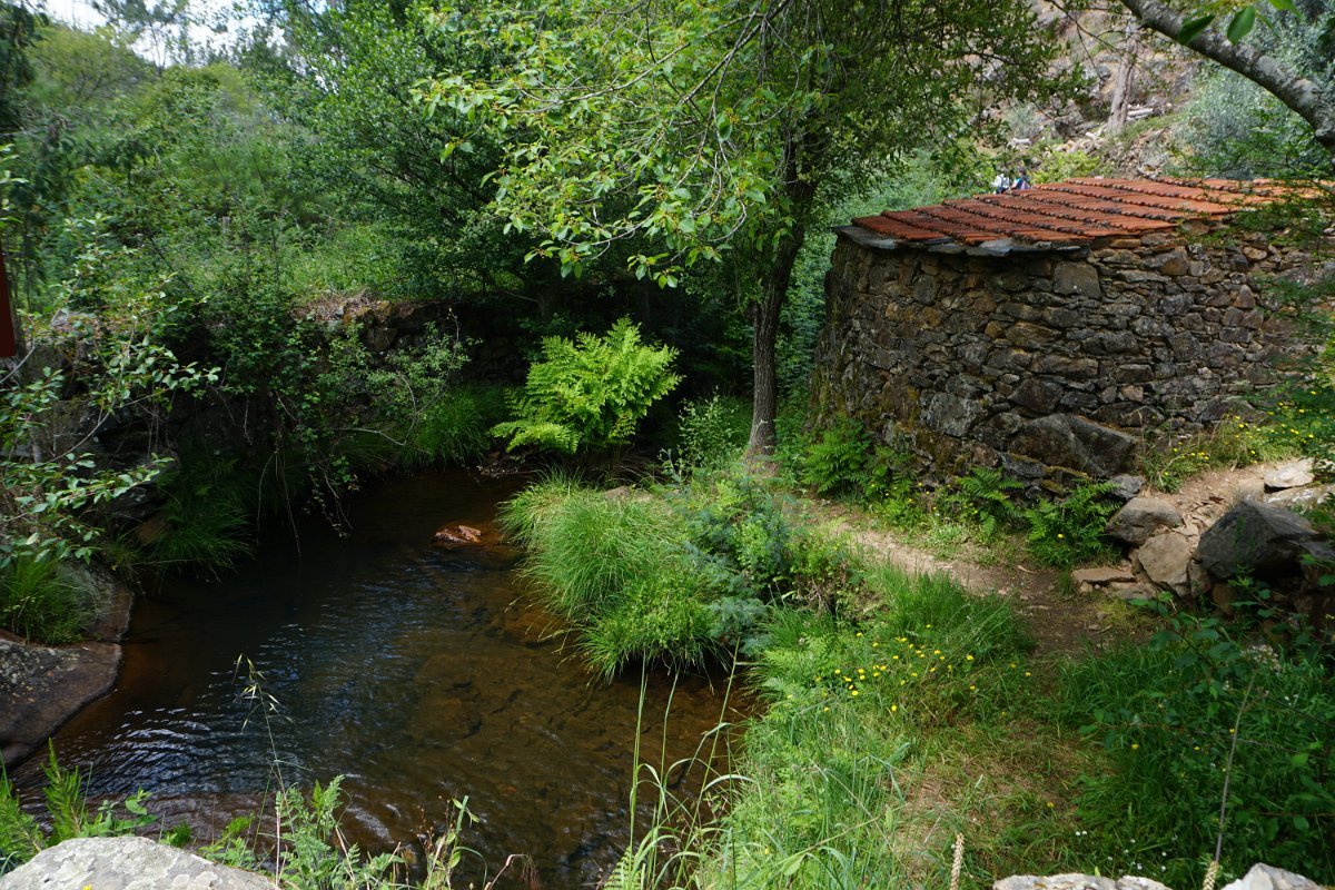 Chegamos à Lagoa das Lontras, onde se localiza também um moinho em ruinas. Aí houve um ligeiro engano, pois continuamos a seguir o curso de água, pelo que tivemos que retroceder, pois não é esse caminho certo, mas sim virar à direita e iniciar uma exigente subida em direção ao cruzamento onde tínhamos passado anteriormente, antes de descer para a cascata.