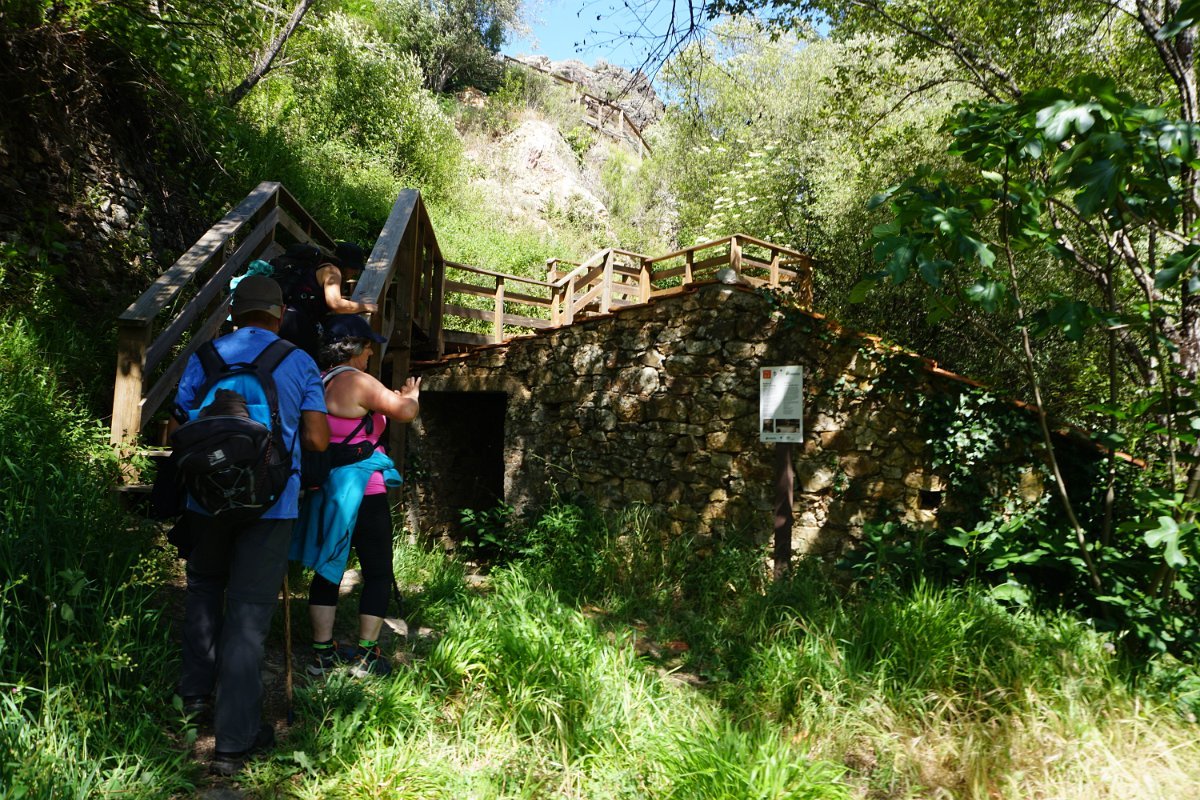 Continuamos a ladear o ribeiro do Orvalho, percorrendo um complexo passadiço, que subia e descia ao longo da margem esquerda do ribeiro, descendo finalmente para o cruzar no Forno das Mouras, seguindo depois pela margem direita até um moinho que ostentava os versos “Moinho que estás cantando / A tua velha canção / Contente porque vais dando / Farinha p’ro nosso pão / Gira o rodízio sem descansar / Á volta a espuma da cor do mar / A água salta sempre a correr / E a mó da pedra sempre a correr”.