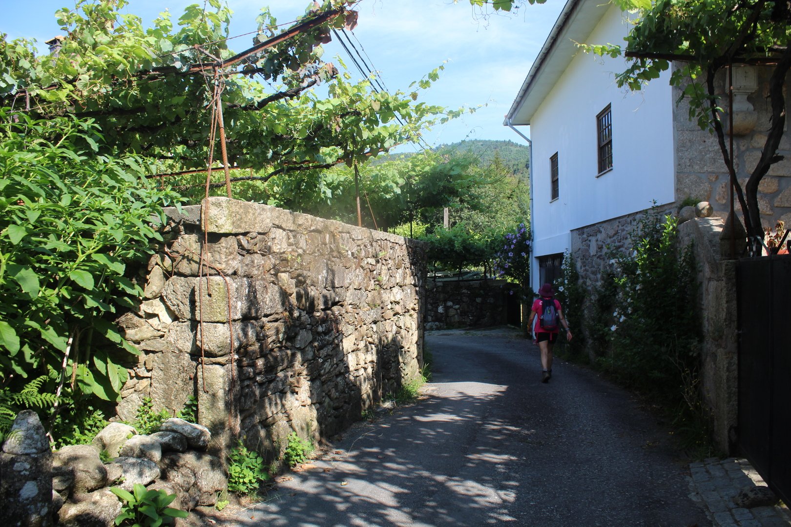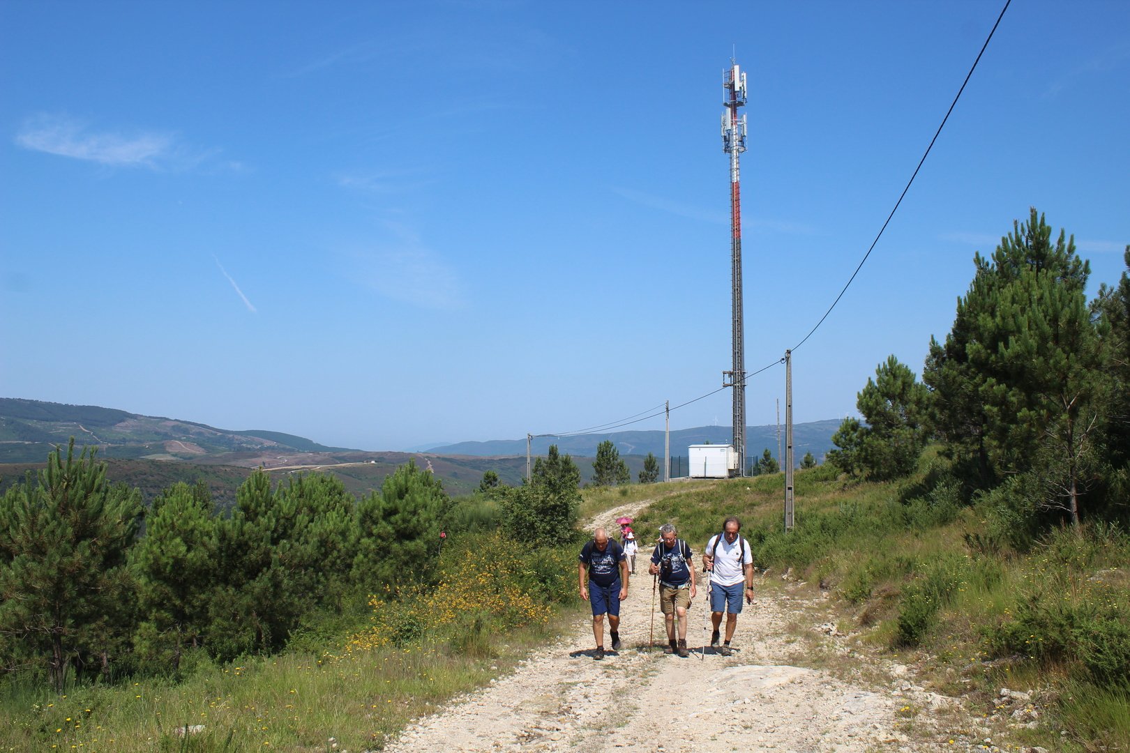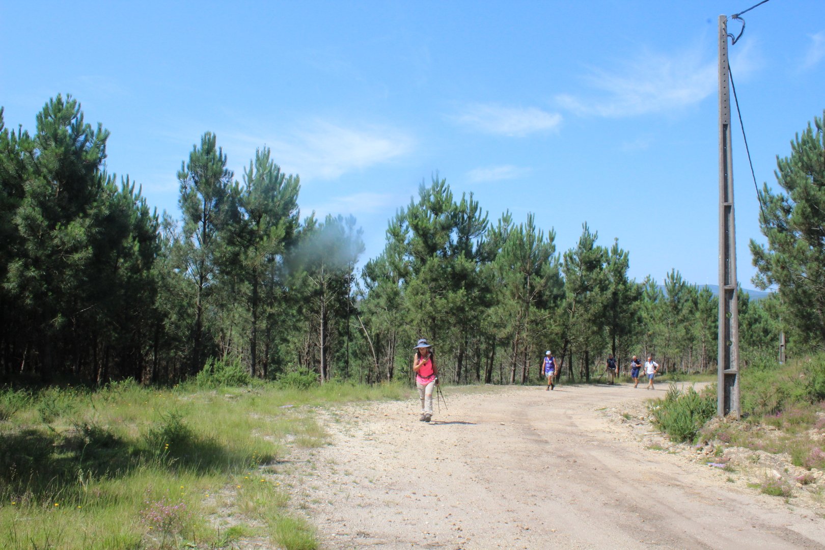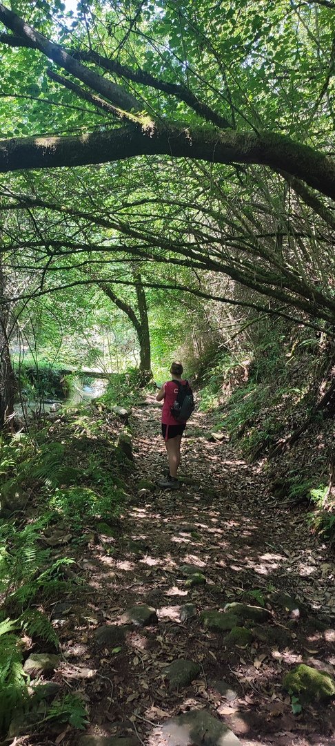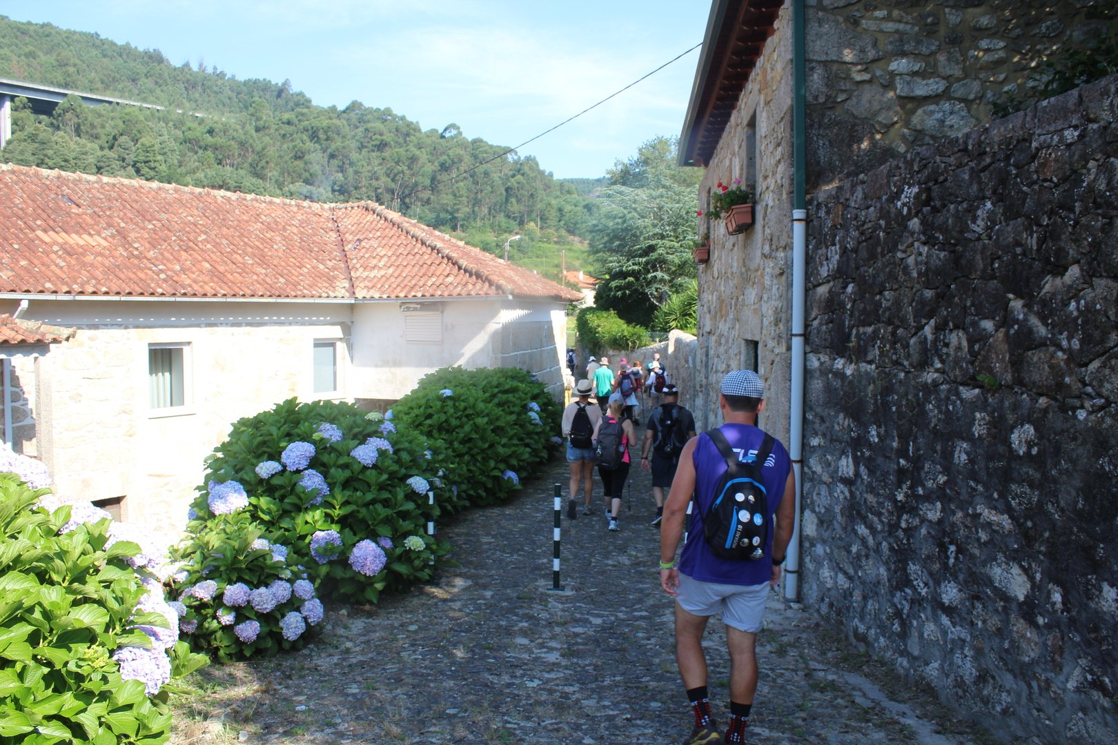 Iniciamos o trilho partindo do Santuário de N. Sr. do Socorro na freguesia de Labruja (Ponte de Lima). Aqui se dirigiam as gentes da ribeira de Viana em tempos de aflição, atestado pelos numerosos ex-votos expostos no seu interior. Cruzamos os recém reconstruídos Moinhos da Várzea instalados no ribeiro de S. João assim como a zona envolvente, e logo depois a igreja Paroquial. Sempre subindo primeiro por entre o casario e logo depois nos embrenhamos numa mata até atingirmos a pequena capela de Sta. Cristina, local onde se fez breve pausa e reabastecimento. Atingimos a EN201 e caminhamos ao longo da mesma até chegarmos ao Alto da Portela Pequena onde virando á direita apanhamos um estradão florestal que nos levou até à casa Florestal de Portela Grande, local escolhido para realizarmos o almoço eram cerca das 12H45. Aqui neste local situa-se um dos mais emblemáticos do Caminho Central de Santiago. A subida que vinda da Labruja até aqui sendo bastante ingreme é referenciada como local de dificuldade elevada.