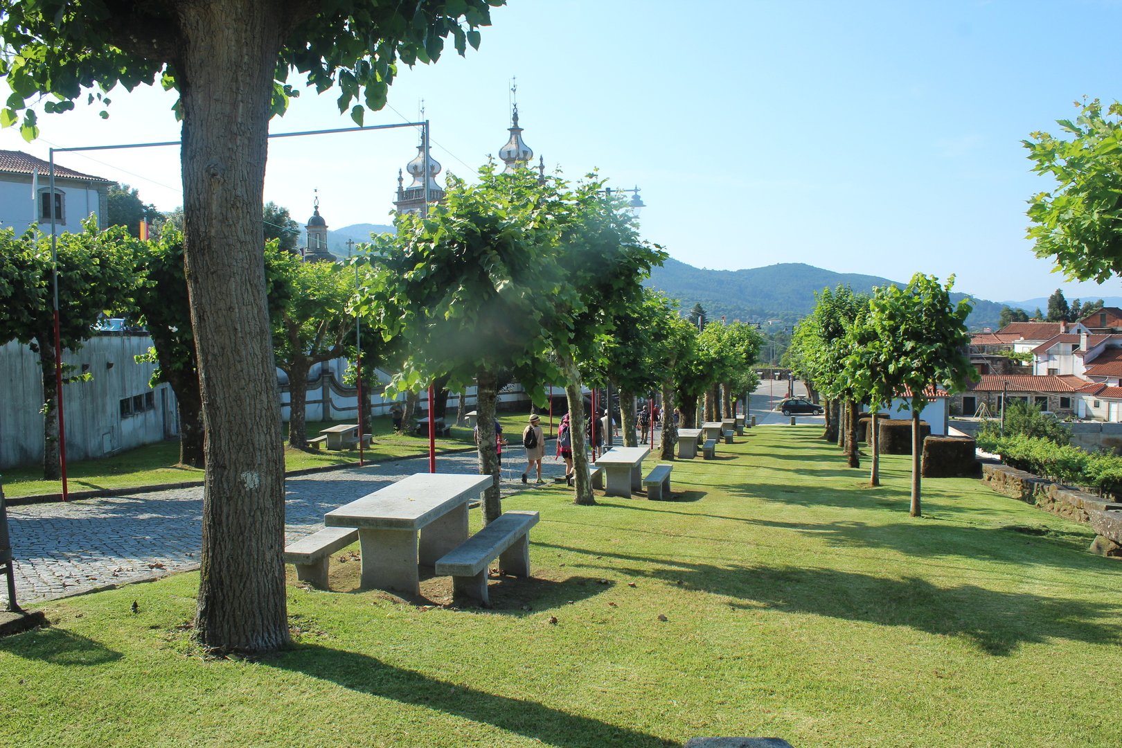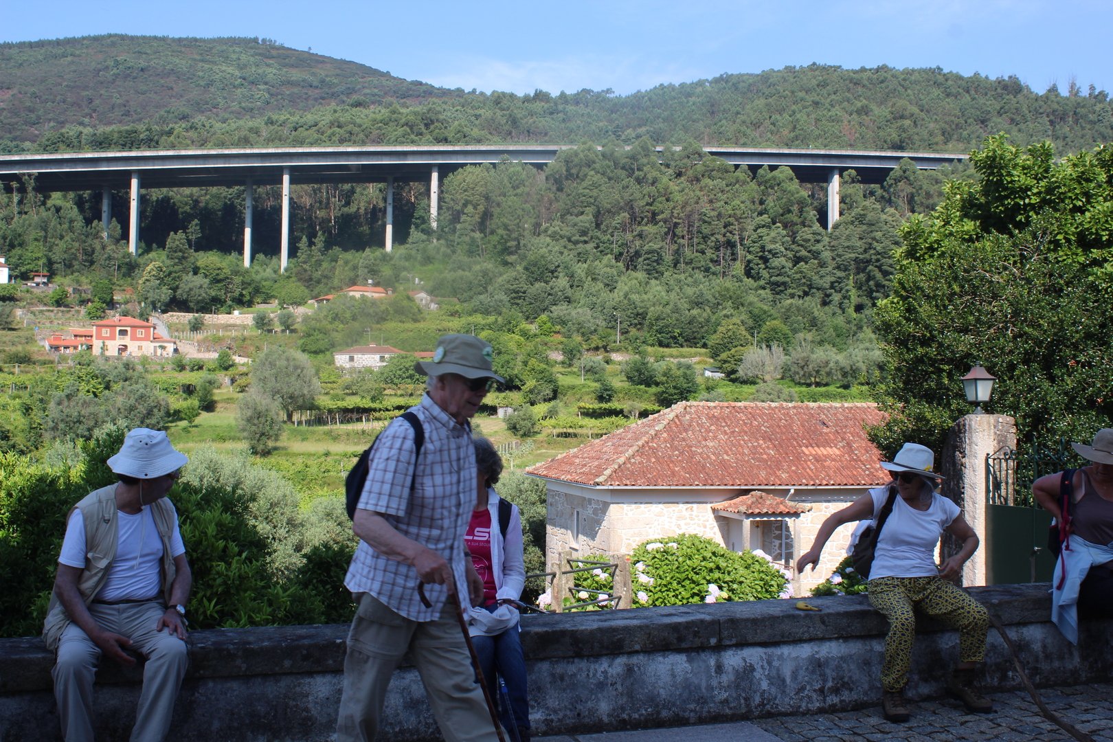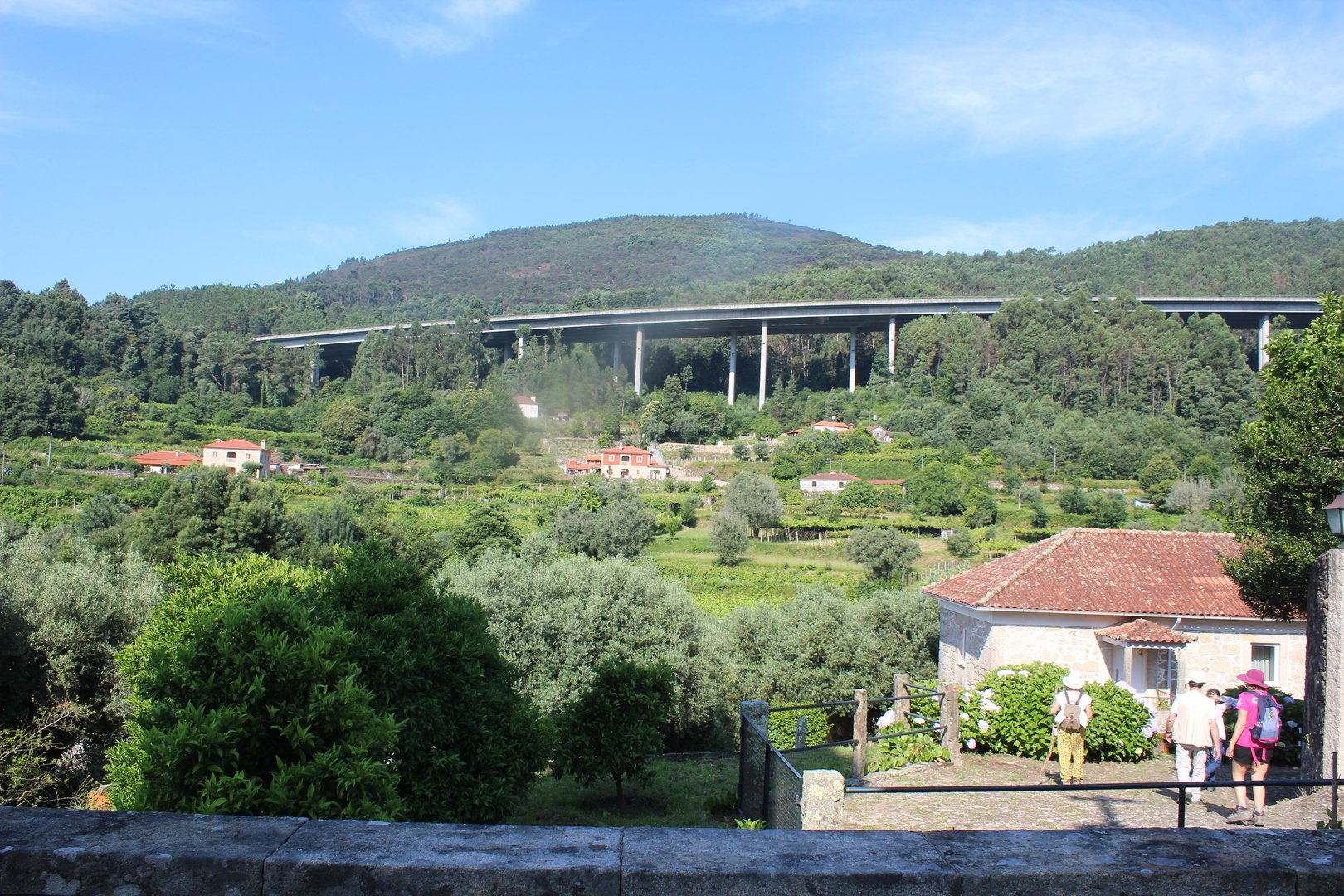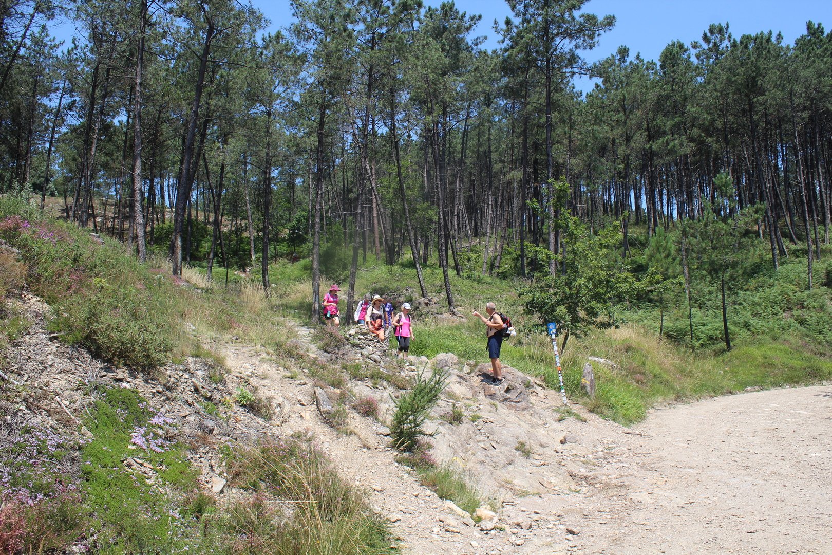 Iniciamos o trilho partindo do Santuário de N. Sr. do Socorro na freguesia de Labruja (Ponte de Lima). Aqui se dirigiam as gentes da ribeira de Viana em tempos de aflição, atestado pelos numerosos ex-votos expostos no seu interior. Cruzamos os recém reconstruídos Moinhos da Várzea instalados no ribeiro de S. João assim como a zona envolvente, e logo depois a igreja Paroquial. Sempre subindo primeiro por entre o casario e logo depois nos embrenhamos numa mata até atingirmos a pequena capela de Sta. Cristina, local onde se fez breve pausa e reabastecimento. Atingimos a EN201 e caminhamos ao longo da mesma até chegarmos ao Alto da Portela Pequena onde virando á direita apanhamos um estradão florestal que nos levou até à casa Florestal de Portela Grande, local escolhido para realizarmos o almoço eram cerca das 12H45. Aqui neste local situa-se um dos mais emblemáticos do Caminho Central de Santiago. A subida que vinda da Labruja até aqui sendo bastante ingreme é referenciada como local de dificuldade elevada.