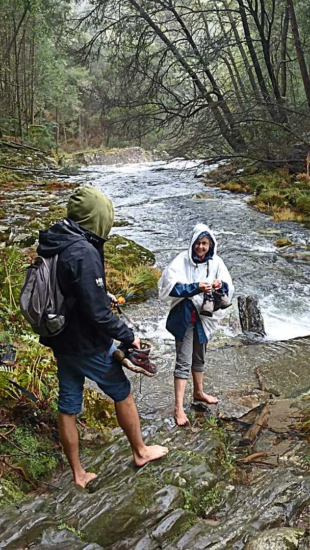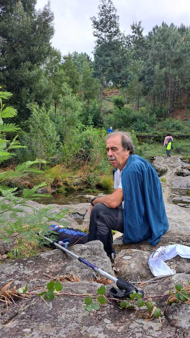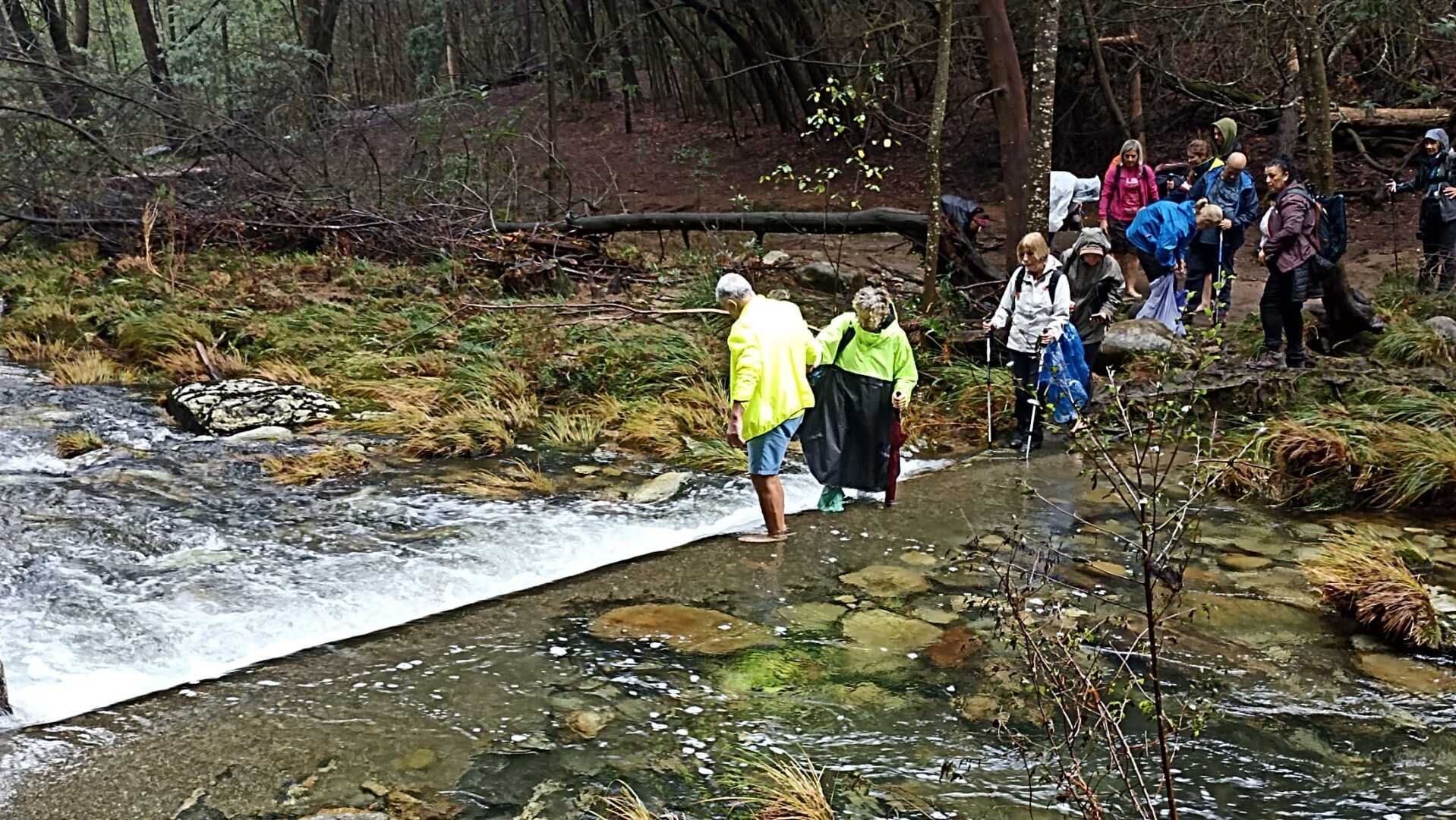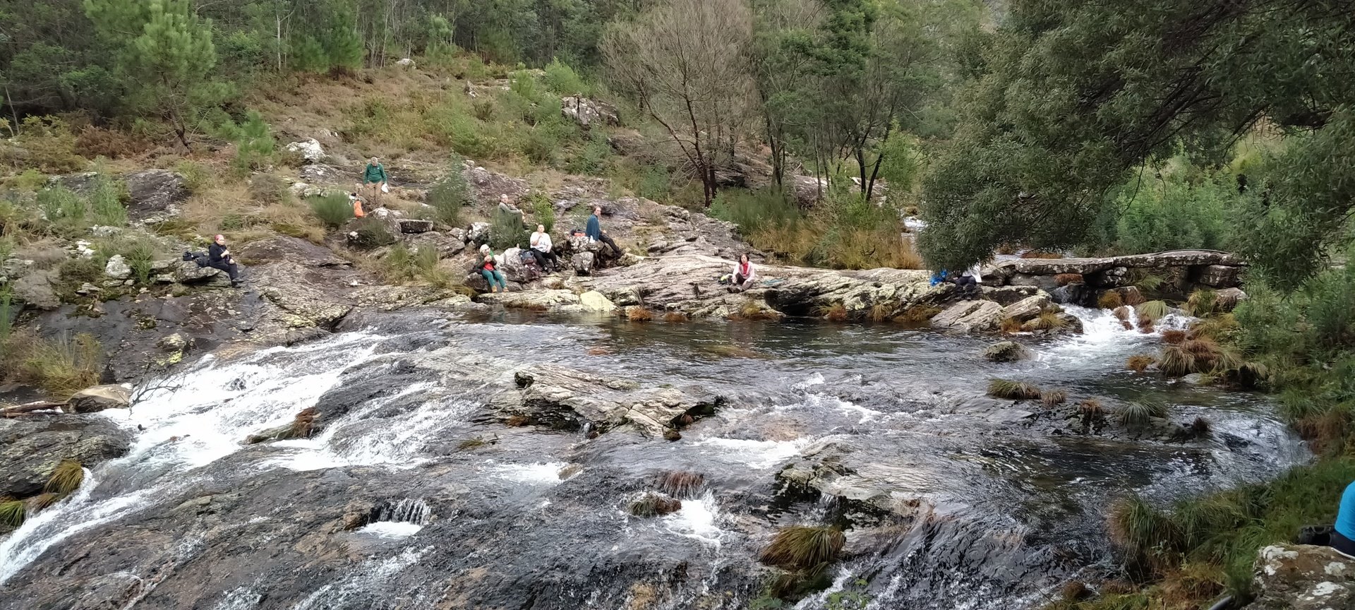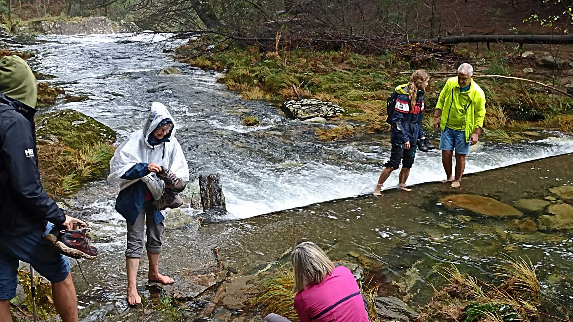 Ao chegarmos à cascata, e dado o elevado caudal do rio, alguns caminheiros optaram por descalçar as botas e atravessar o rio, enquanto outros, receando uma constipação, preferiram seguir por terra firme e encontrar-se connosco mais à frente.