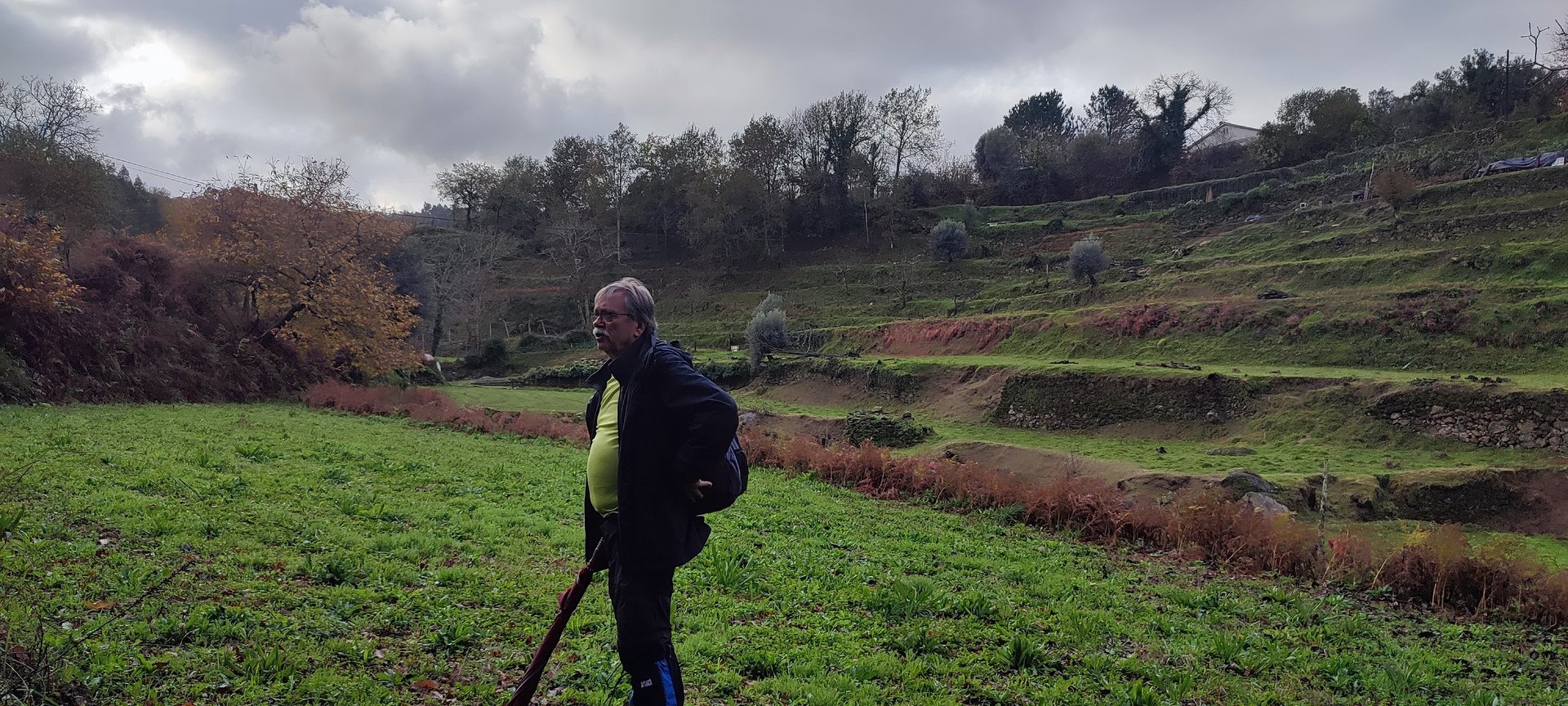 Partimos para a nossa caminhada contornando o mosteiro e, depois de atravessarmos a estrada nacional 203, seguimos o percurso pelo lugar da Porta, por entre campos de cultivo e casas, a maioria desabitadas.