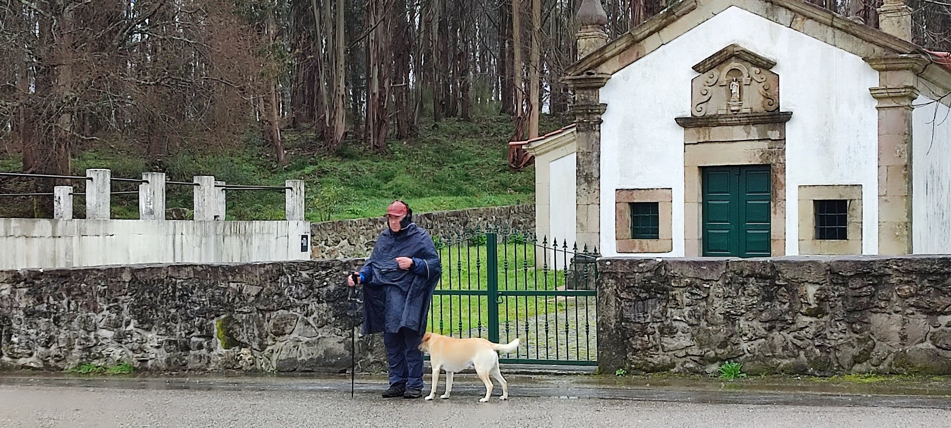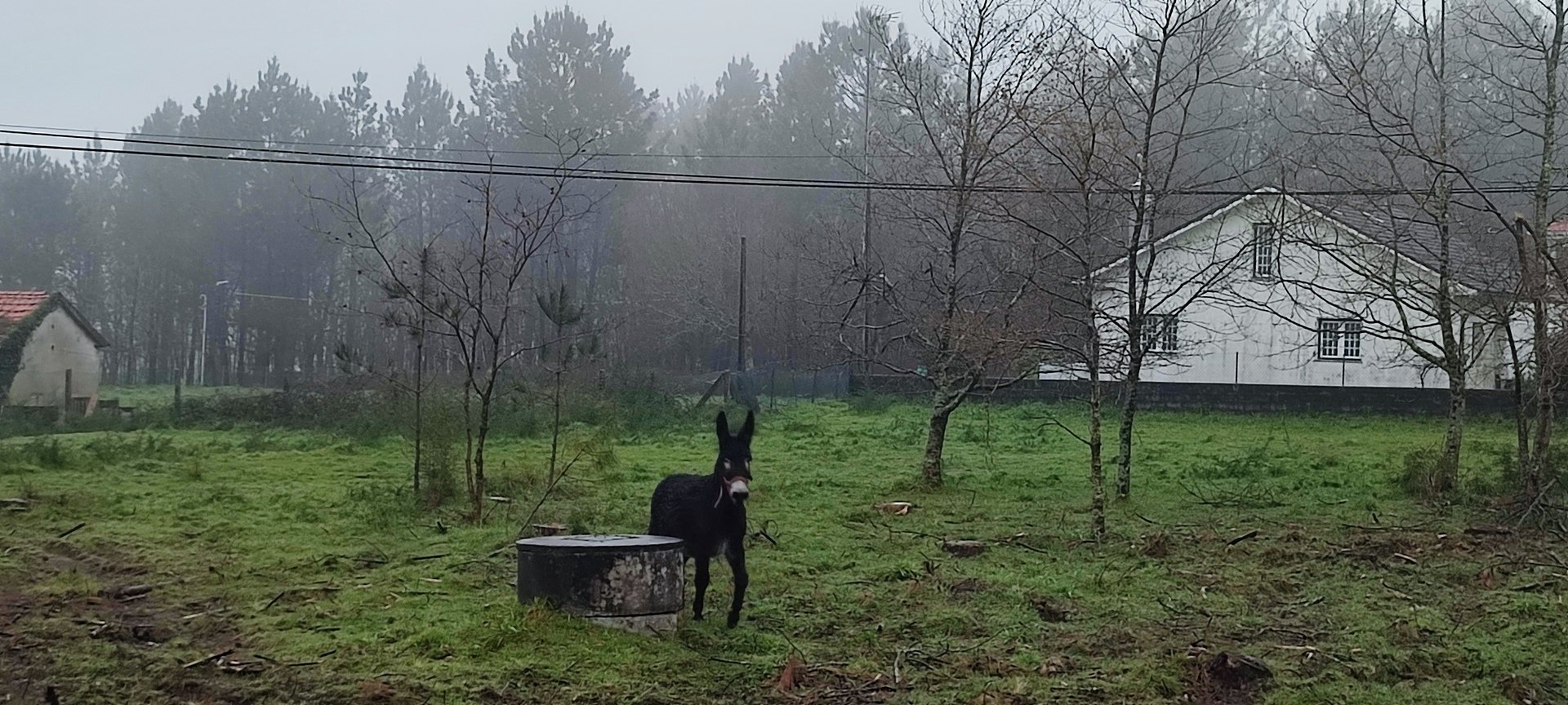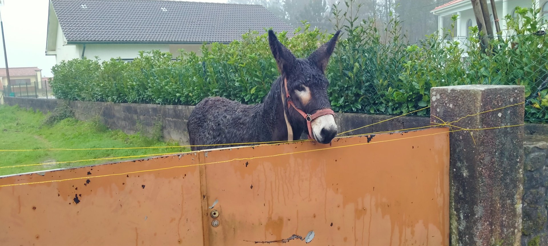 Seguindo em frente e de posse dos nossos estandartes (guarda-chuvas), avistámos uma bela paisagem composta por cedros. Continuando o caminho, fomos "cumprimentados" pelo burrito que estava dentro de uma propriedade e que se aproximou do muro da mesma, onde foi alvo de "festinhas" por alguns componentes do grupo.
