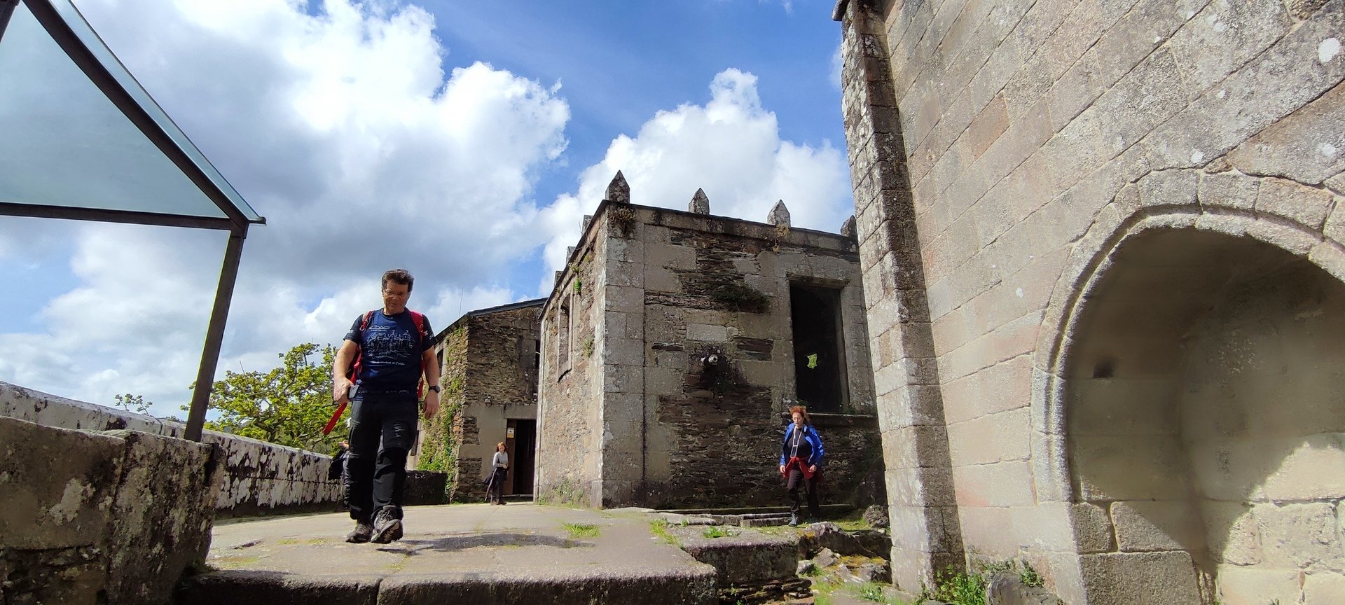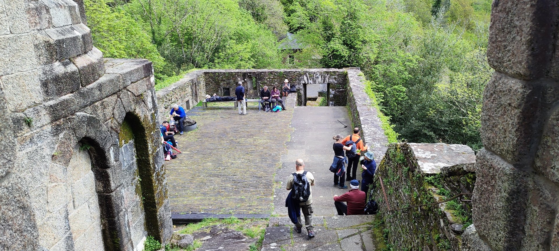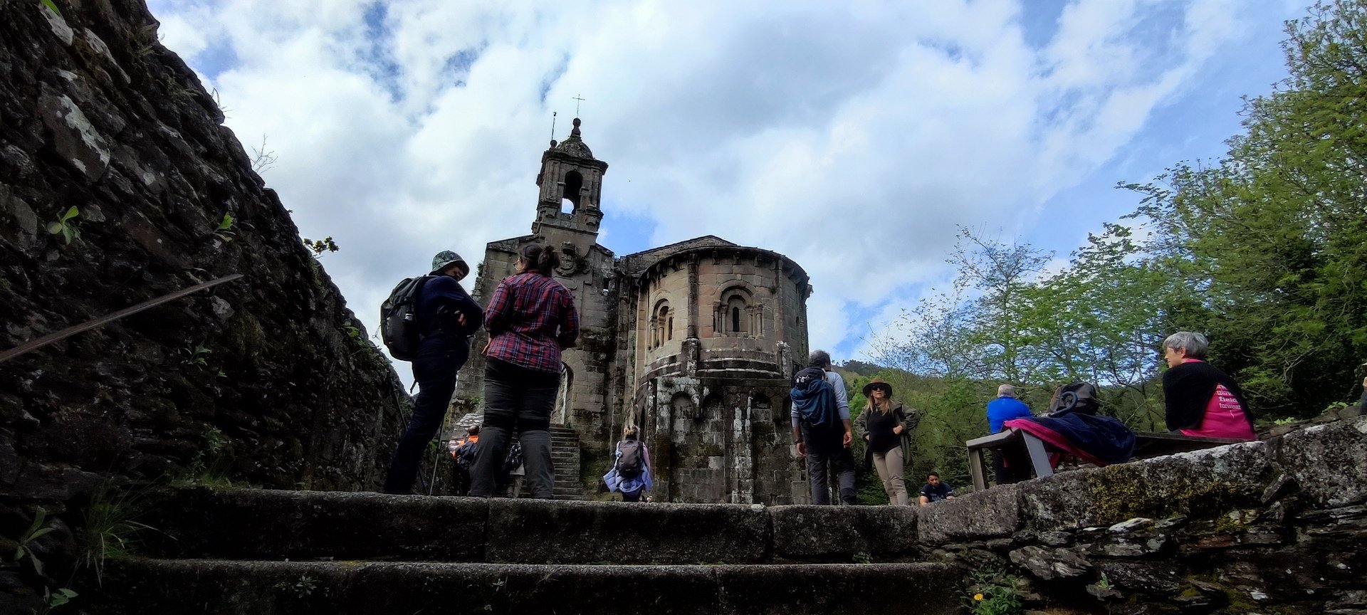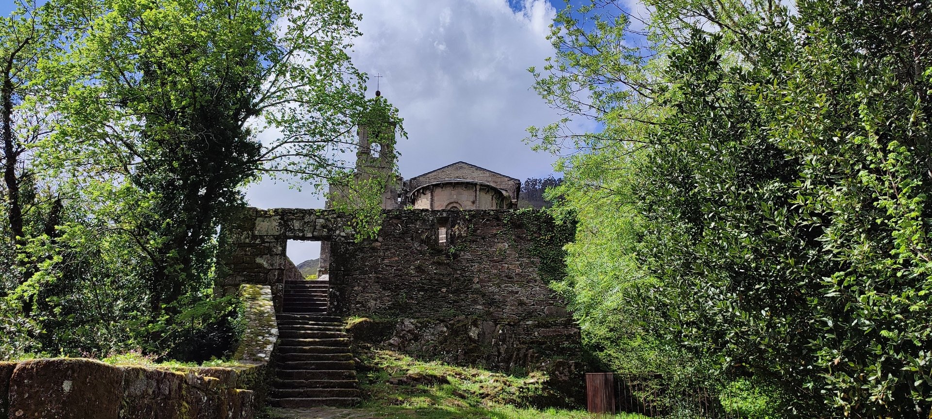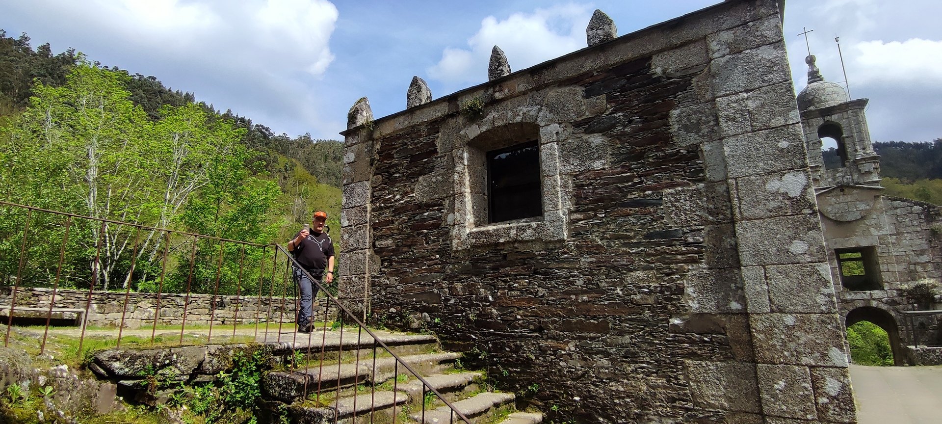 Chegados à ponte de Santa Cristina, fizemos um pequeno desvio até ao Mosteiro de Caaveiro, atualmente recuperado e visitável, onde fizemos uma paragem para almoço e respetiva foto de grupo.