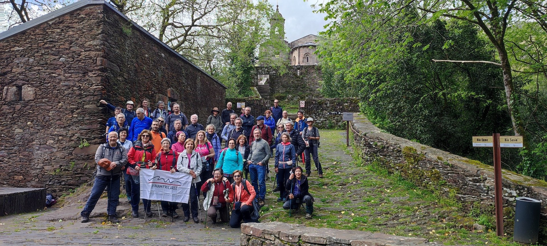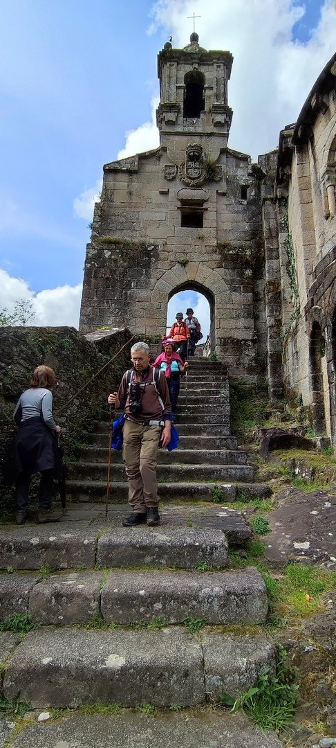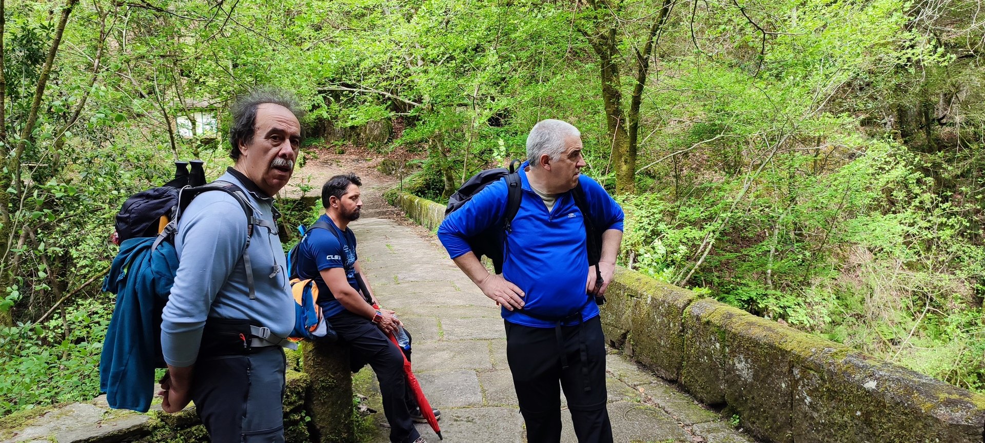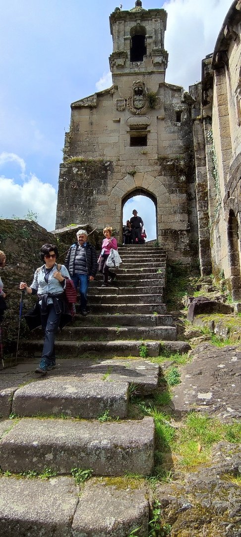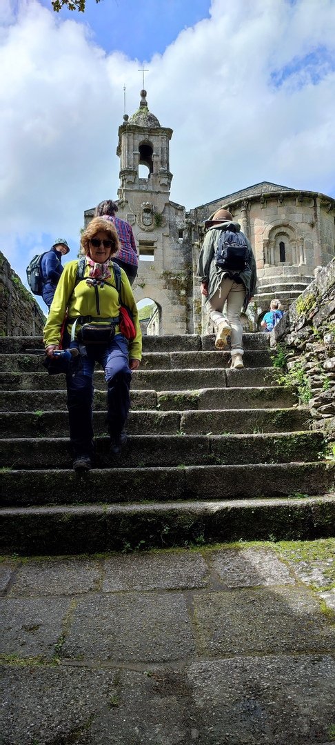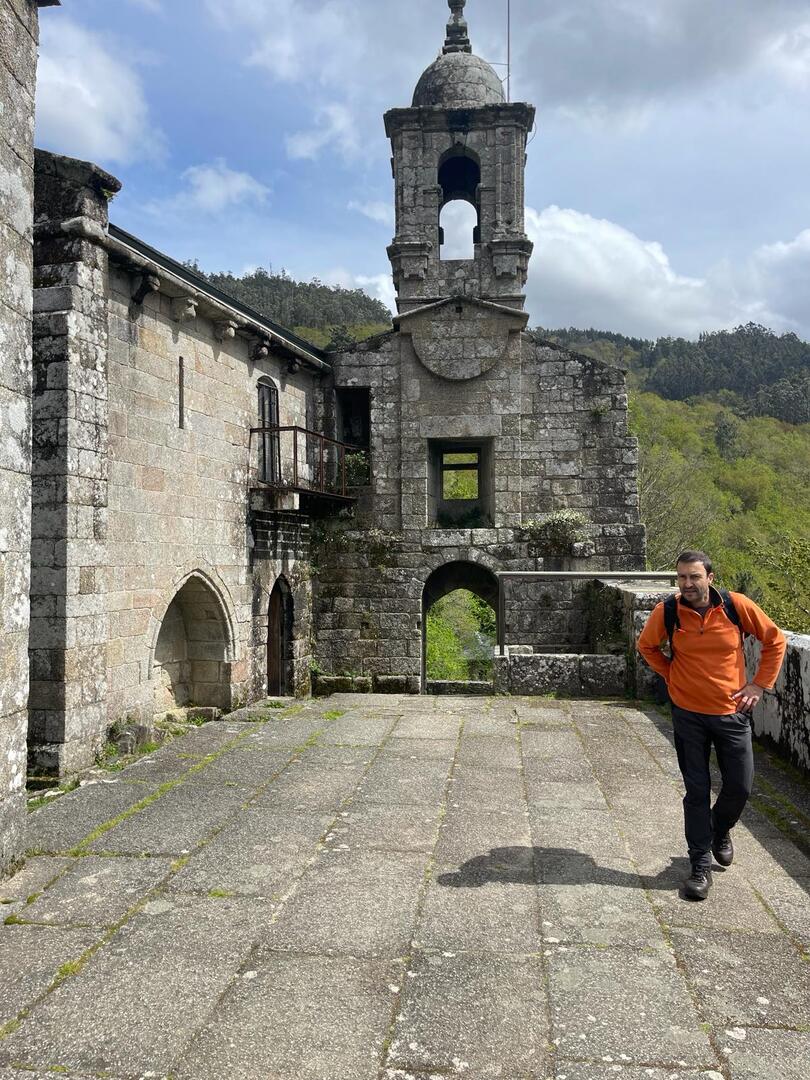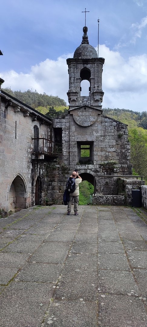 Chegados à ponte de Santa Cristina, fizemos um pequeno desvio até ao Mosteiro de Caaveiro, atualmente recuperado e visitável, onde fizemos uma paragem para almoço e respetiva foto de grupo.