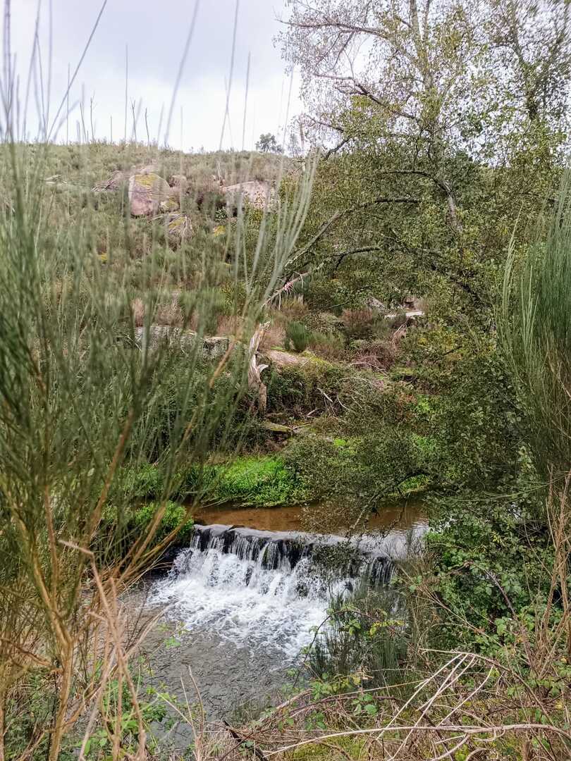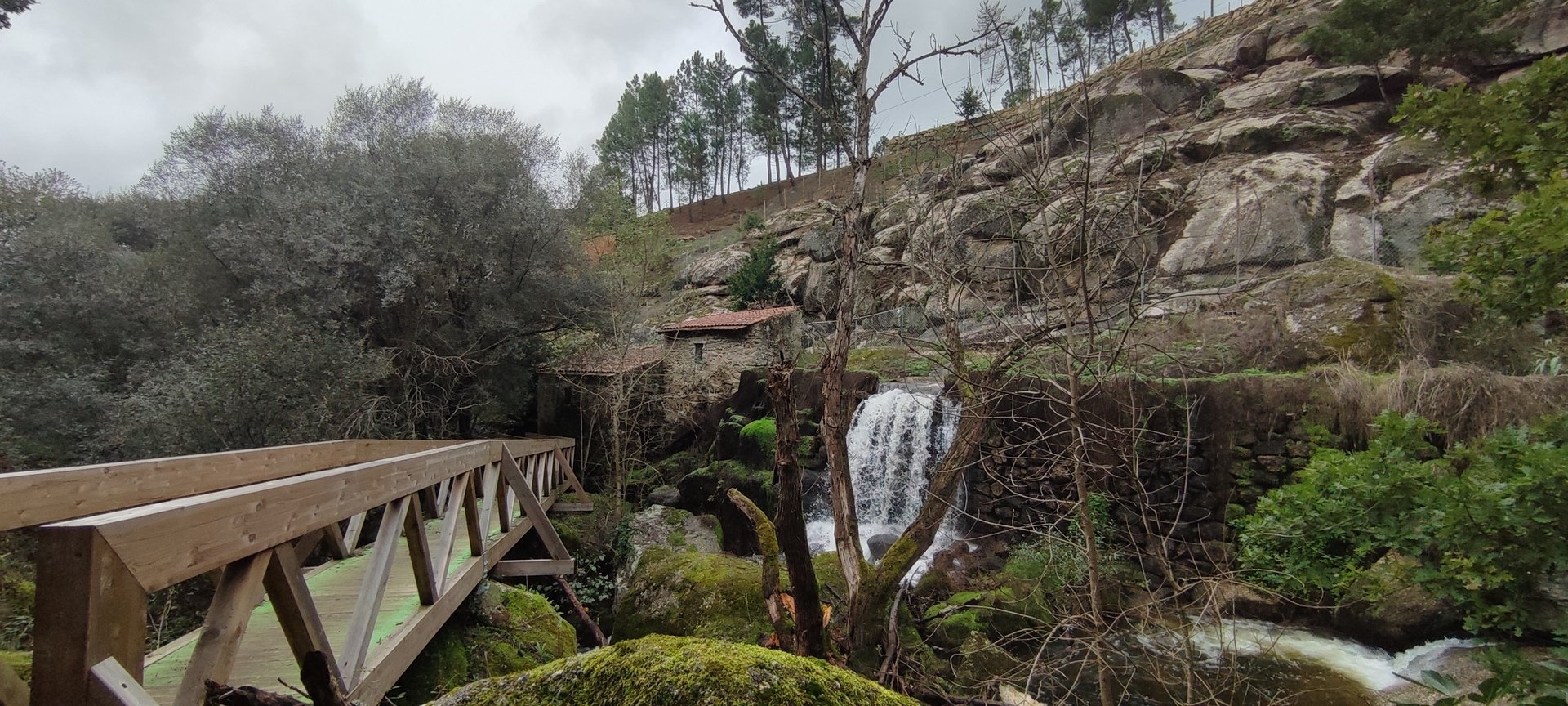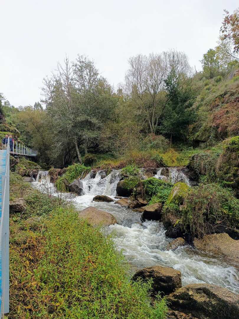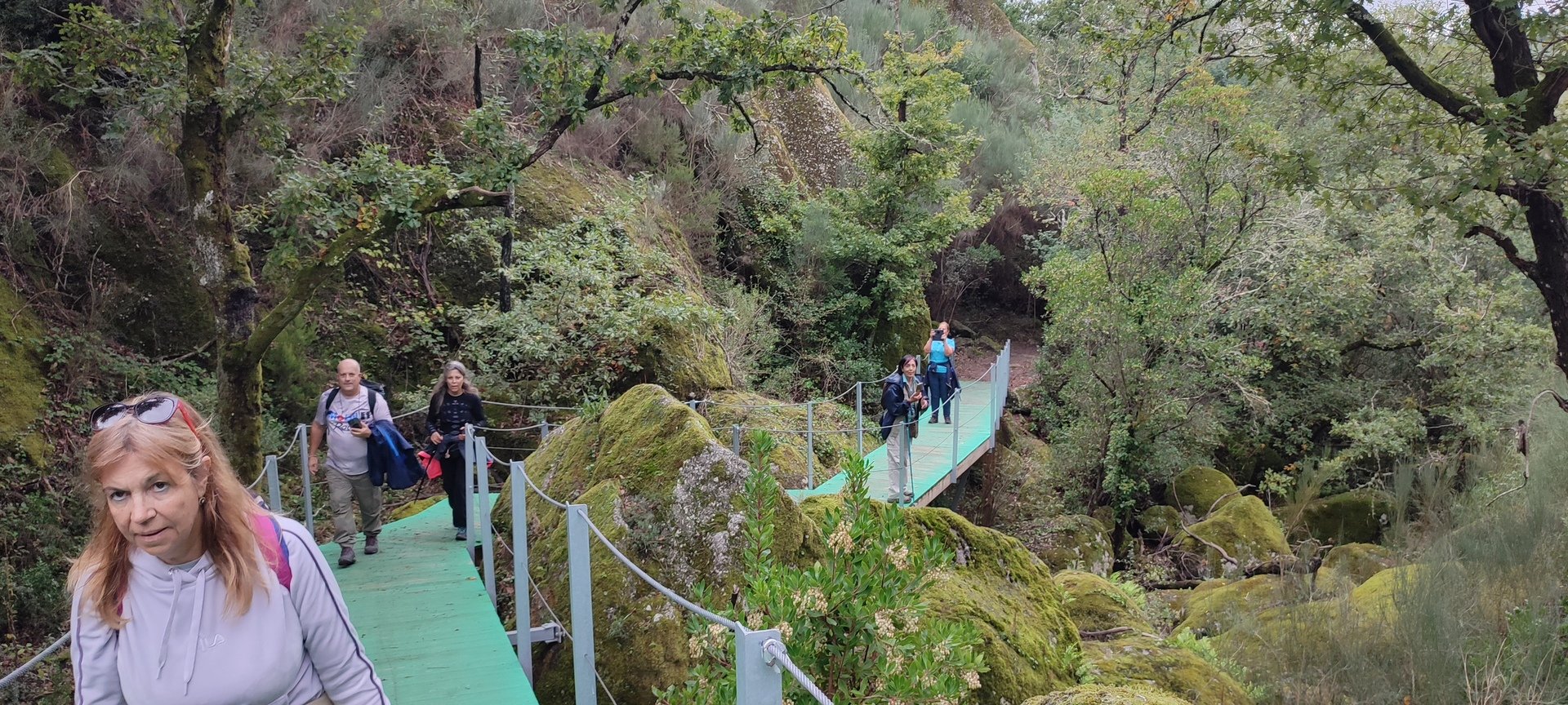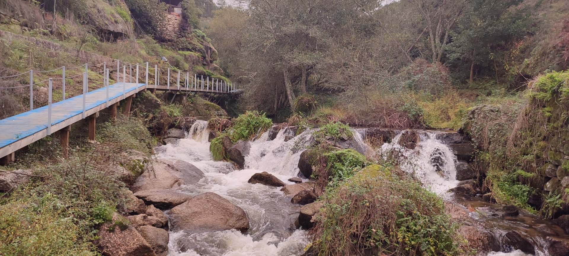 O trilho foi muito agradável pela sua verdura, frescura e paisagem bem como pelas pequenas cascatas e lagoas que se vão formando ao longo do leito do rio de Cavalos, o selvagem afluente do rio Mondego. Chamam-lhe “o rio que se esconde”, pois por vezes desaparece debaixo dos penedos como se estivesse a jogar ao esconde-esconde embora se continue a ouvir o ruido das suas águas. Ao longo do trilho, somos presenteados com os multicoloridos passadiços de madeira construídos apenas em locais de difícil passagem e que alternam, e ainda bem, com muitos caminhos verdadeiramente naturais. Podemos observar vestígios de antigas azenhas que eram alimentadas pela força das águas deste pequeno, mas sinuoso, rio. Continuando a caminhada, chegámos à milenar Ponte Romana de Sumes, construída sobre o Rio de Cavalos, e assente diretamente no afloramento granítico e que funcionou, provavelmente, como elo de ligação da civitas romana da Bobadela (Elbocoris ou Velladis) à civitas de Viseu (Vissaium). Esta ponte está classificada como imóvel de interesse público.