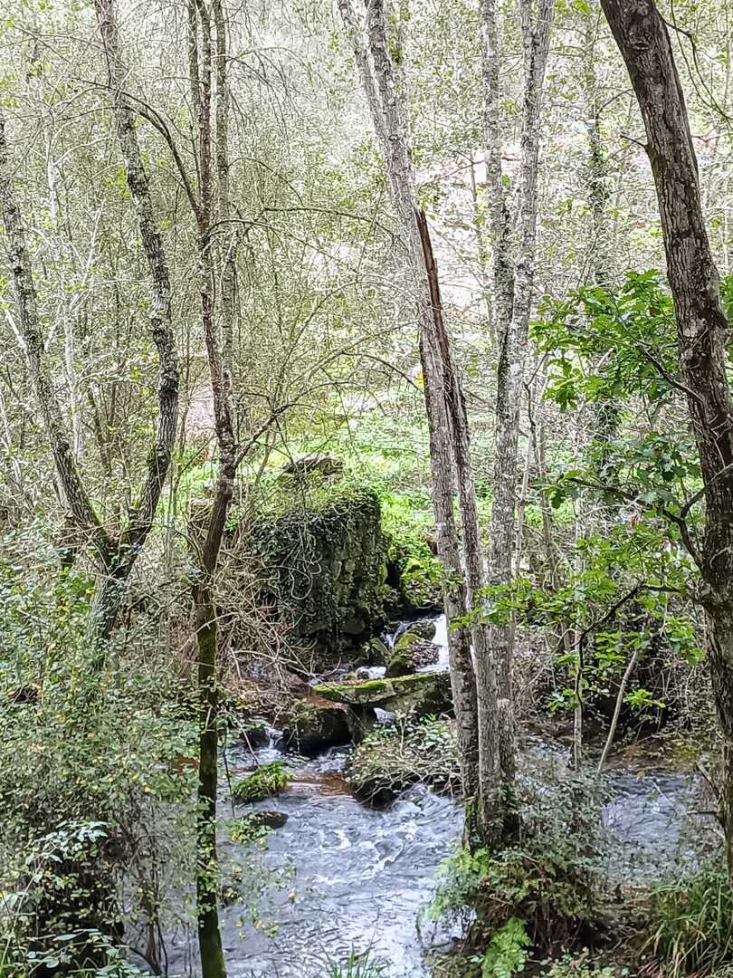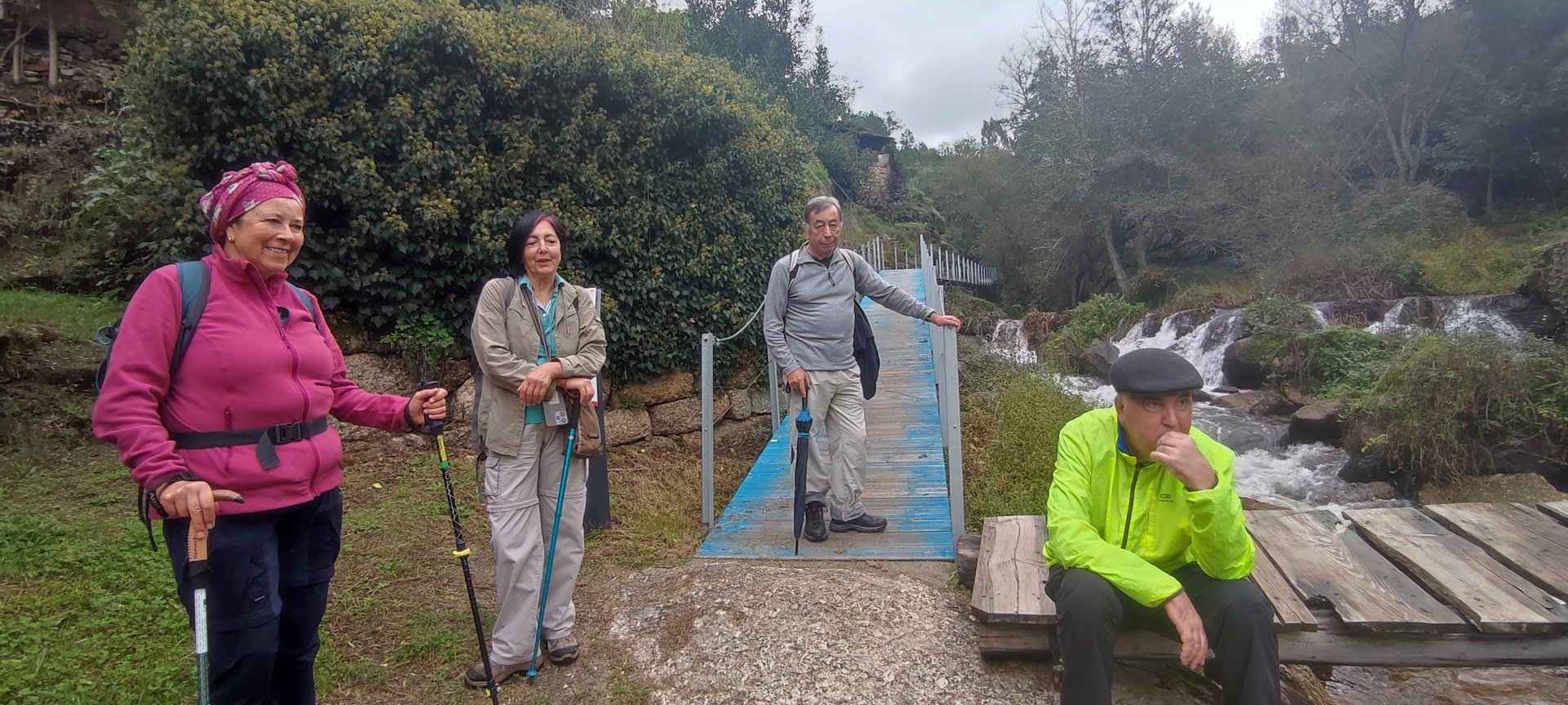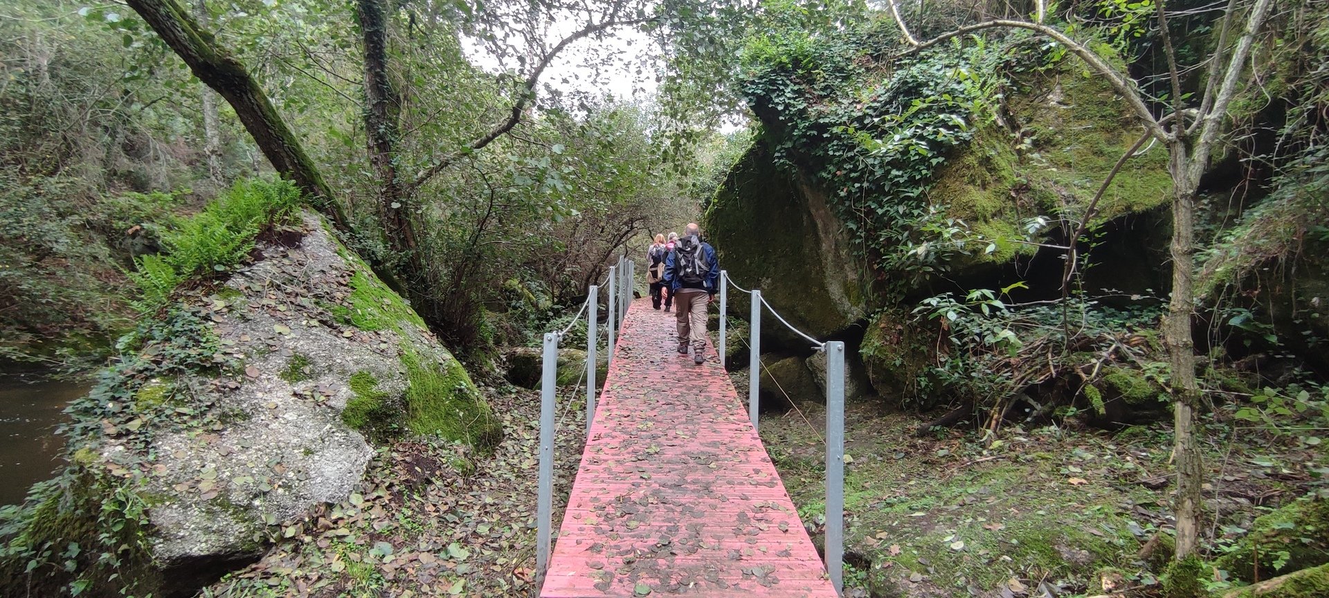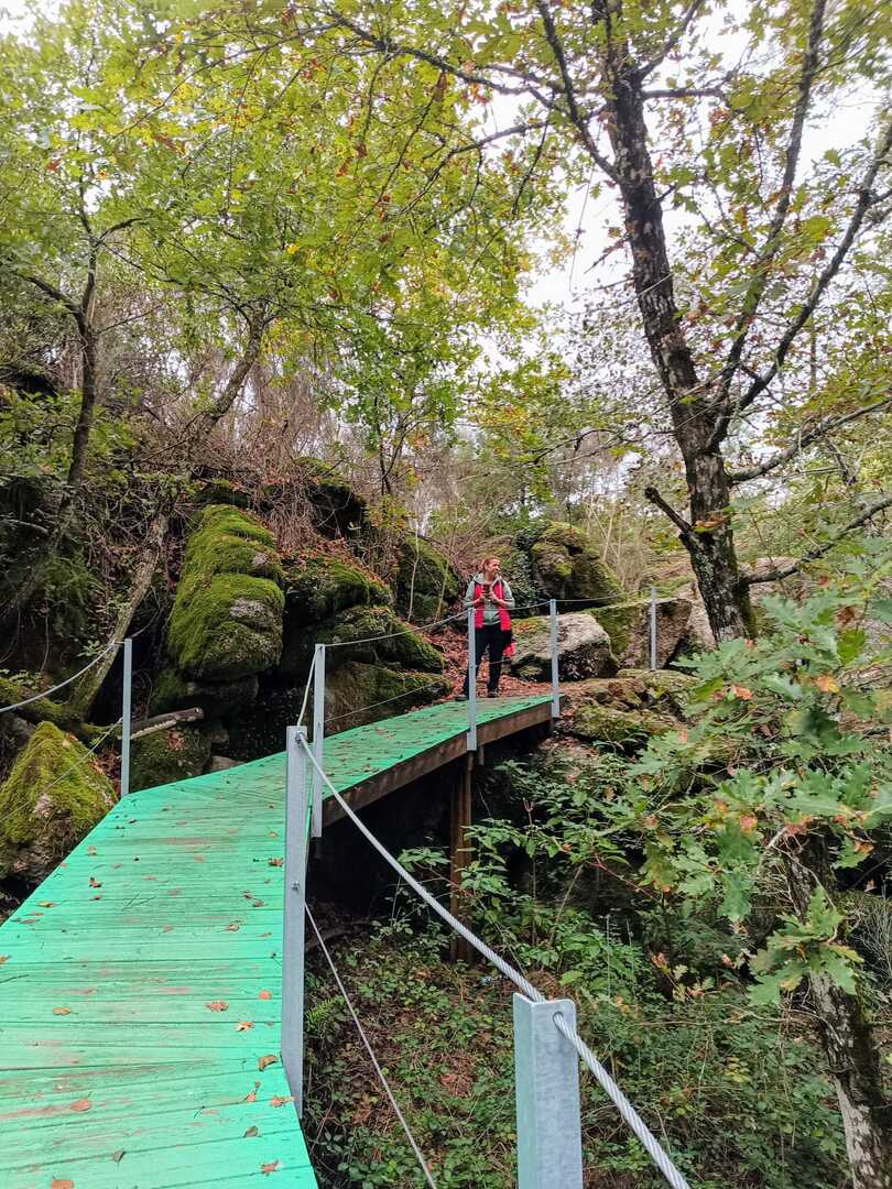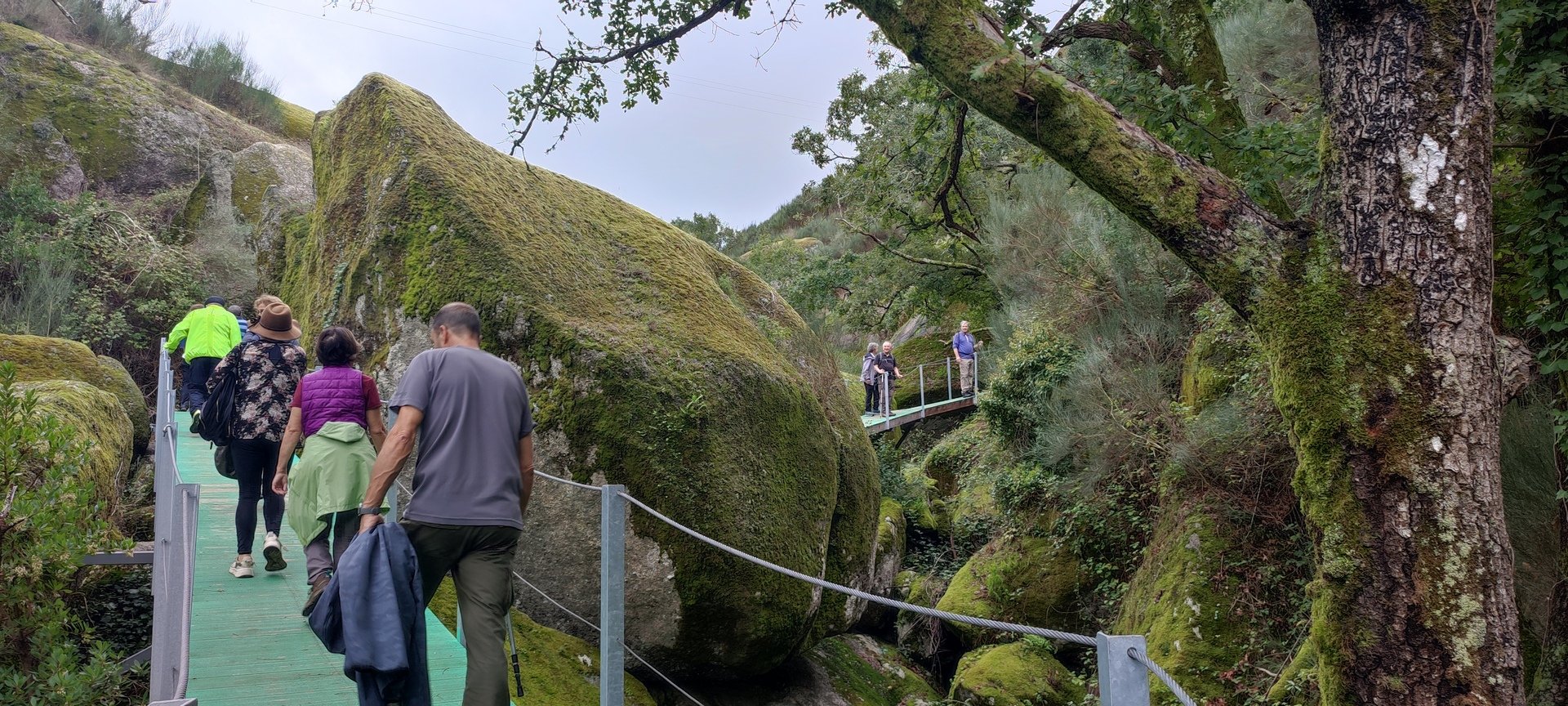 O trilho foi muito agradável pela sua verdura, frescura e paisagem bem como pelas pequenas cascatas e lagoas que se vão formando ao longo do leito do rio de Cavalos, o selvagem afluente do rio Mondego. Chamam-lhe “o rio que se esconde”, pois por vezes desaparece debaixo dos penedos como se estivesse a jogar ao esconde-esconde embora se continue a ouvir o ruido das suas águas. Ao longo do trilho, somos presenteados com os multicoloridos passadiços de madeira construídos apenas em locais de difícil passagem e que alternam, e ainda bem, com muitos caminhos verdadeiramente naturais. Podemos observar vestígios de antigas azenhas que eram alimentadas pela força das águas deste pequeno, mas sinuoso, rio. Continuando a caminhada, chegámos à milenar Ponte Romana de Sumes, construída sobre o Rio de Cavalos, e assente diretamente no afloramento granítico e que funcionou, provavelmente, como elo de ligação da civitas romana da Bobadela (Elbocoris ou Velladis) à civitas de Viseu (Vissaium). Esta ponte está classificada como imóvel de interesse público.