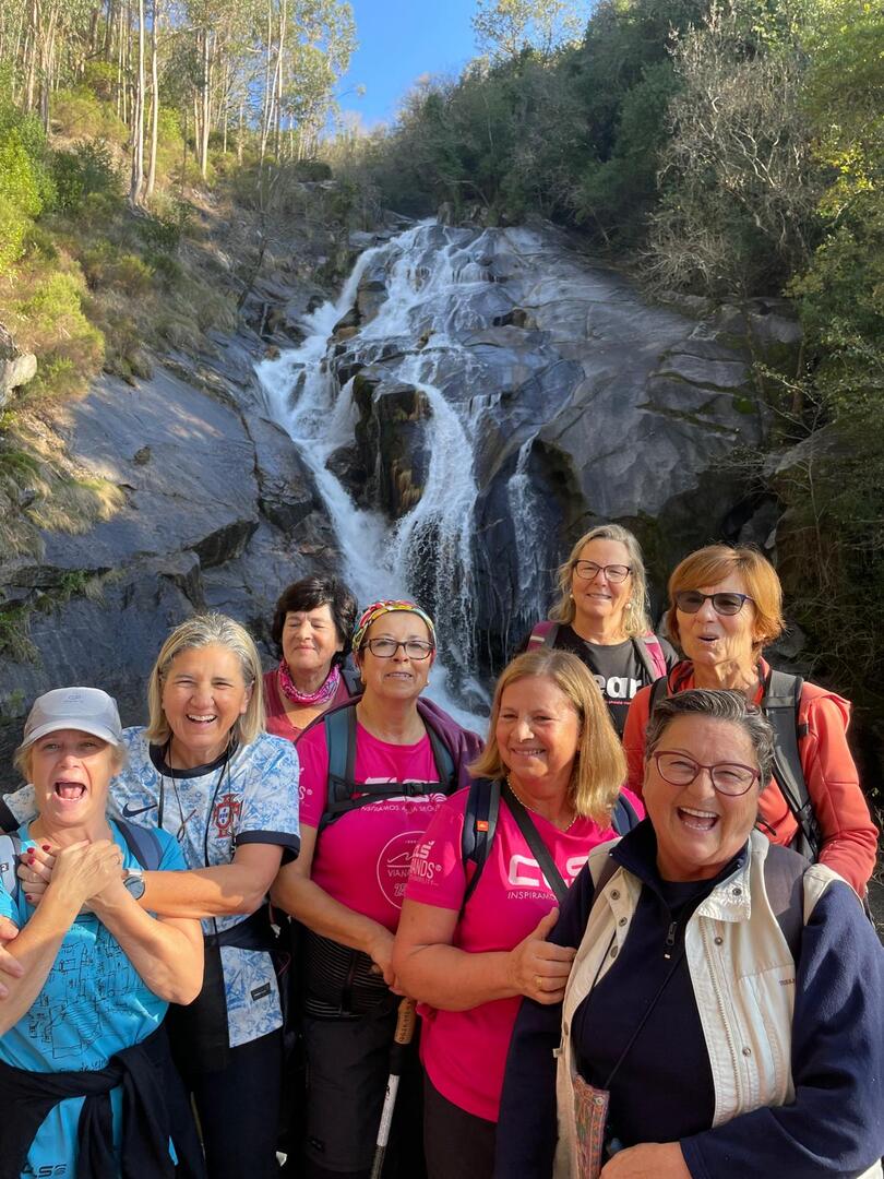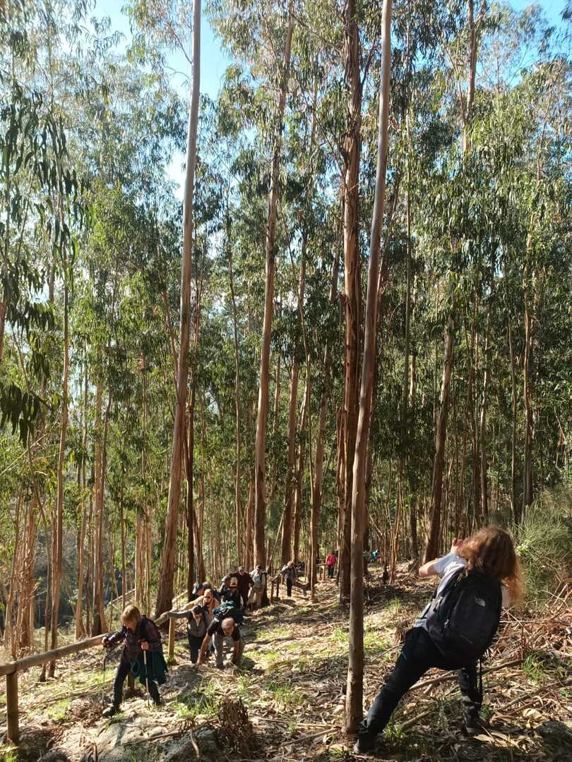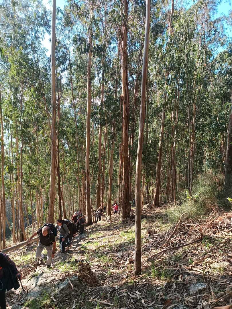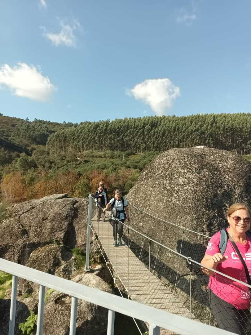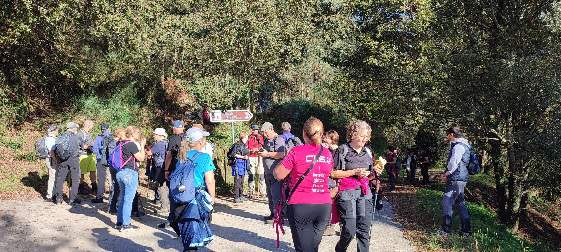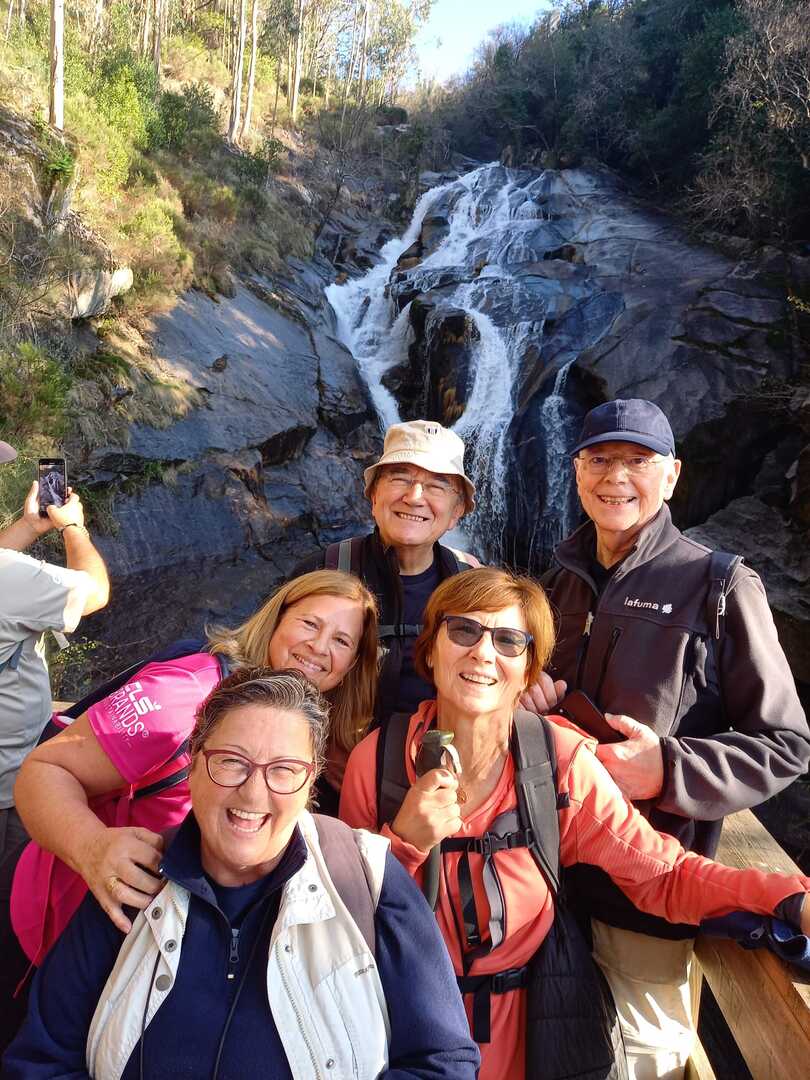 Iniciado o percurso lá fomos ao encontro dos passadiços e cascatas do pequeno Rio Cabrão que logo nos foi presenteando com bonitos recantos e sucessivas quedas de água, parando de quando em vez para obtenção de registos fotográficos. Atingido o final dos passadiços local com um extraordinário miradouro onde cada um pode admirar a bela cascata, logo começamos a abandonar o rio, continuando a subir através de um ingreme carreiro devidamente protegido e que bastante nos auxiliou. Mais acima chegamos a um caminho florestal, por onde caminhamos um pouco no sentido inverso, na busca de um desvio que se tornou um pouco difícil de encontrar. Sempre embrenhados na floresta continuando subindo através de um estreito, mas bonito carreiro, atingimos o lugar de Vaqueira, onde houve um pouco de tempo para se falar com alguns naturais e fazer um ligeiro reabastecimento. A vista para Norte era bonita com a encosta da serra semeada de pequenos aglomerados de habitações, para poente oportunidade para divisar o lugar de Vacariça já várias vezes por nós visitado. Continuamos novamente subindo embrenhados na floresta até se atingir o ponto mais elevado do nosso percurso na denominada “Poça do Couto”, belo local muito procurado para início de várias atividades. Na altura outro grupo de caminheiros abandonava as viaturas iniciando o seu percurso em direção de Miranda. O nosso caminho era penetrar agora através da mata da “floresta encantada”, pisando o grosso tapete das folhas caídas, nesta altura do ano um pouco despida, mas que nem por isso deixa de ter grande beleza. Aqui encontramos a companheira Isabel Sequeiros que integrada numa organização da Câmara de Arcos de Valdevez andava na recolha de cogumelos.