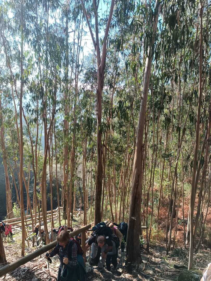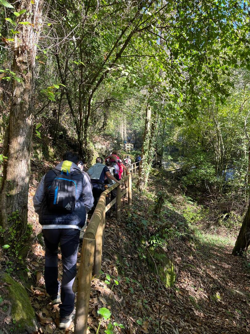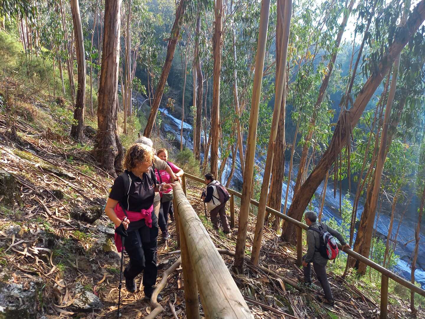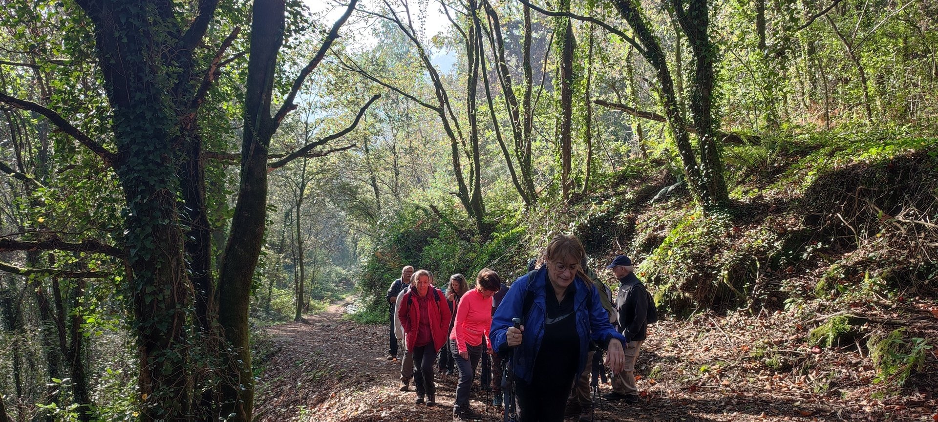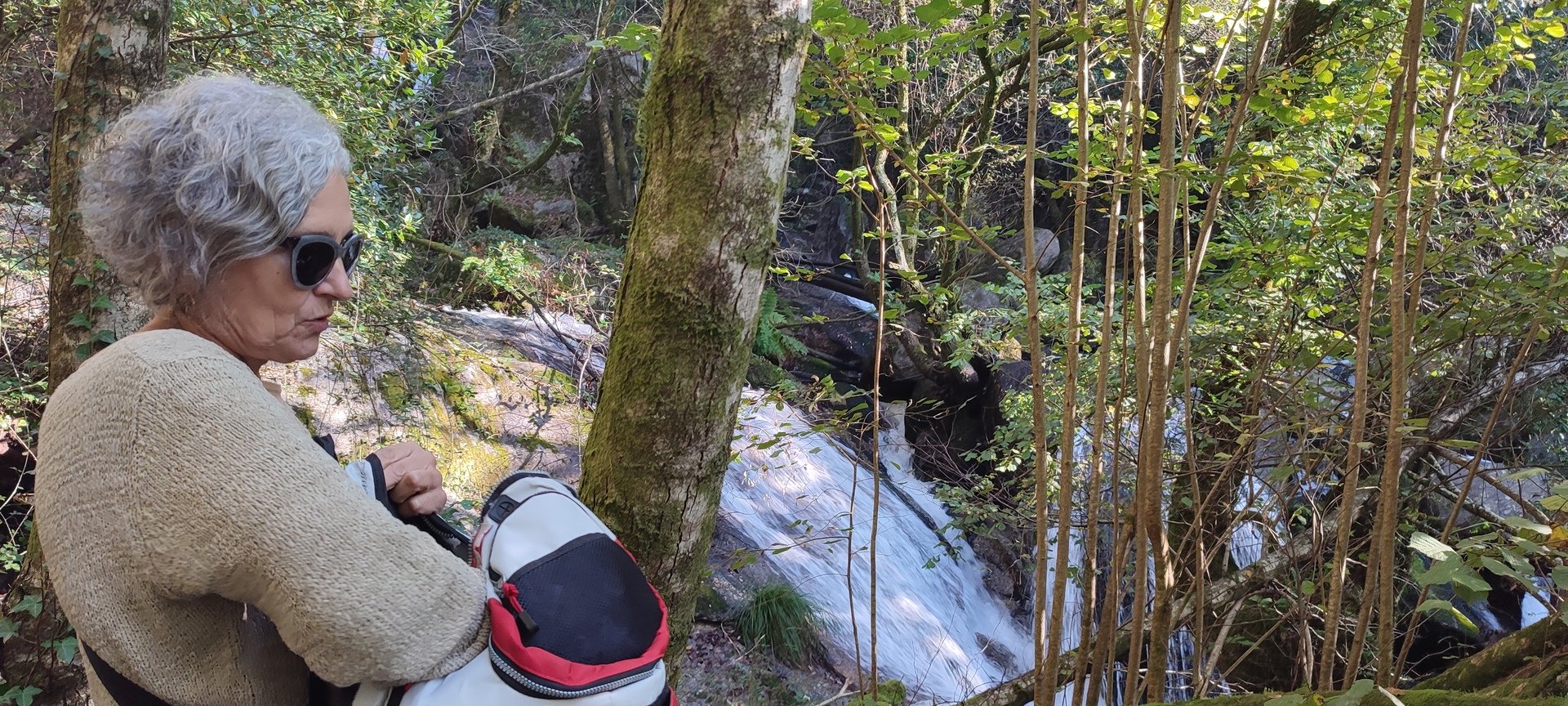 Iniciado o percurso lá fomos ao encontro dos passadiços e cascatas do pequeno Rio Cabrão que logo nos foi presenteando com bonitos recantos e sucessivas quedas de água, parando de quando em vez para obtenção de registos fotográficos. Atingido o final dos passadiços local com um extraordinário miradouro onde cada um pode admirar a bela cascata, logo começamos a abandonar o rio, continuando a subir através de um ingreme carreiro devidamente protegido e que bastante nos auxiliou. Mais acima chegamos a um caminho florestal, por onde caminhamos um pouco no sentido inverso, na busca de um desvio que se tornou um pouco difícil de encontrar. Sempre embrenhados na floresta continuando subindo através de um estreito, mas bonito carreiro, atingimos o lugar de Vaqueira, onde houve um pouco de tempo para se falar com alguns naturais e fazer um ligeiro reabastecimento. A vista para Norte era bonita com a encosta da serra semeada de pequenos aglomerados de habitações, para poente oportunidade para divisar o lugar de Vacariça já várias vezes por nós visitado. Continuamos novamente subindo embrenhados na floresta até se atingir o ponto mais elevado do nosso percurso na denominada “Poça do Couto”, belo local muito procurado para início de várias atividades. Na altura outro grupo de caminheiros abandonava as viaturas iniciando o seu percurso em direção de Miranda. O nosso caminho era penetrar agora através da mata da “floresta encantada”, pisando o grosso tapete das folhas caídas, nesta altura do ano um pouco despida, mas que nem por isso deixa de ter grande beleza. Aqui encontramos a companheira Isabel Sequeiros que integrada numa organização da Câmara de Arcos de Valdevez andava na recolha de cogumelos.