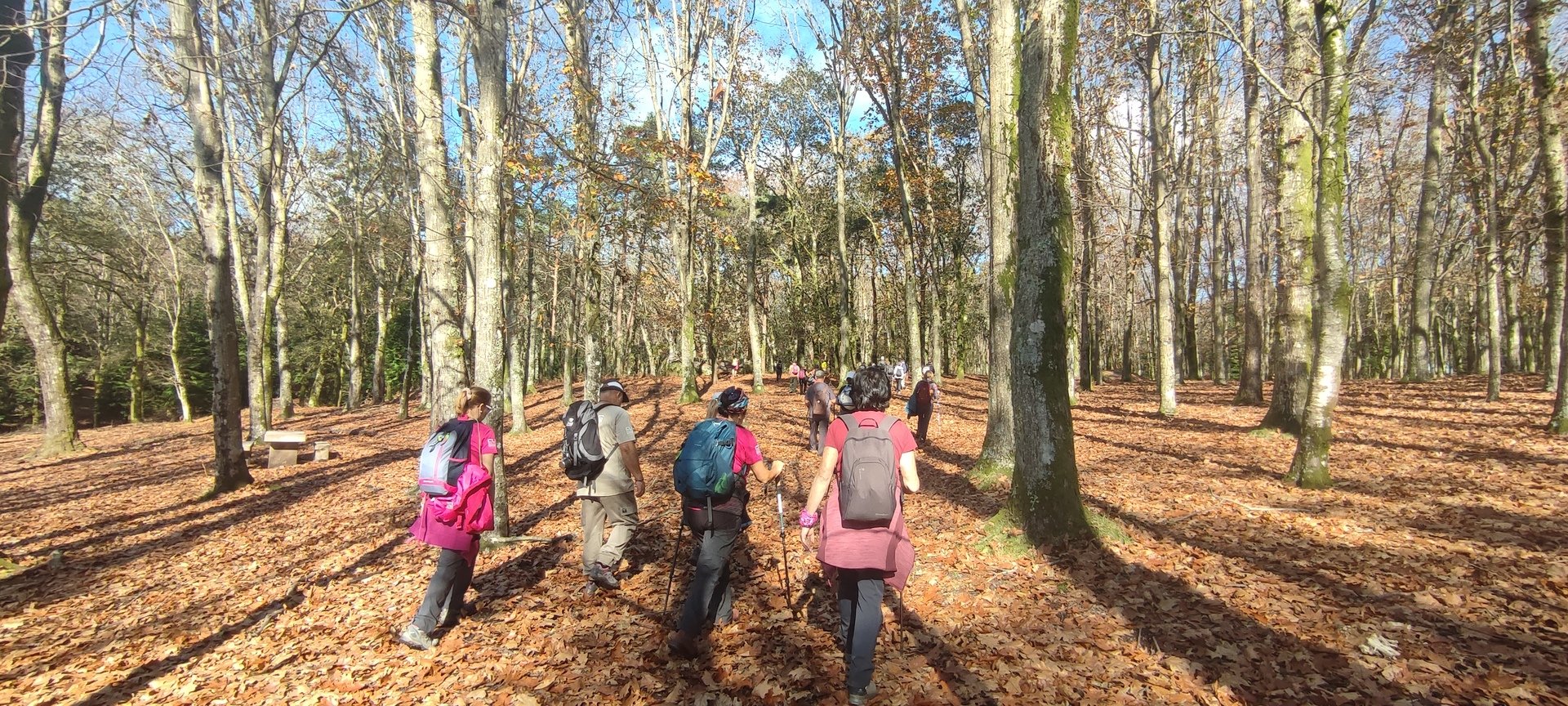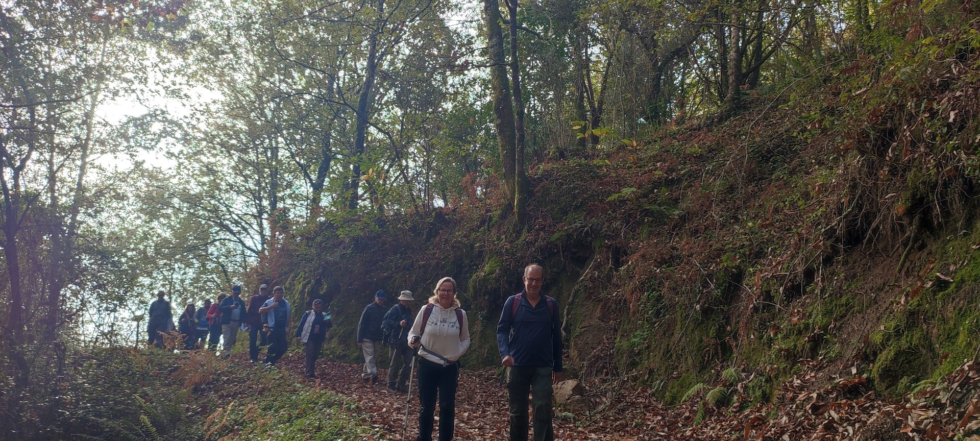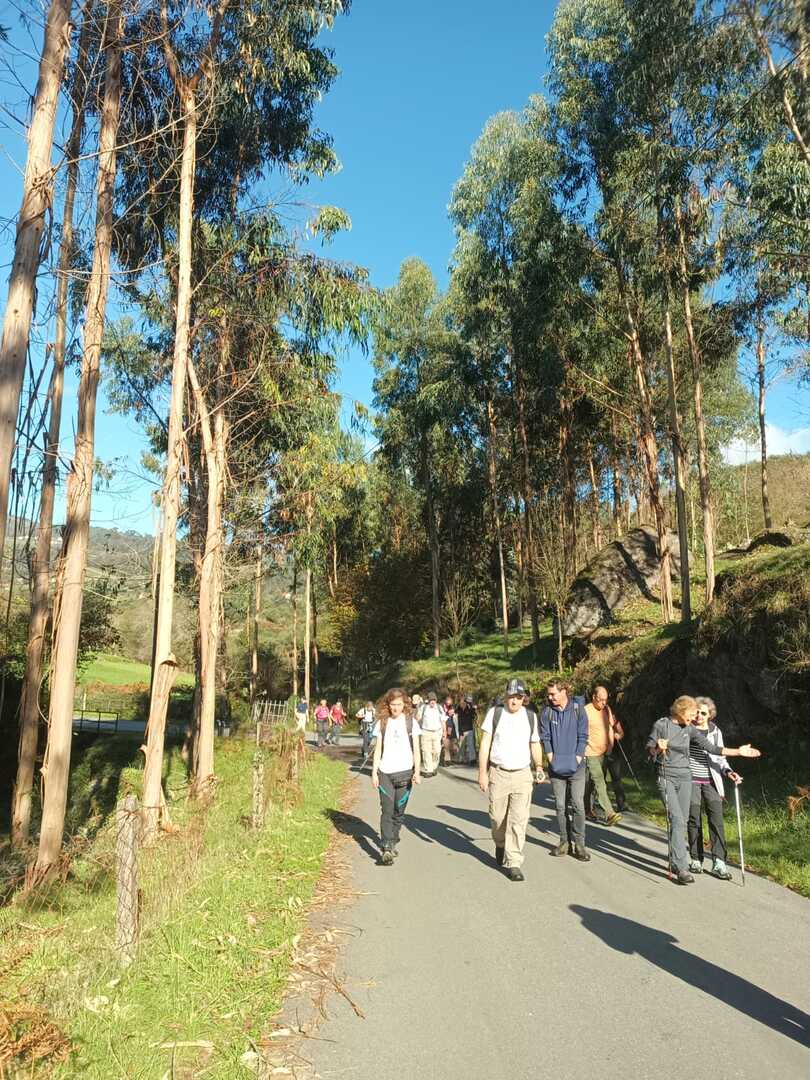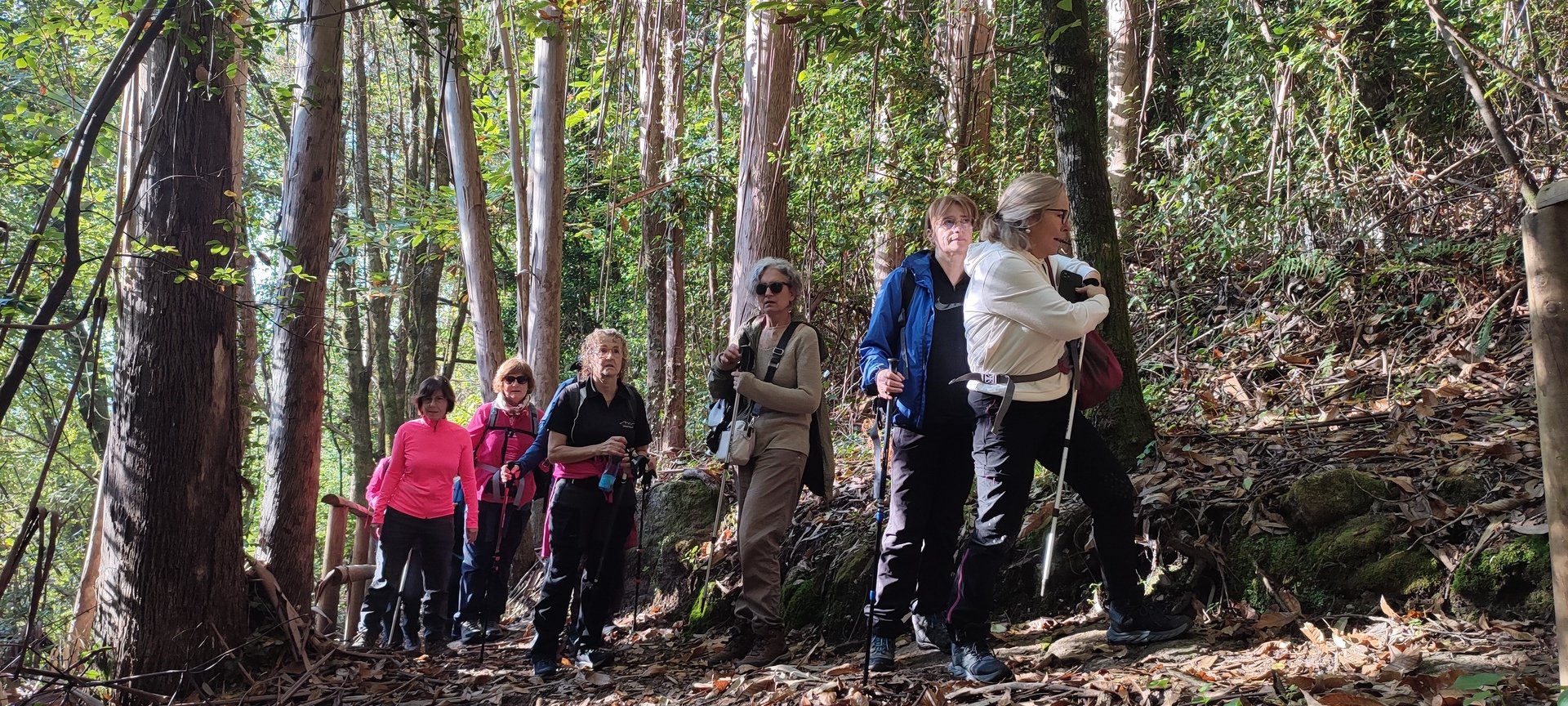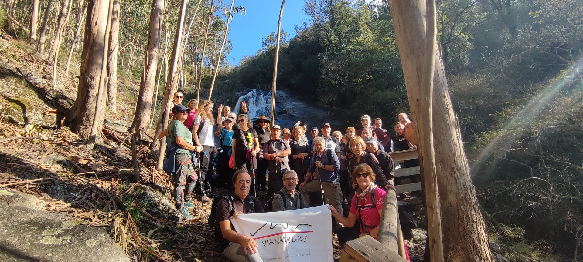 Iniciado o percurso lá fomos ao encontro dos passadiços e cascatas do pequeno Rio Cabrão que logo nos foi presenteando com bonitos recantos e sucessivas quedas de água, parando de quando em vez para obtenção de registos fotográficos. Atingido o final dos passadiços local com um extraordinário miradouro onde cada um pode admirar a bela cascata, logo começamos a abandonar o rio, continuando a subir através de um ingreme carreiro devidamente protegido e que bastante nos auxiliou. Mais acima chegamos a um caminho florestal, por onde caminhamos um pouco no sentido inverso, na busca de um desvio que se tornou um pouco difícil de encontrar. Sempre embrenhados na floresta continuando subindo através de um estreito, mas bonito carreiro, atingimos o lugar de Vaqueira, onde houve um pouco de tempo para se falar com alguns naturais e fazer um ligeiro reabastecimento. A vista para Norte era bonita com a encosta da serra semeada de pequenos aglomerados de habitações, para poente oportunidade para divisar o lugar de Vacariça já várias vezes por nós visitado. Continuamos novamente subindo embrenhados na floresta até se atingir o ponto mais elevado do nosso percurso na denominada “Poça do Couto”, belo local muito procurado para início de várias atividades. Na altura outro grupo de caminheiros abandonava as viaturas iniciando o seu percurso em direção de Miranda. O nosso caminho era penetrar agora através da mata da “floresta encantada”, pisando o grosso tapete das folhas caídas, nesta altura do ano um pouco despida, mas que nem por isso deixa de ter grande beleza. Aqui encontramos a companheira Isabel Sequeiros que integrada numa organização da Câmara de Arcos de Valdevez andava na recolha de cogumelos.